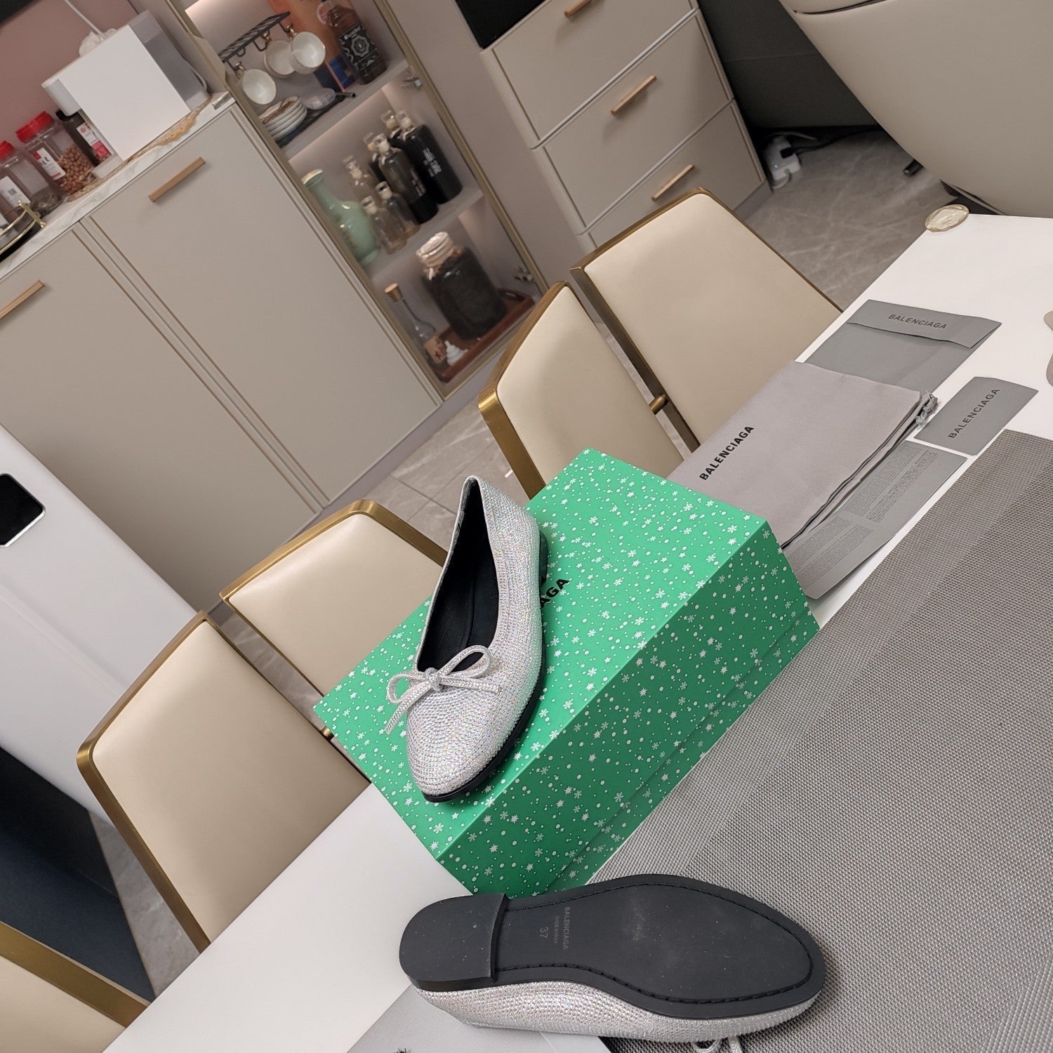 RHINESTONE BALLET FLATS WITH BOW IN METALLIC SILVER SHEEPSKIN