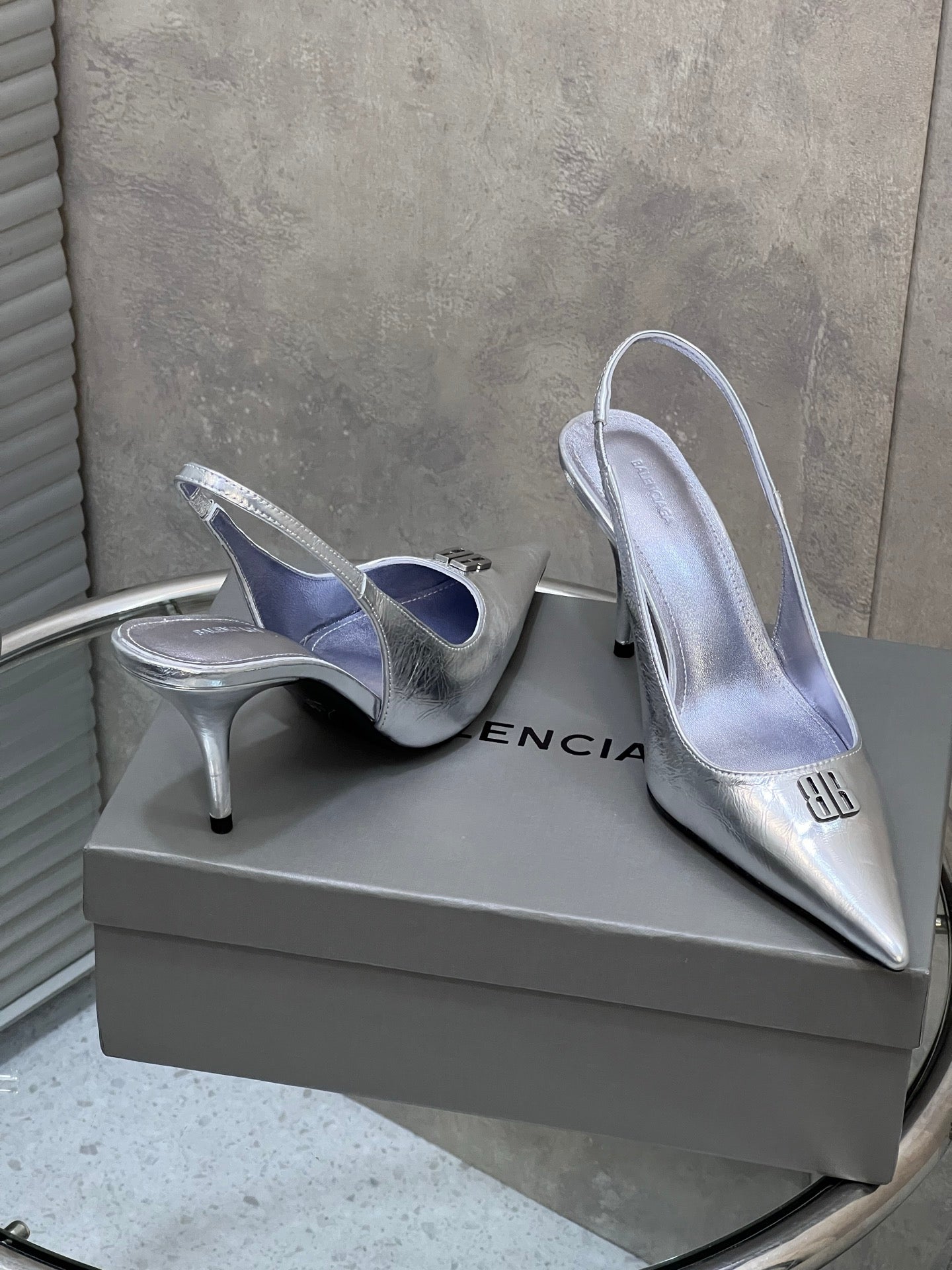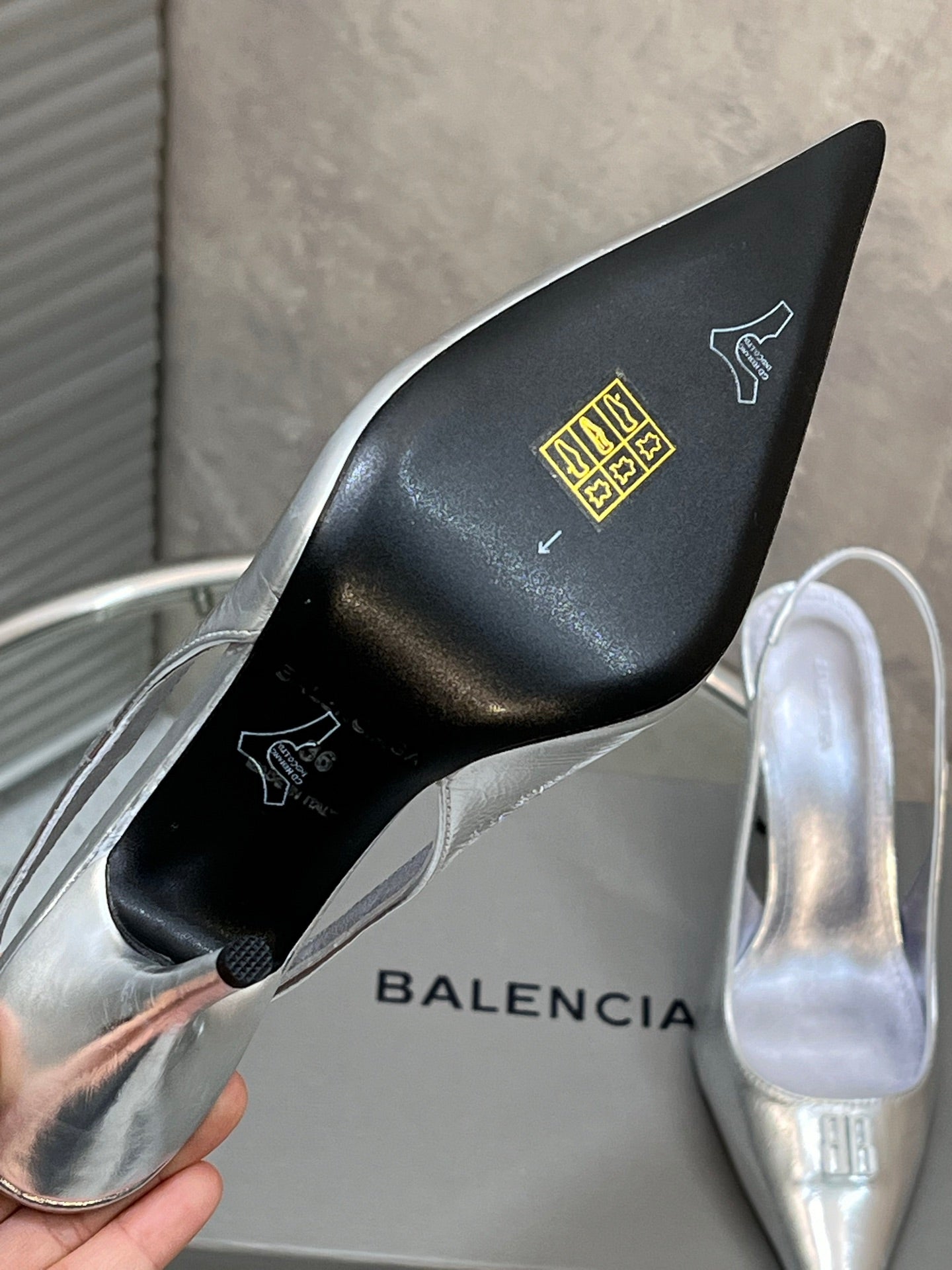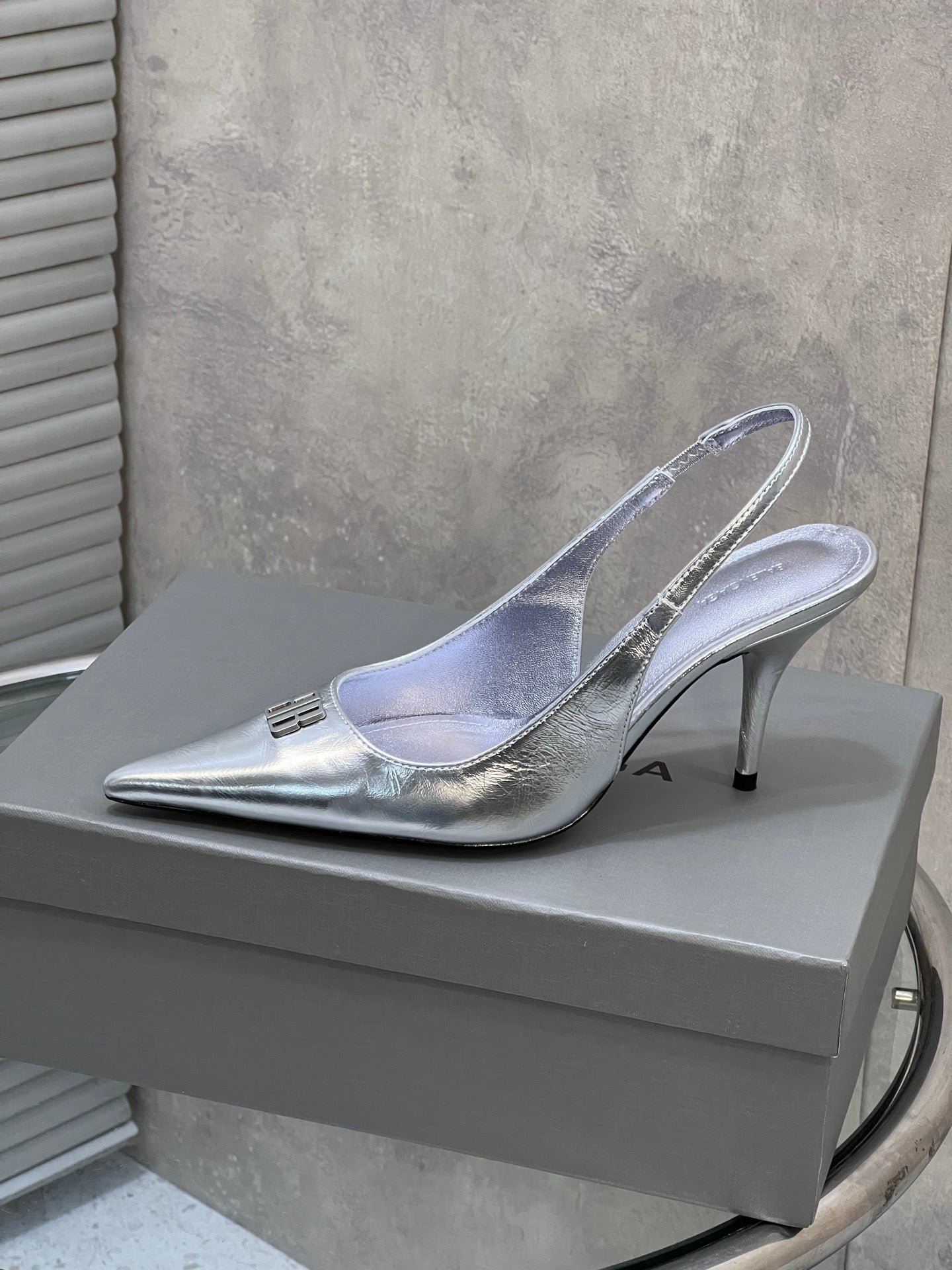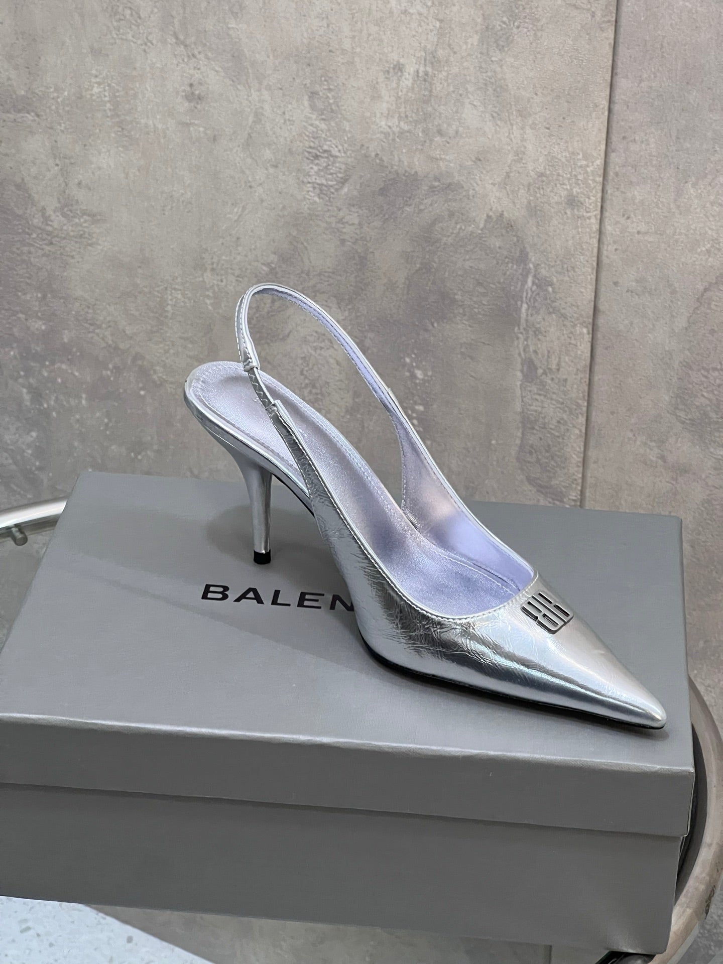 BALENCIAGA 25S HIGH-HEEL SLINGBACK 85 MM IN SILVER COW LEATHER