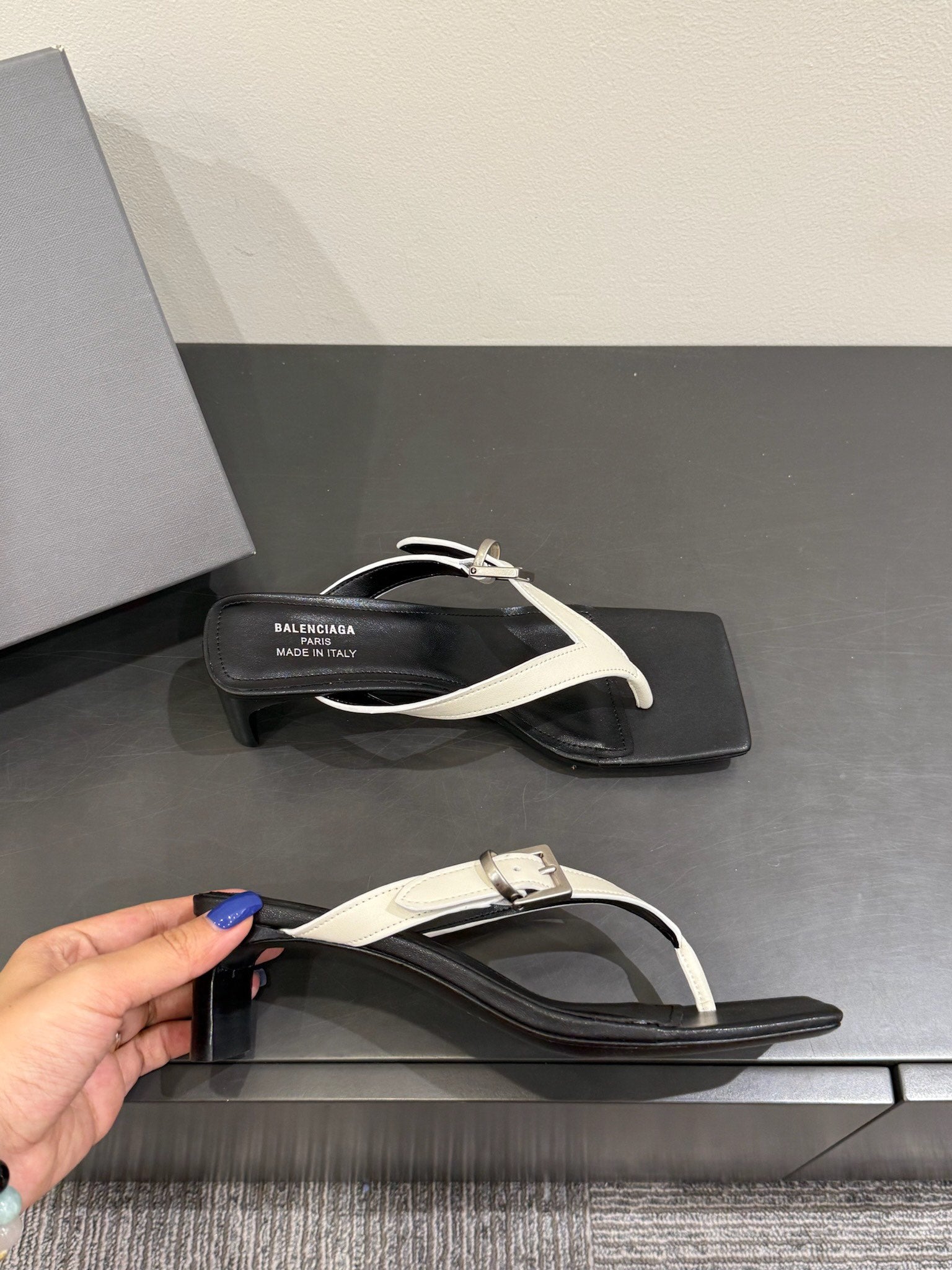 BALENCIAGA 25S HIGH-HEELED FLIP-FLOPS IN WHITE MIX BLACK CALFSKIN WITH SILVER HARDWARE