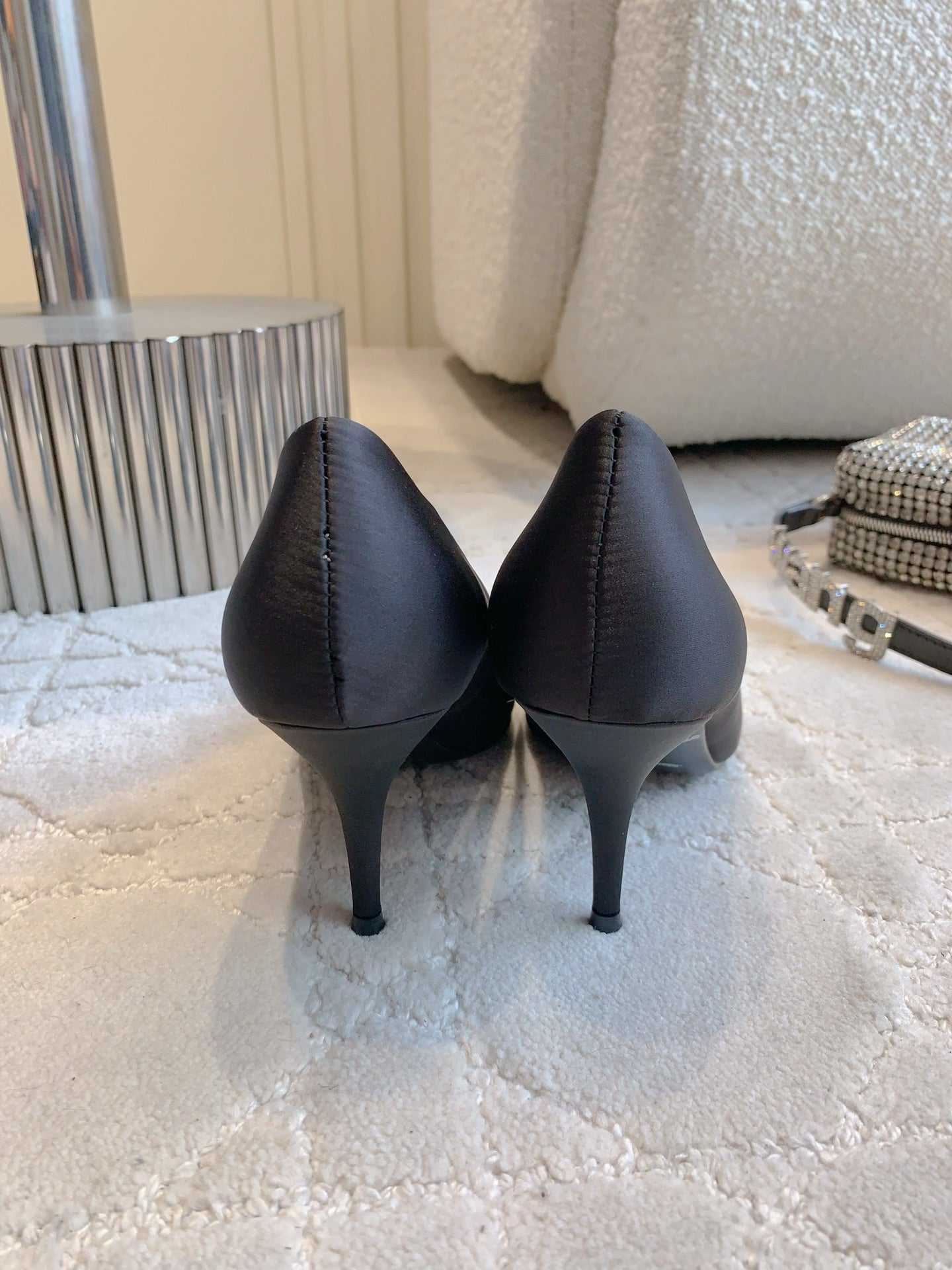 BALENCIAGA 25S POINTED-TOE HIGH HEELS 70 MM IN BLACK SATIN WITH GOLD HARDWARE