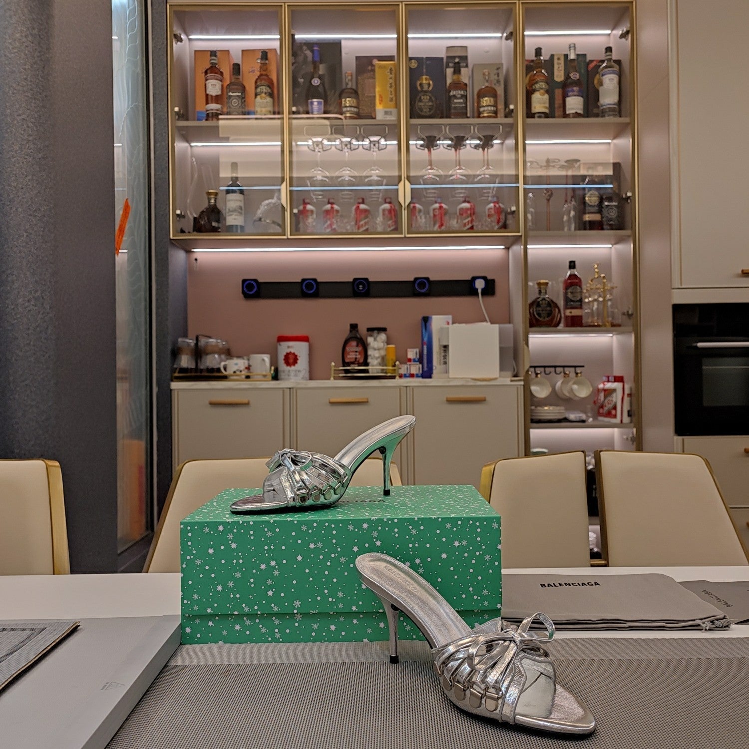 BOW-EMBELLISHED HIGH MULES IN SILVER METALLIC SHEEPSKIN