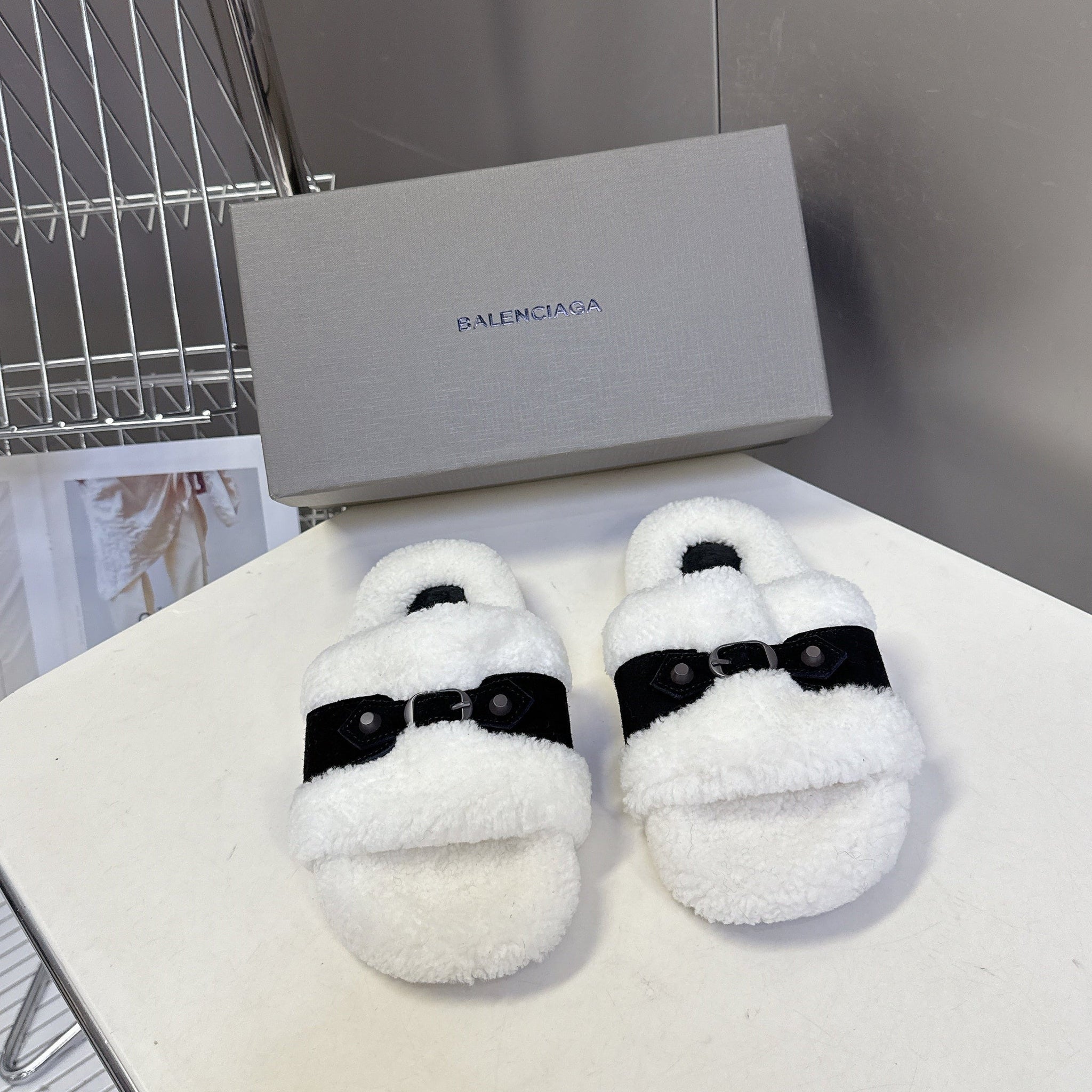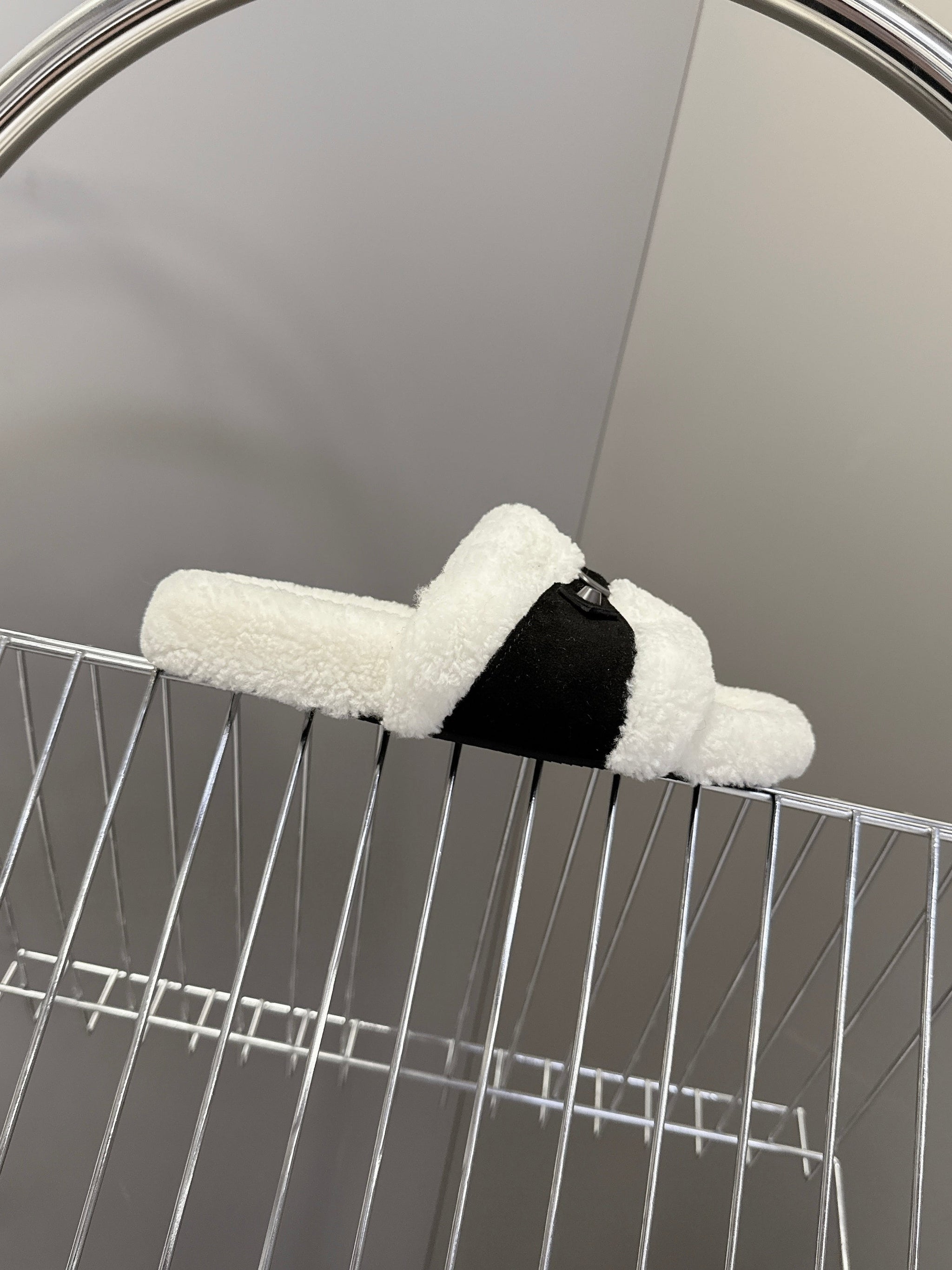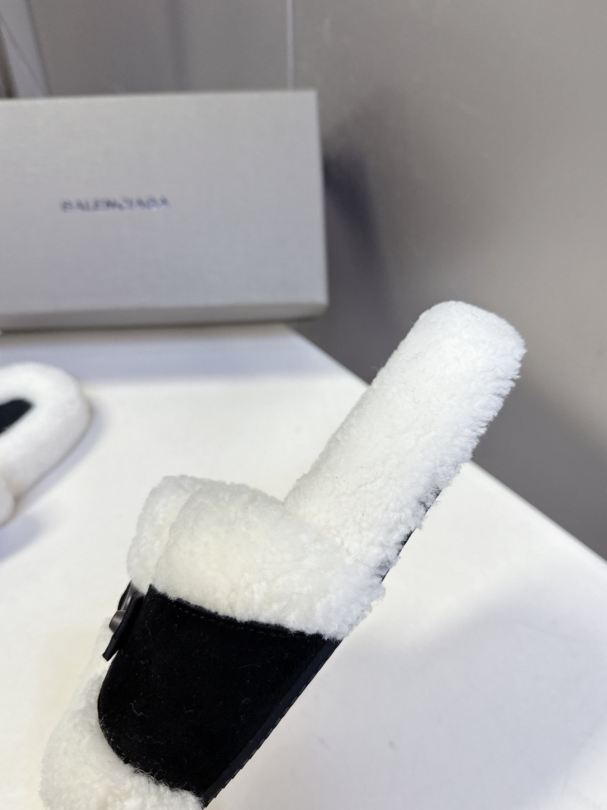 BALENCIAGA 25S SLIPPERS IN BLACK SUEDE AND WHITE WOOL