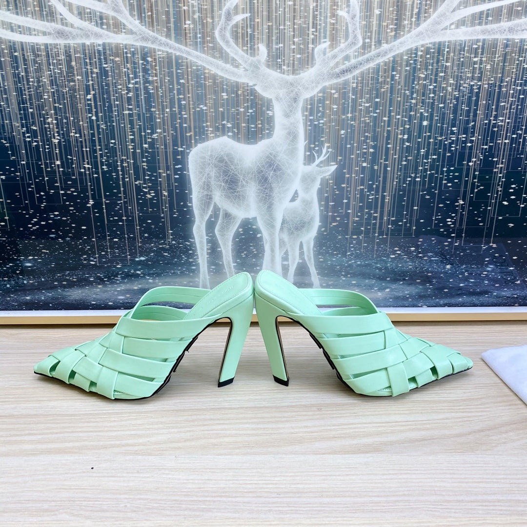 ALFIE LEATHER HIGH MULES IN GREEN MINT CALFSKIN WITH WOVEN DESIGN
