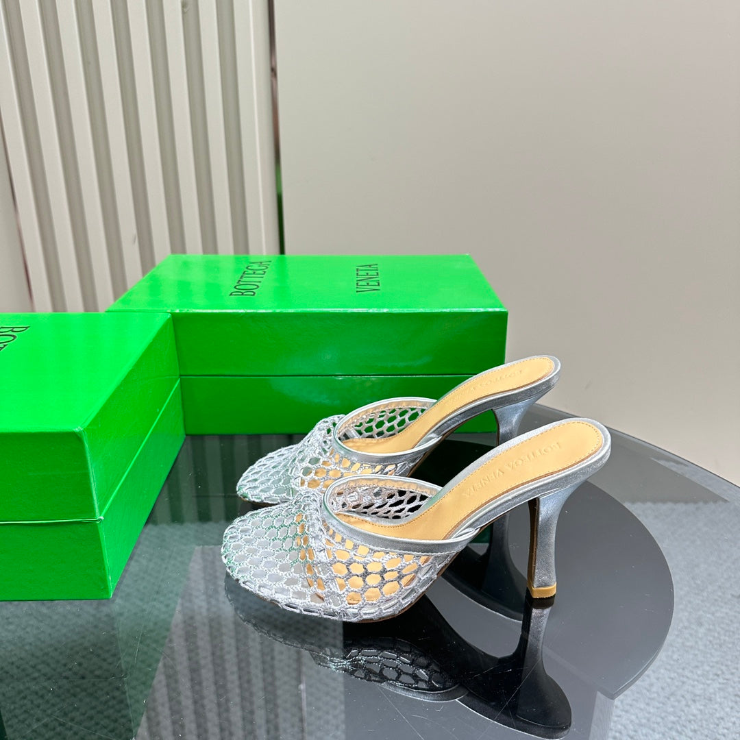 HIGH MULE 9 CM IN SILVER METALLIZE MESH AND LEATHER