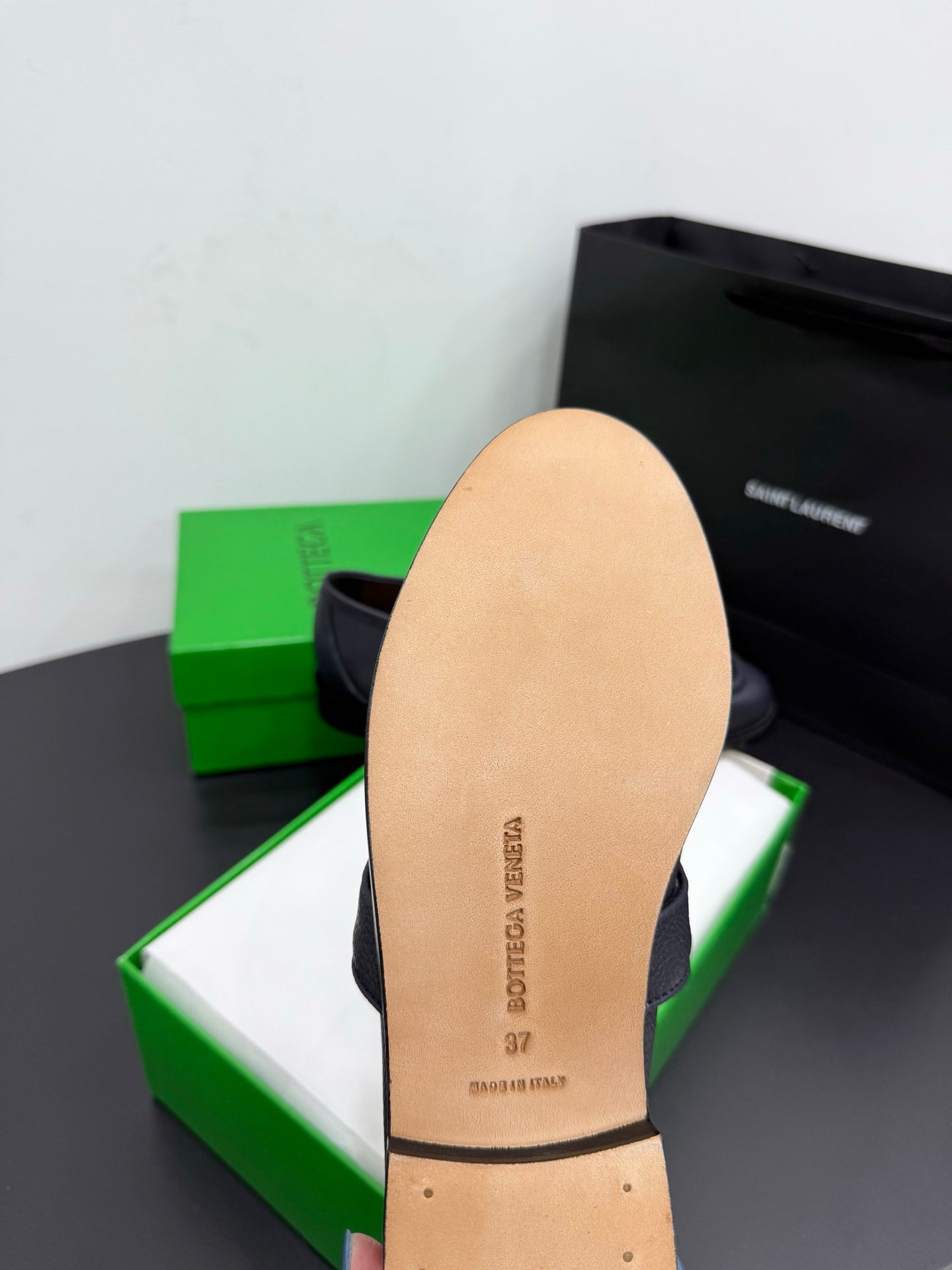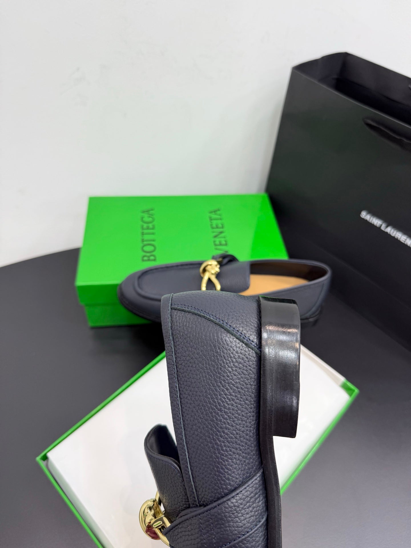 BOTTEGA VENETA 26S LOAFERS IN BLUE GRAY GRAINED CALFSKIN WITH GOLD HARDWARE