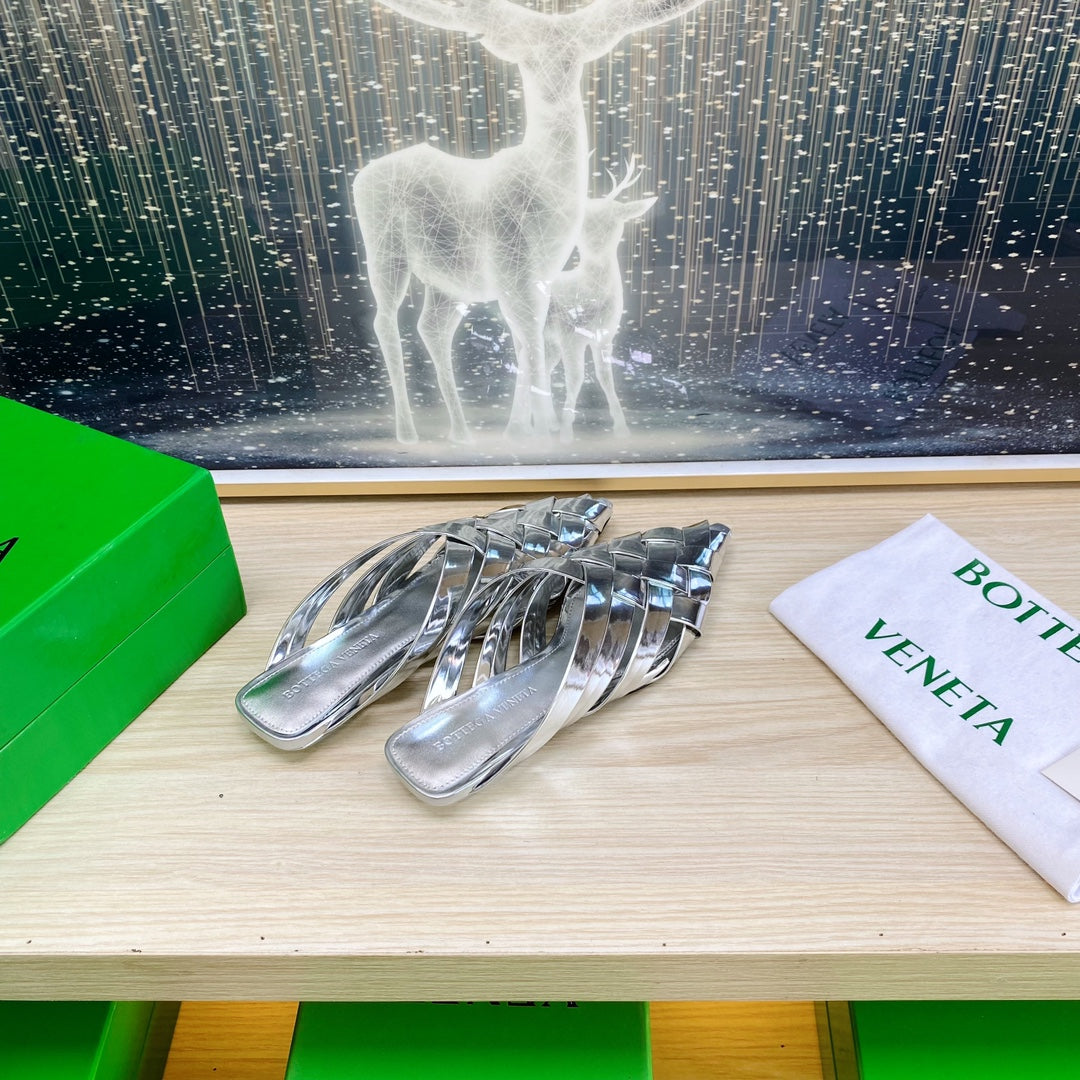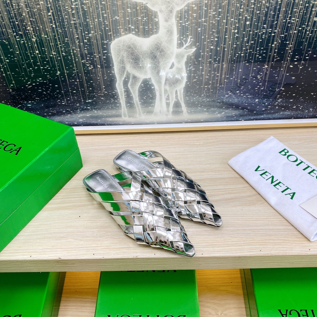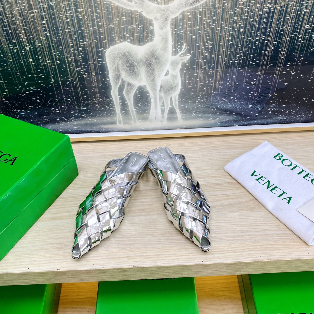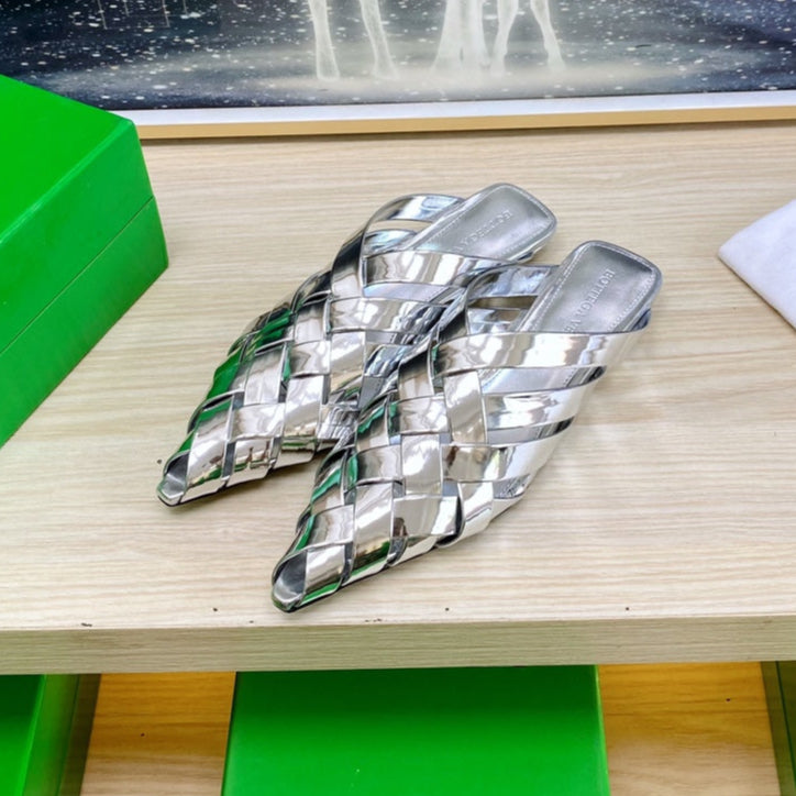 ALFIE LEATHER FLAT MULES IN SILVER PATENT CALFSKIN WITH WOVEN DESIGN