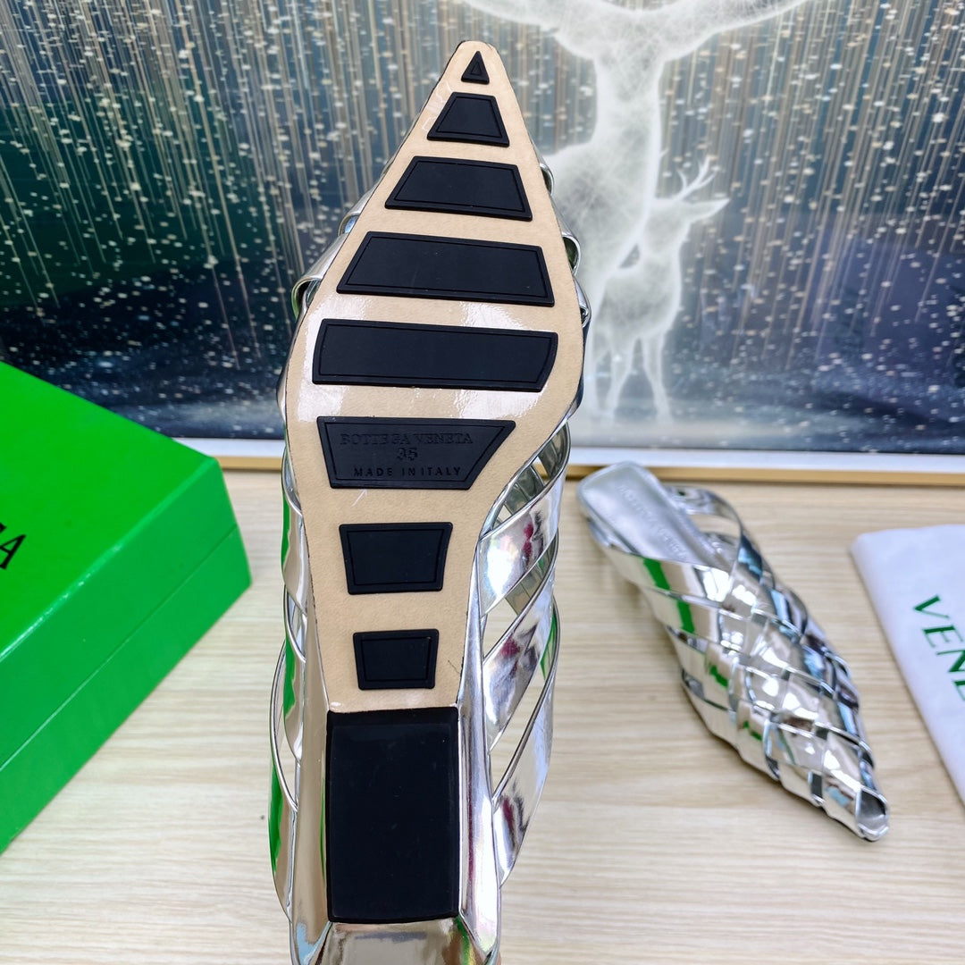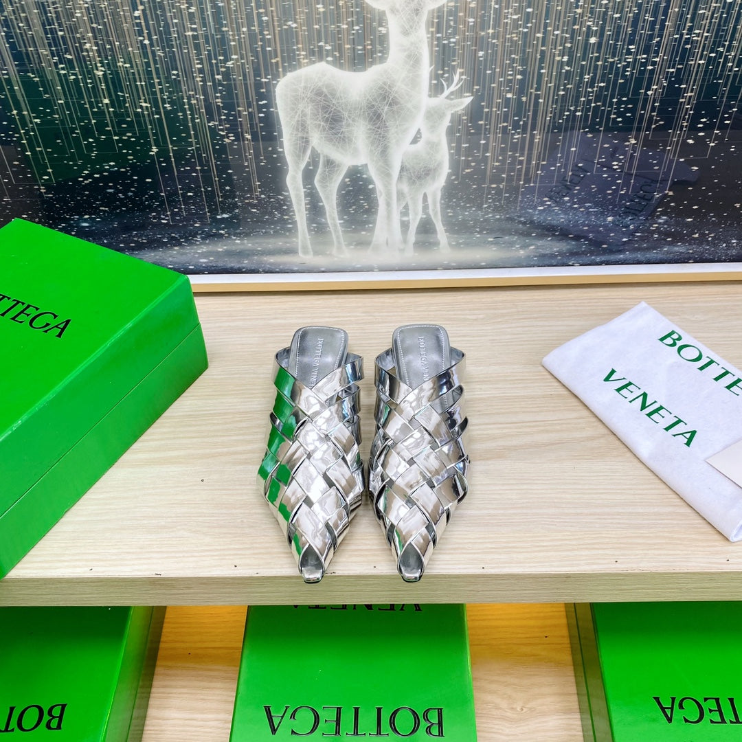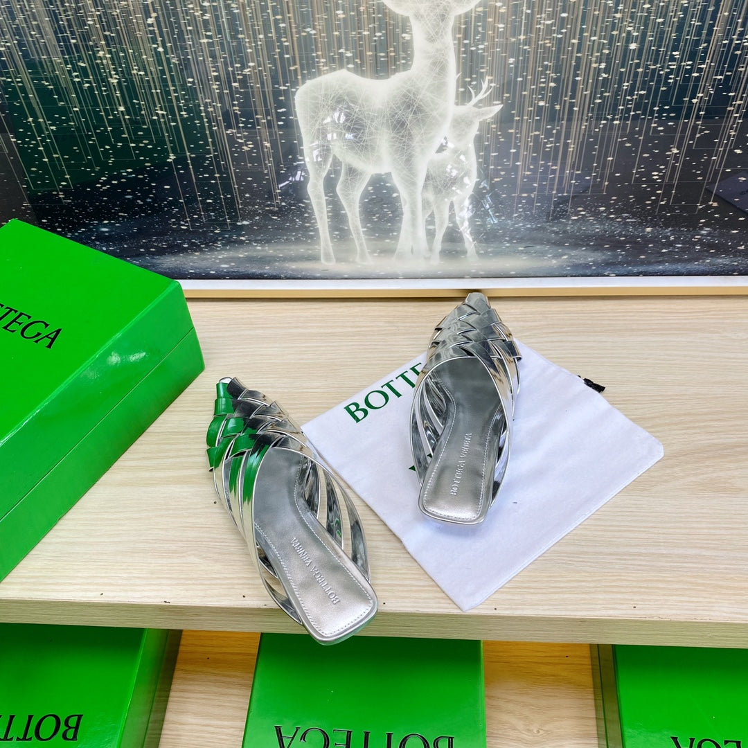 ALFIE LEATHER FLAT MULES IN SILVER PATENT CALFSKIN WITH WOVEN DESIGN