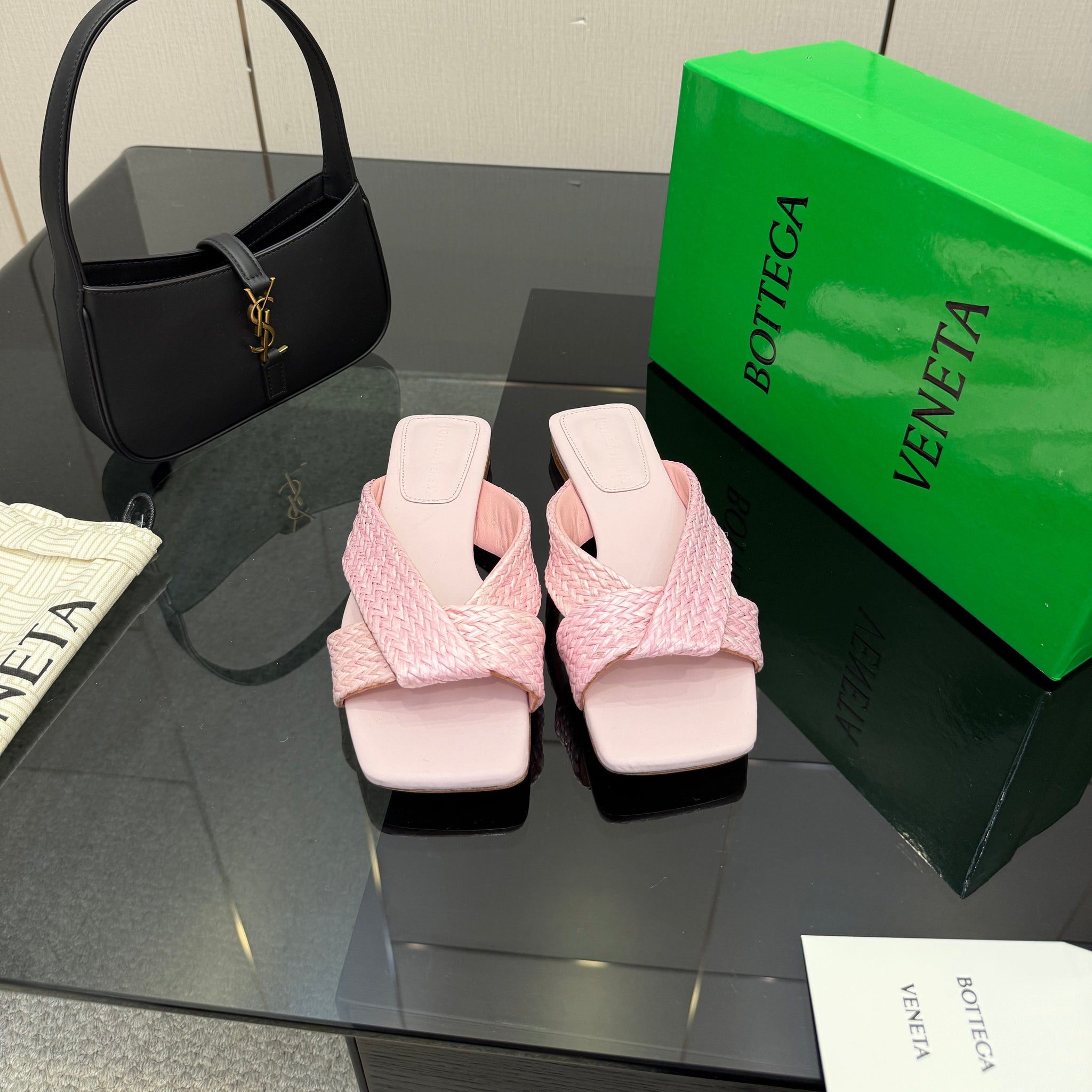 BOTTEGA VENETA 26S SANDALS IN LIGHT PINK CALFSKIN AND RAFFIA