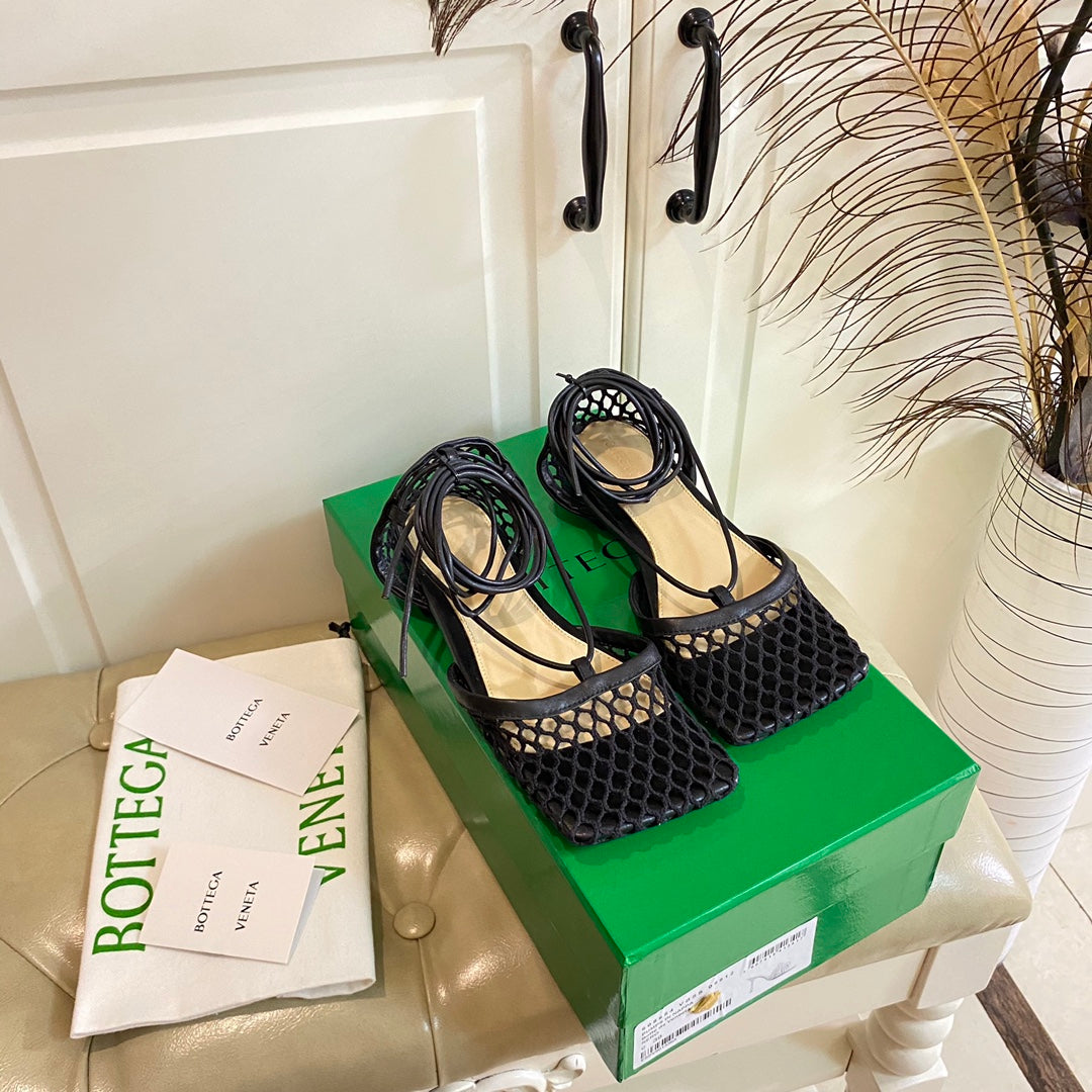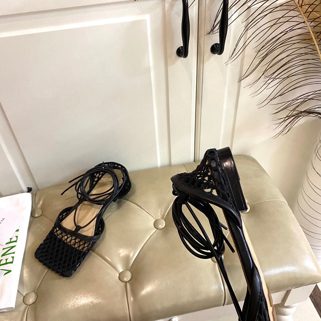STRETCH LACE-UP FLAT SANDAL IN BLACK METALLIZED MESH AND LEATHER