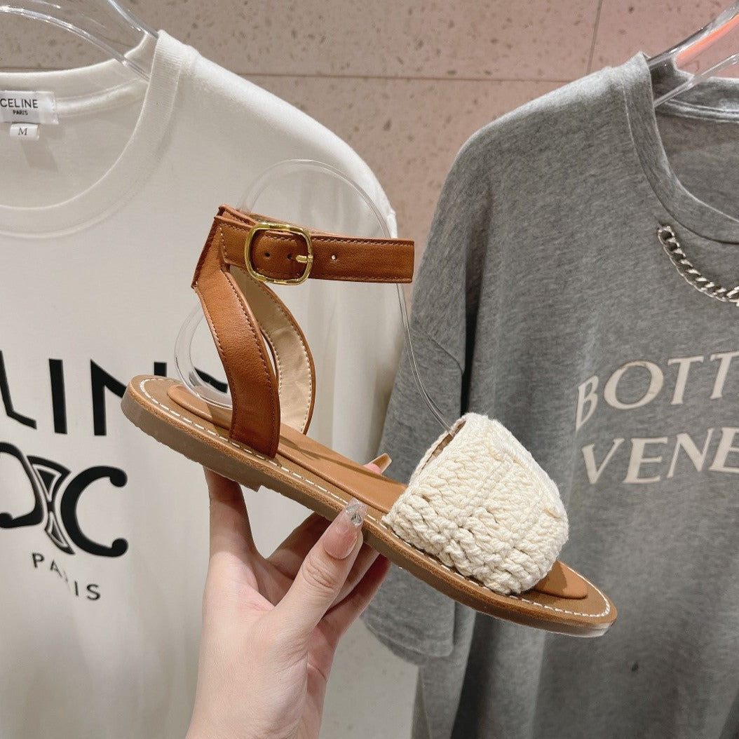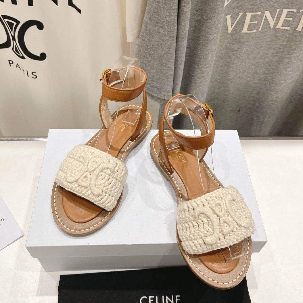 LYMPIA SANDAL IN TRIOMPHE MACCRAMÉ COTTON & CALFSKIN ECRU TAN