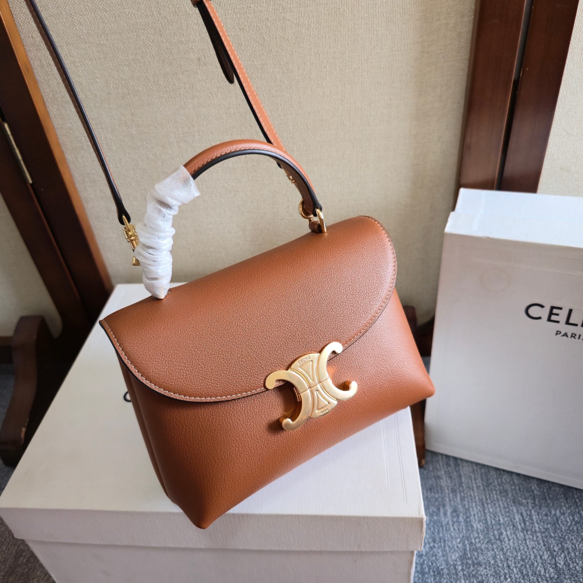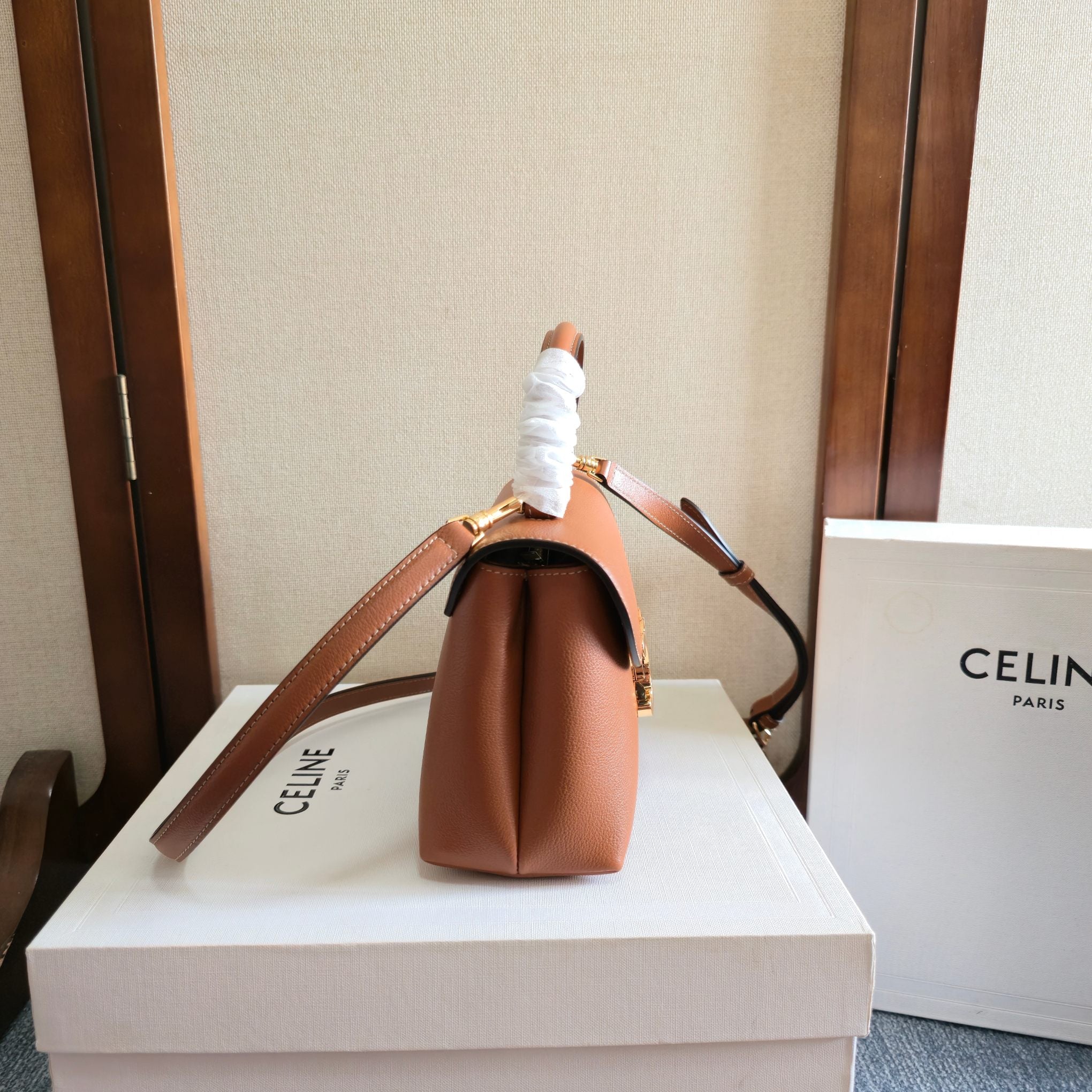 CELINE 25S NINO BAG 20MM IN CARAMEL BROWN GRAINED CALFSKIN GOLD HARDWARE