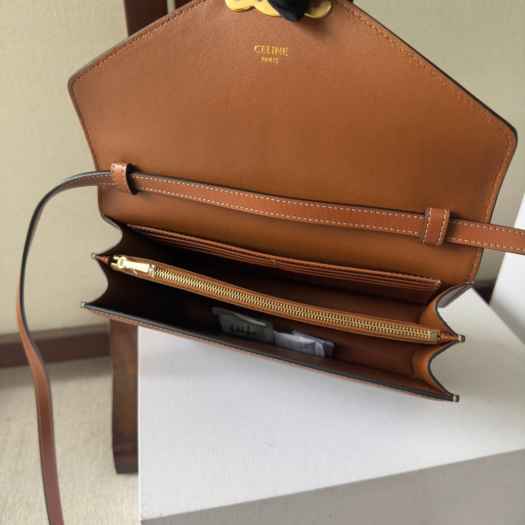 CELINE 25S WALLET MARGO 22MM IN BLACK TRIOMPHE CANVAS AND BROWN CALFSKIN