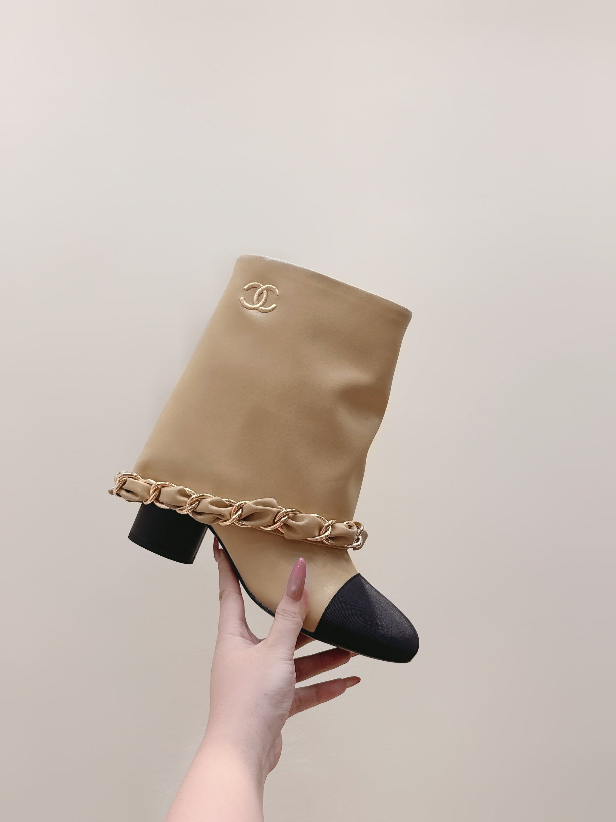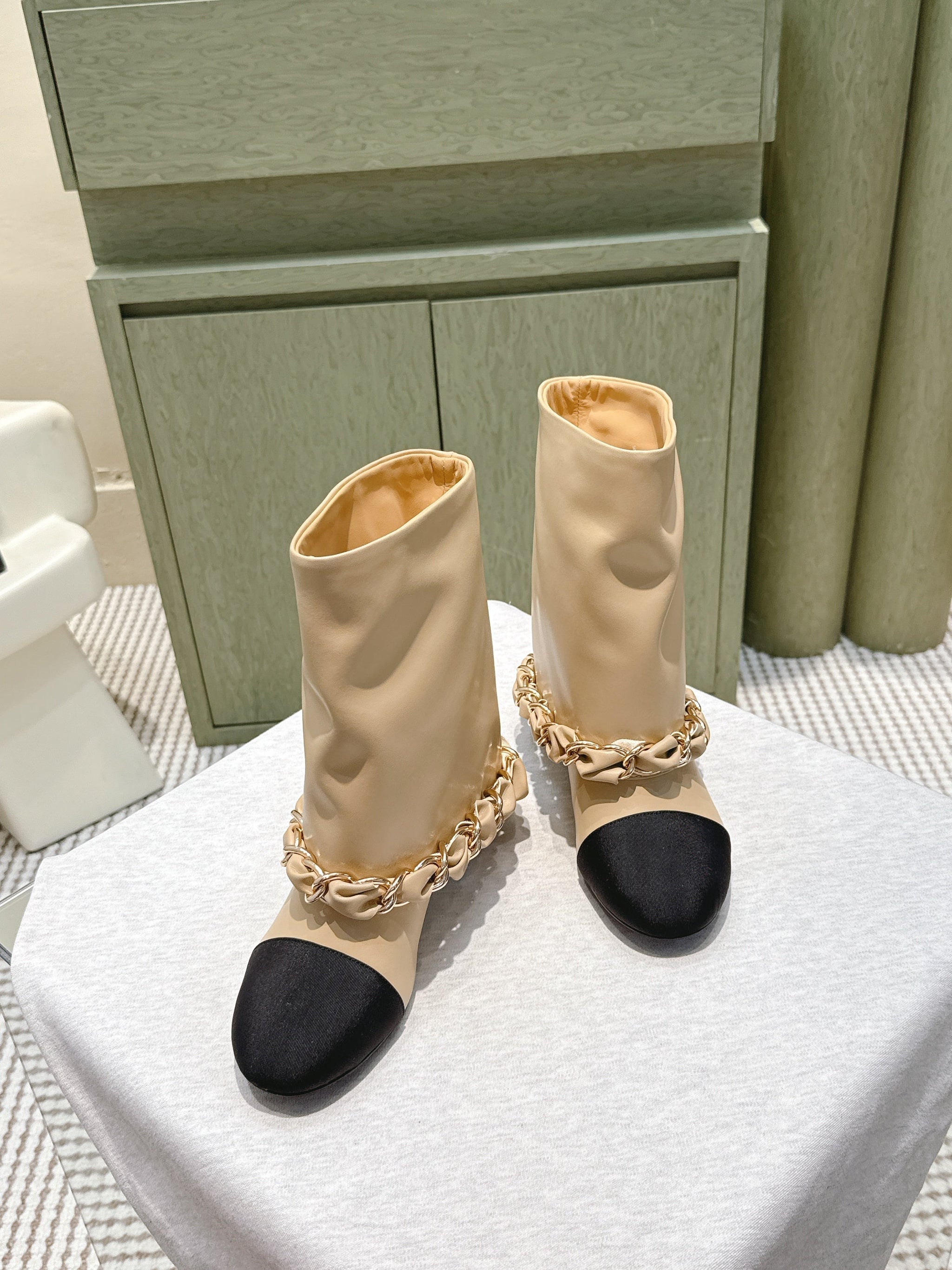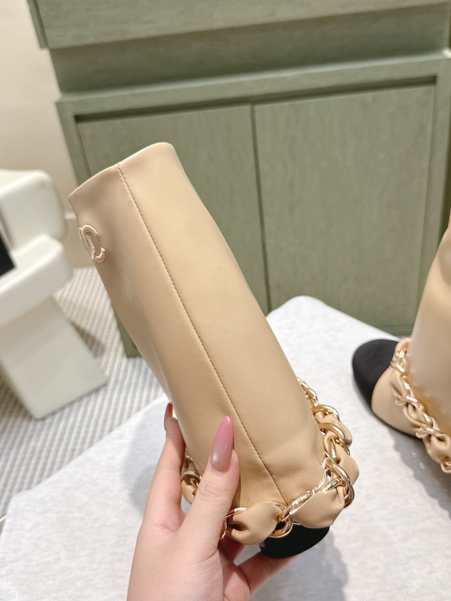 CHANEL 25S CALF-LENGTH BOOTS 45MM IN BEIGE AND BLACK CALFSKIN GOLD HARDWARE