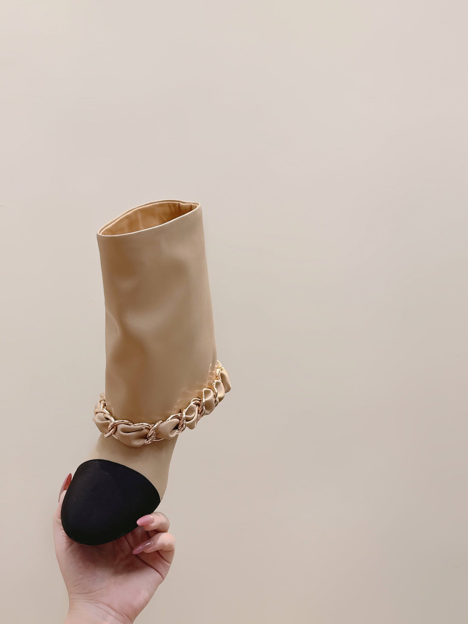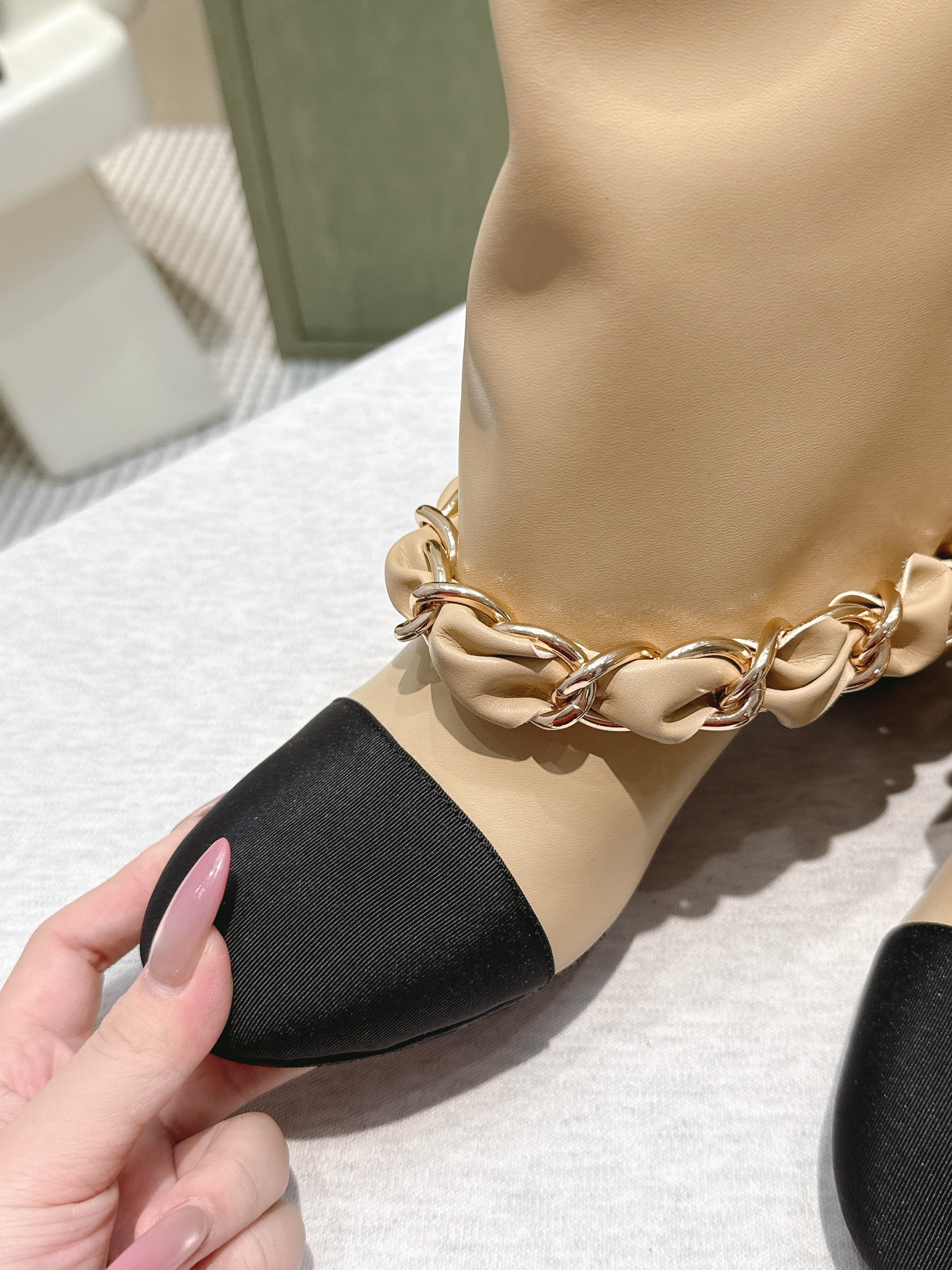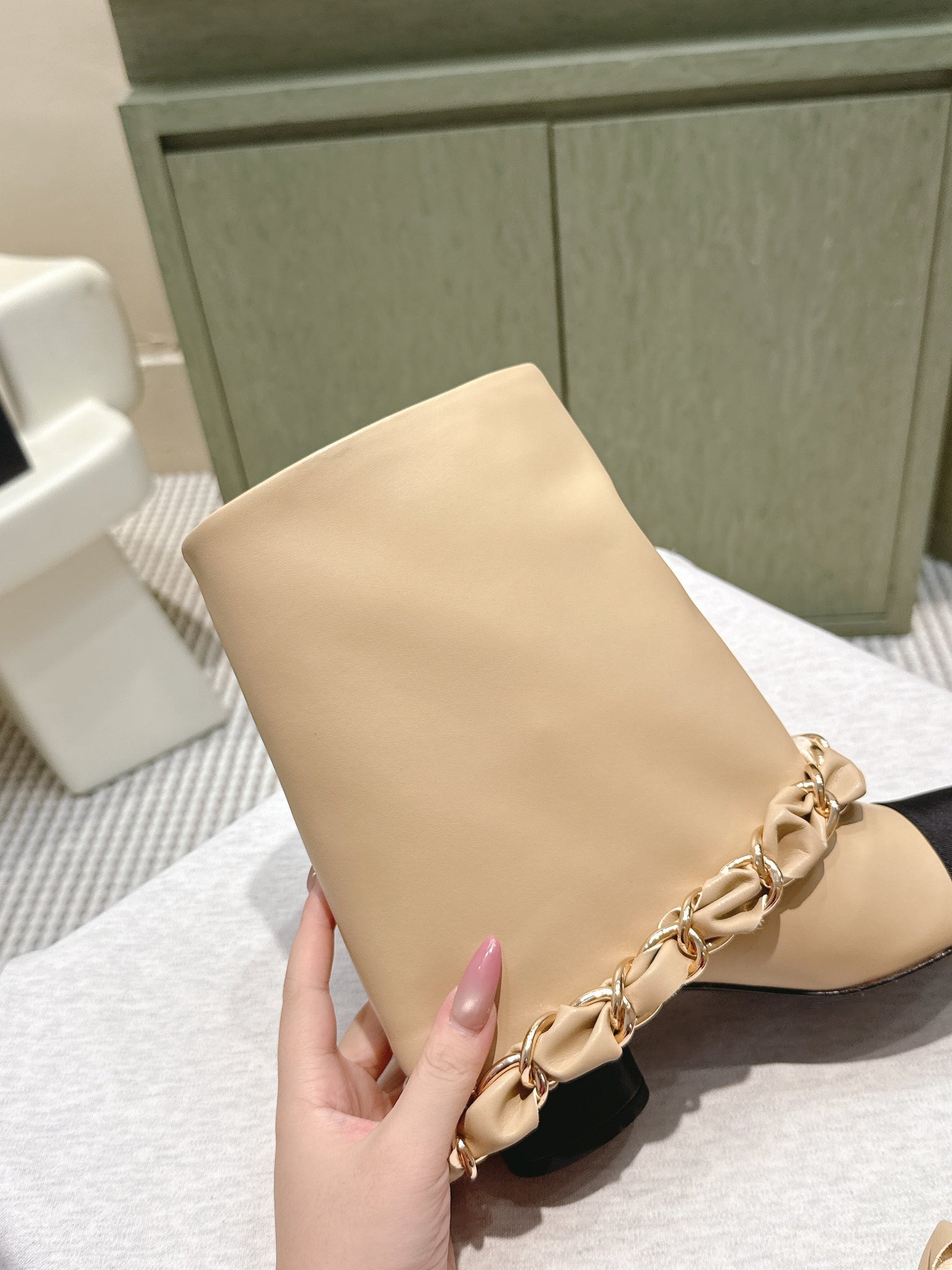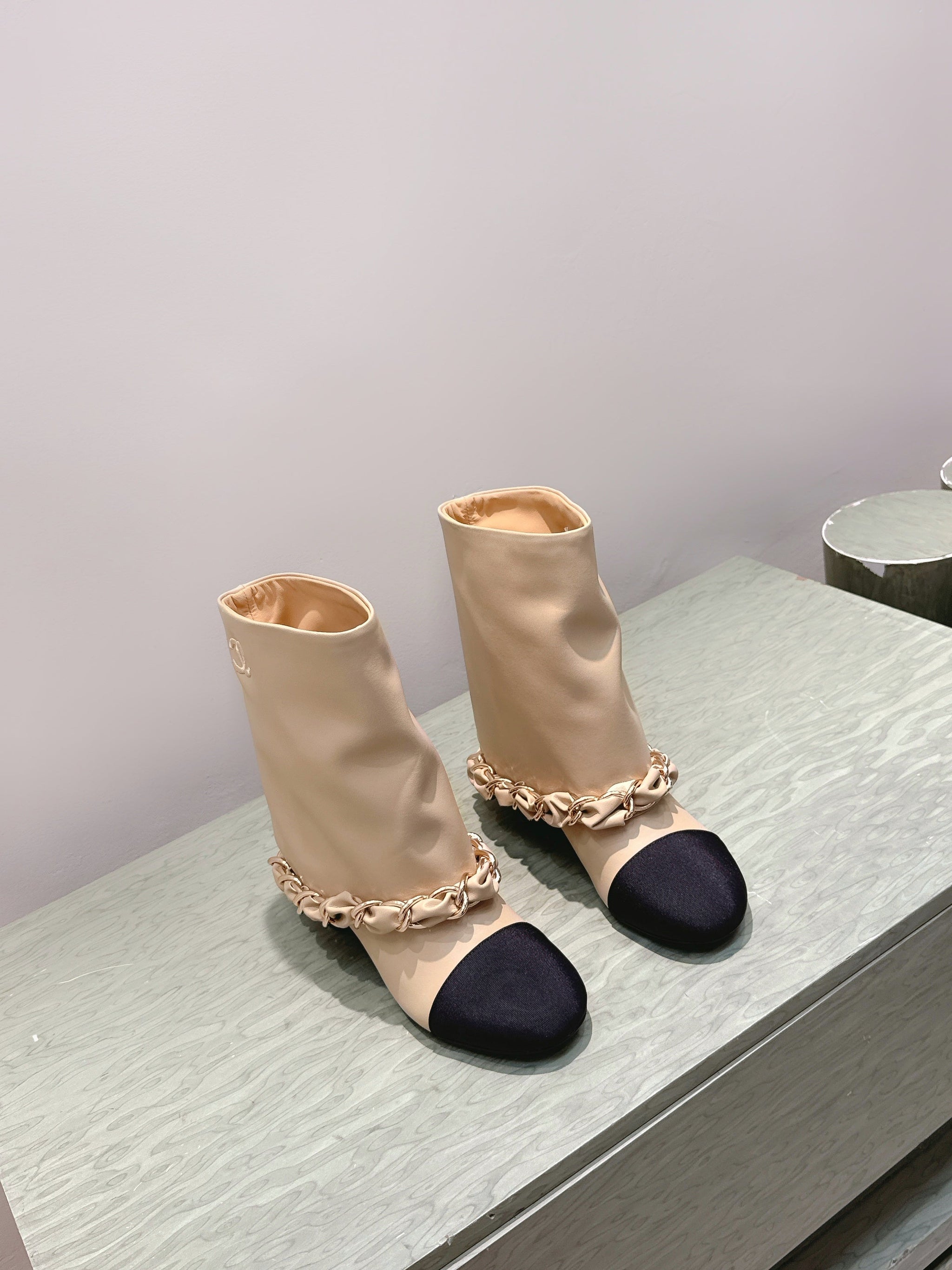 CHANEL 25S CALF-LENGTH BOOTS 45MM IN BEIGE AND BLACK CALFSKIN GOLD HARDWARE
