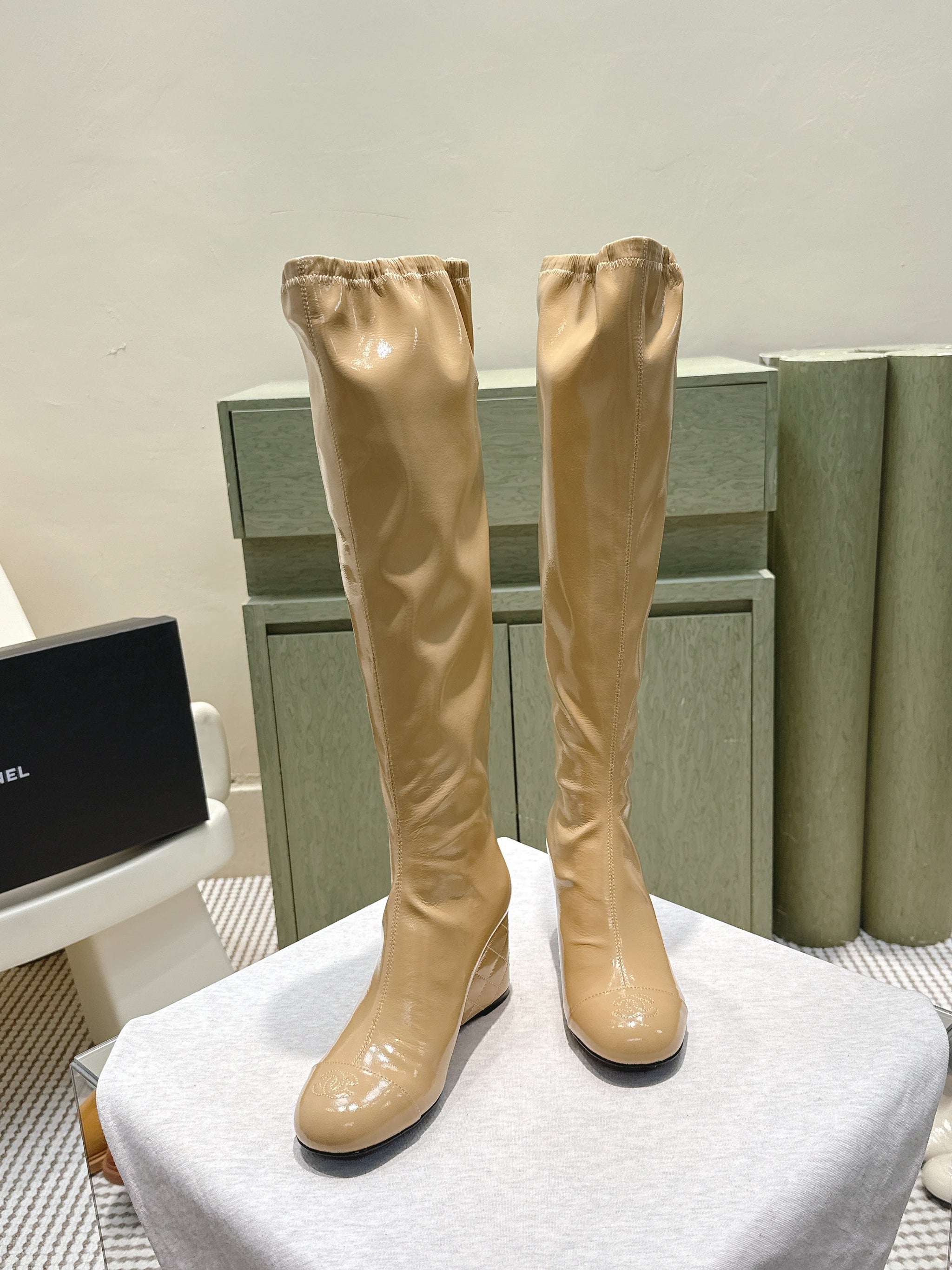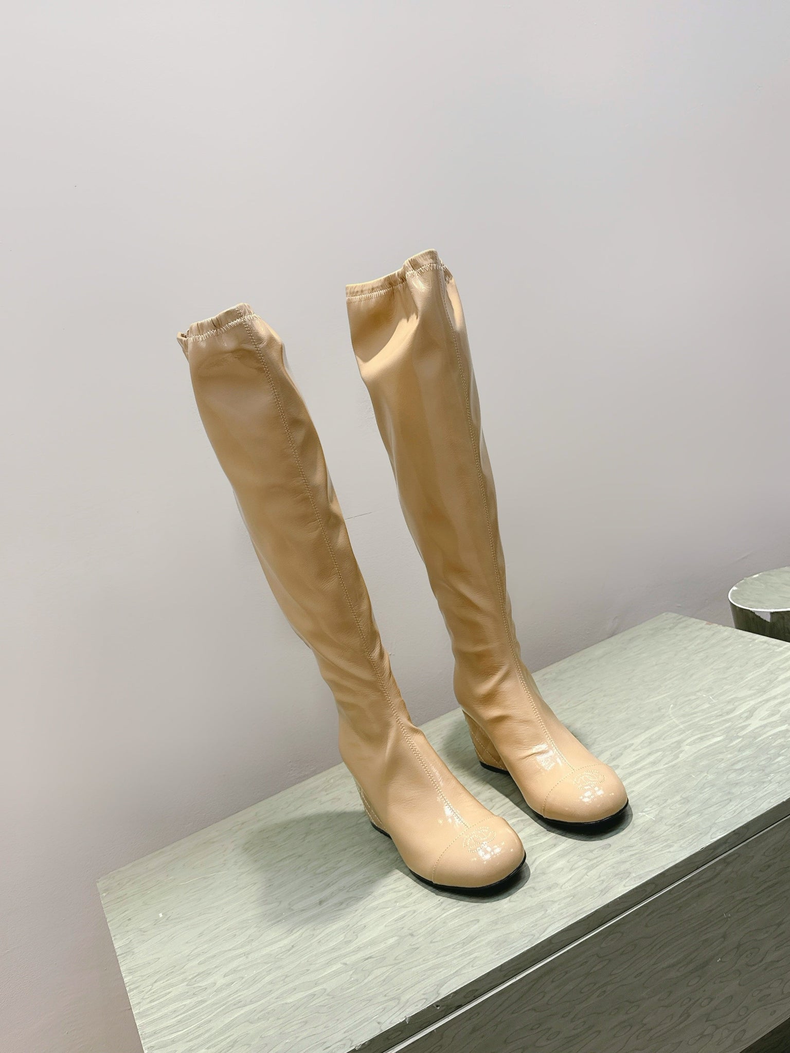 CHANEL 25S KNEE-HIGH BOOTS 60MM IN BEIGE PATENT CALFSKIN WEDGE HEELS