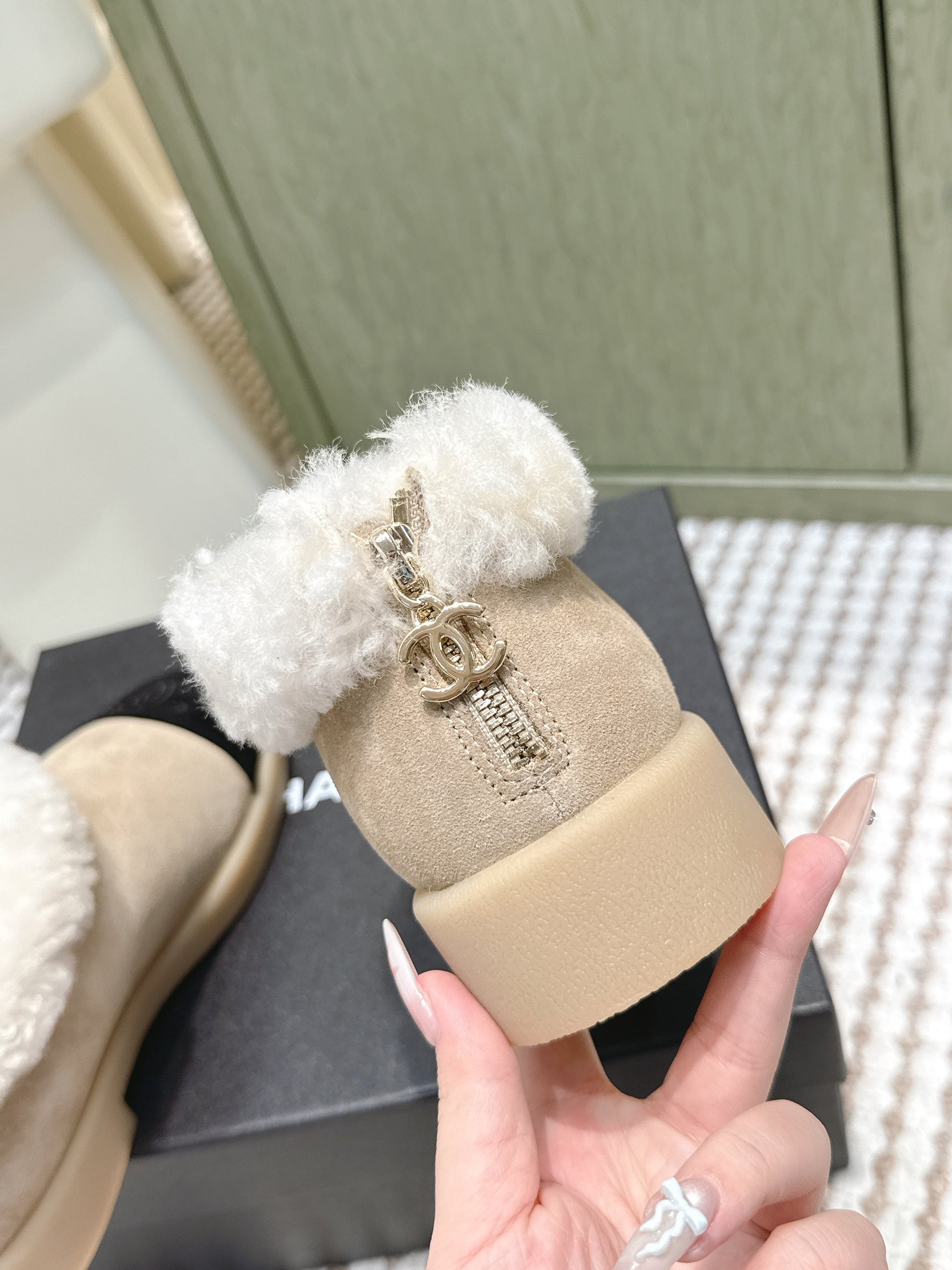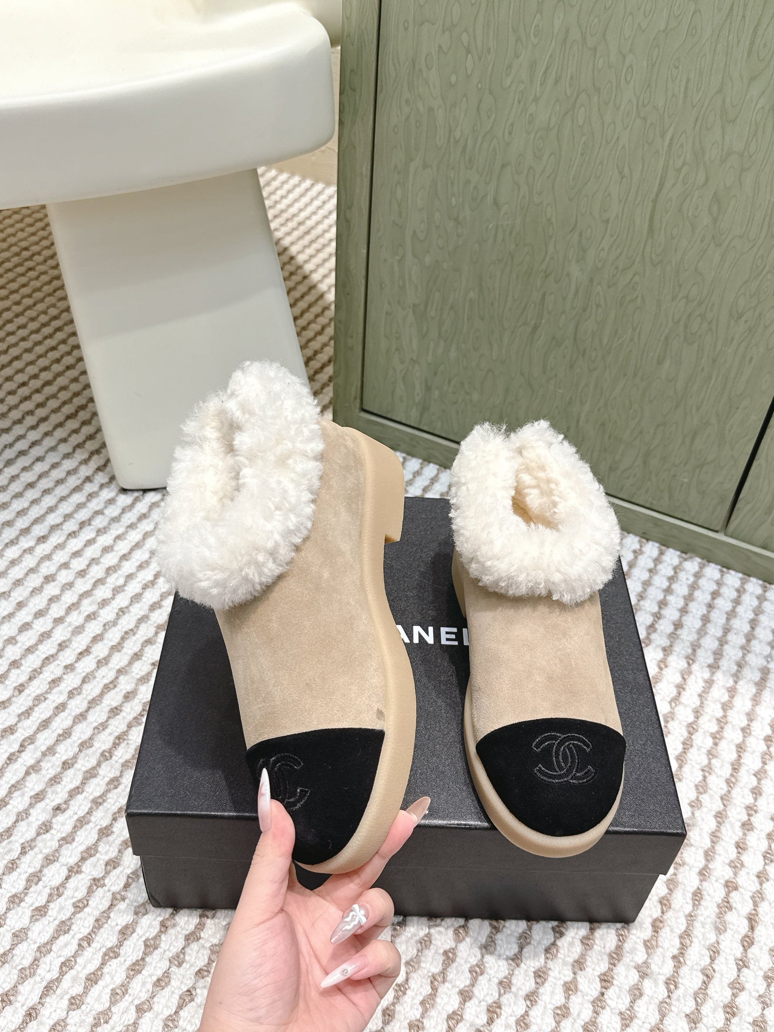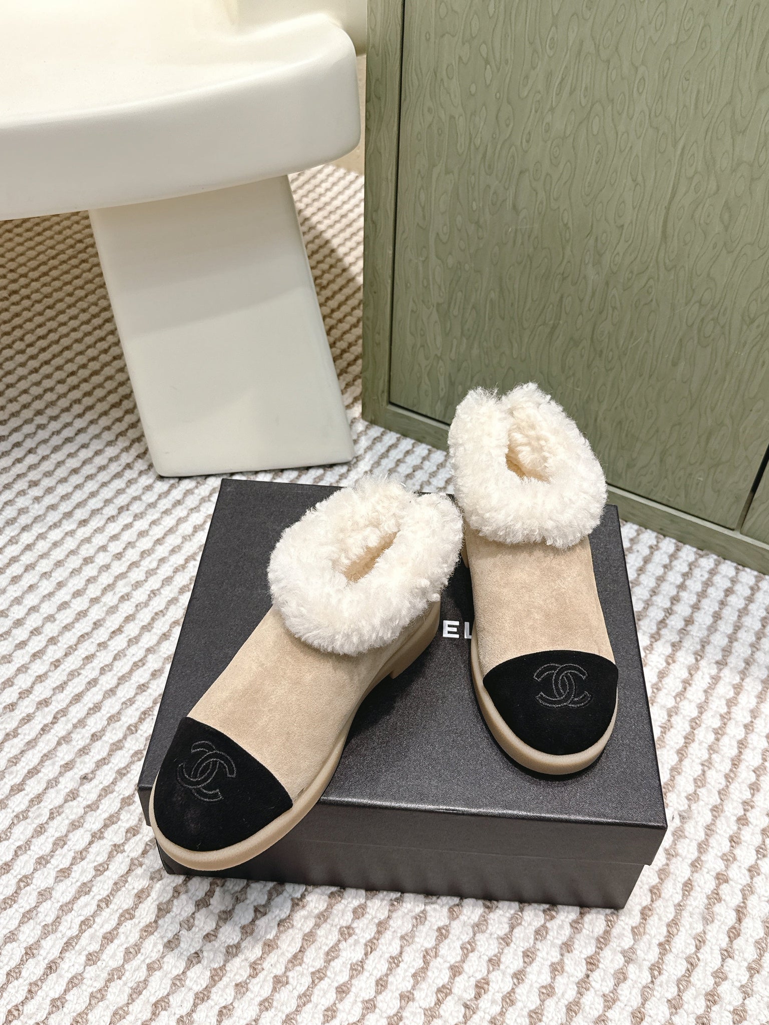 CHANEL 25S SHORT SUEDE BOOTS IN BEIGE AND BLACK WITH SHEEPSKIN LINING