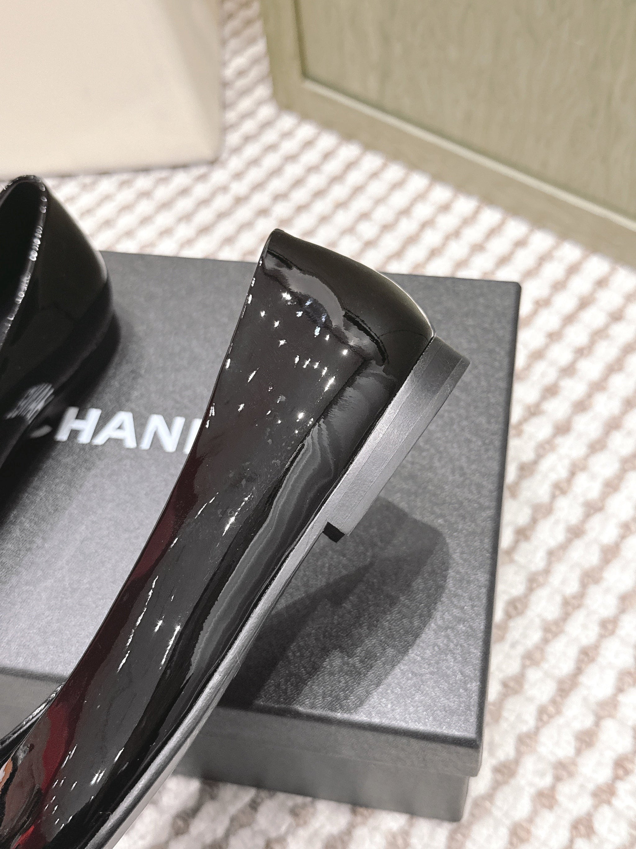 CHANEL 25S BALLET FLAT ROUND TOE IN BLACK PATENT SHEEPSKIN WITH CAMELLIA