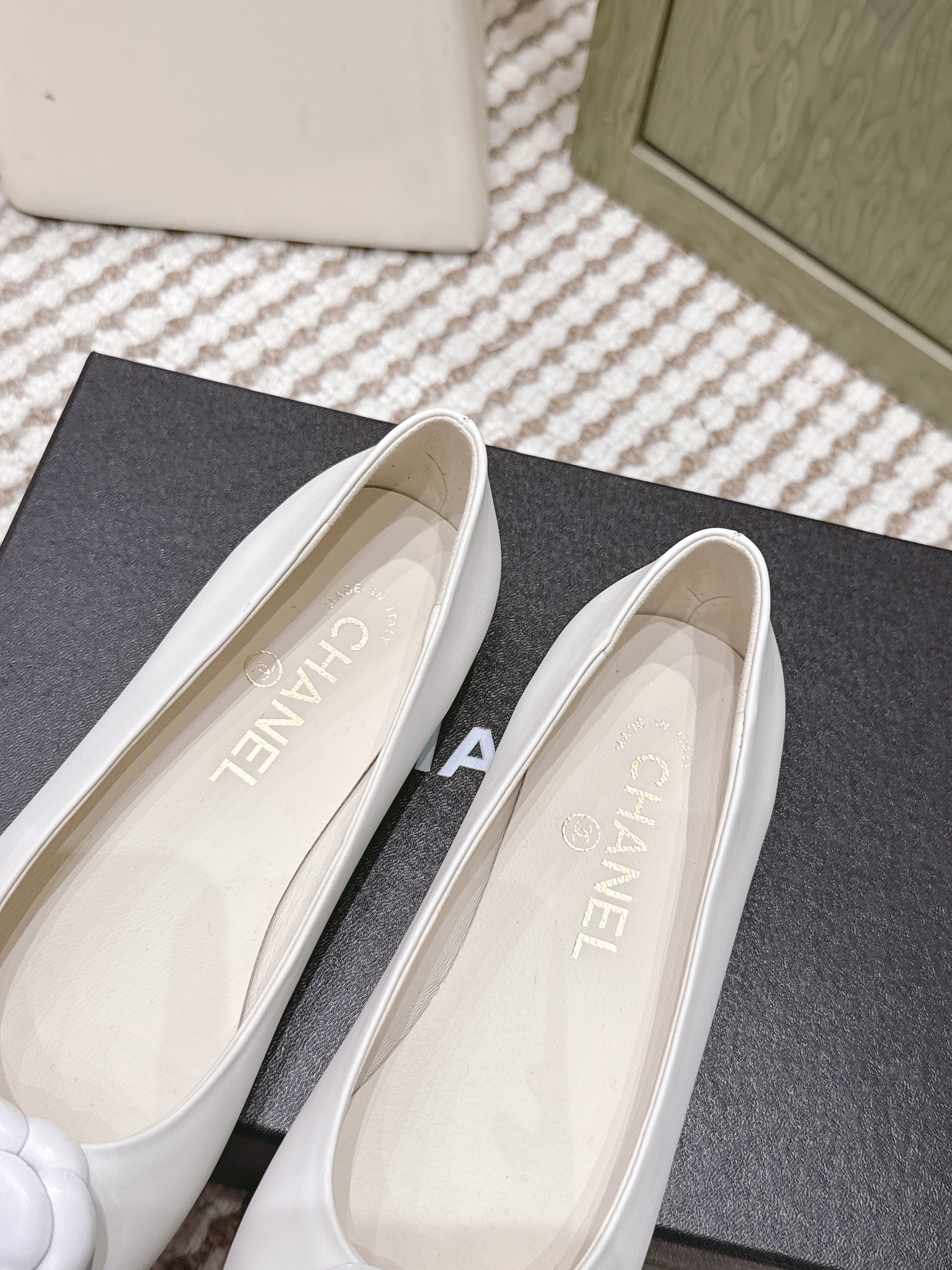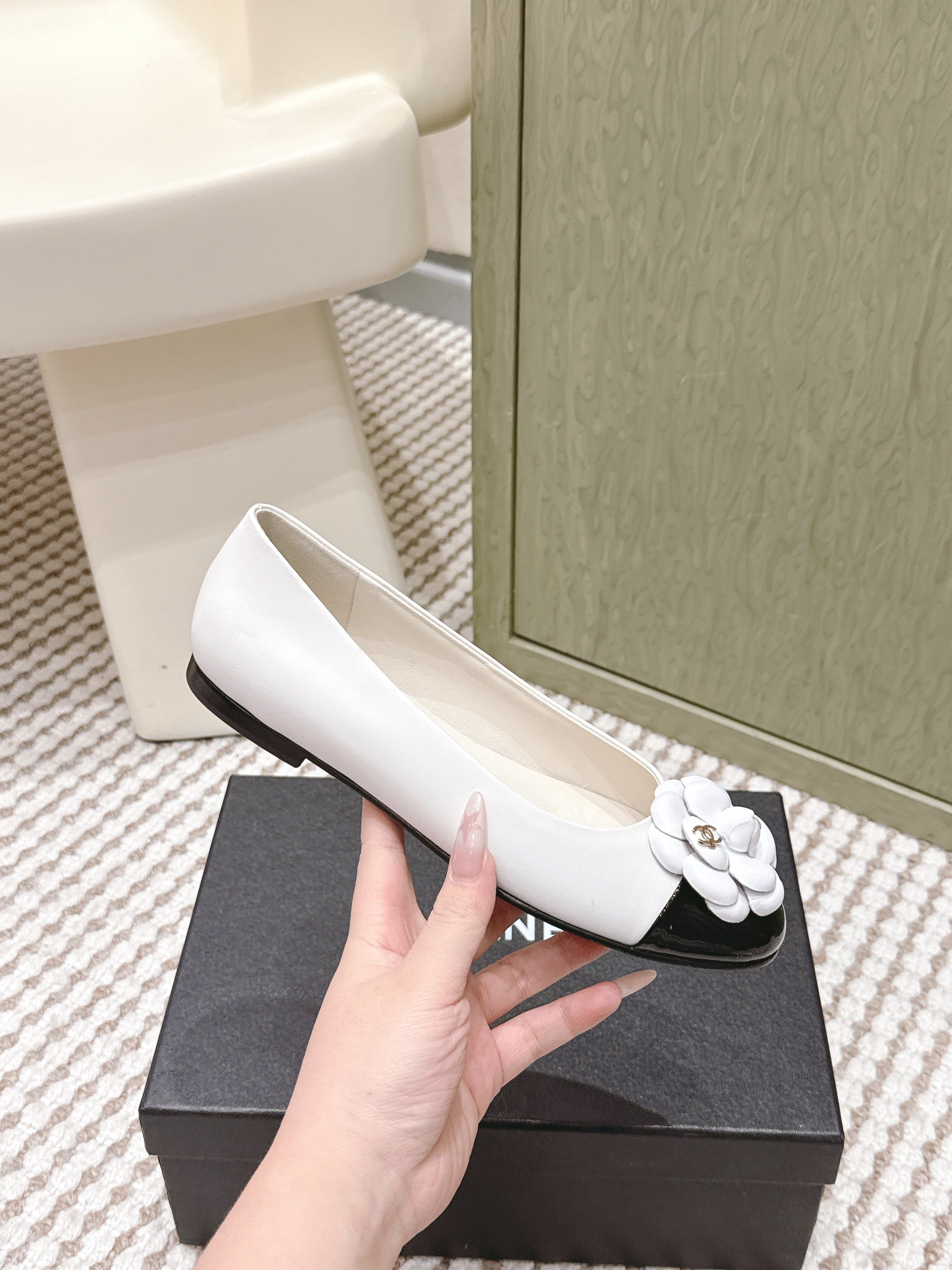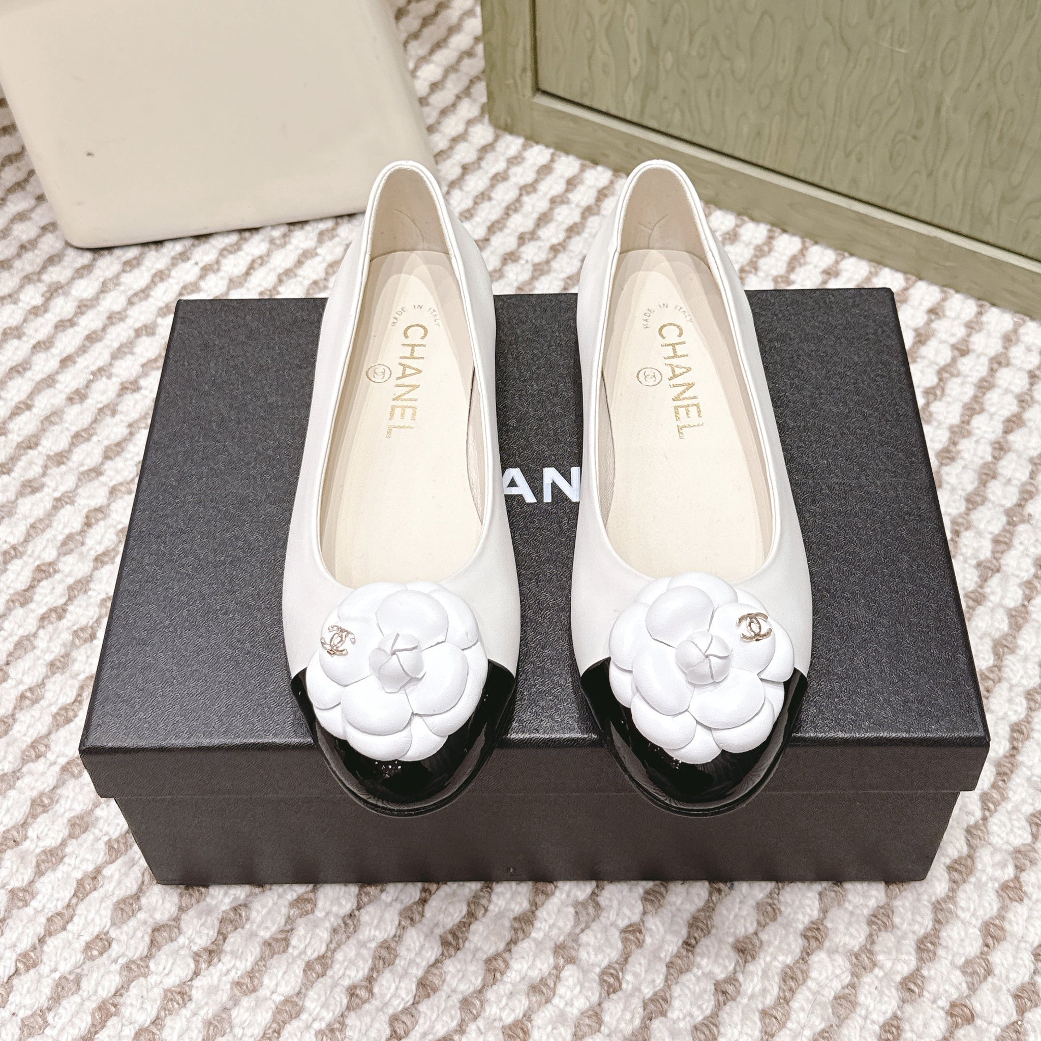 CHANEL 25S BALLET FLAT ROUND TOE IN WHITE AND BLACK SHEEPSKIN WITH CAMELLIA