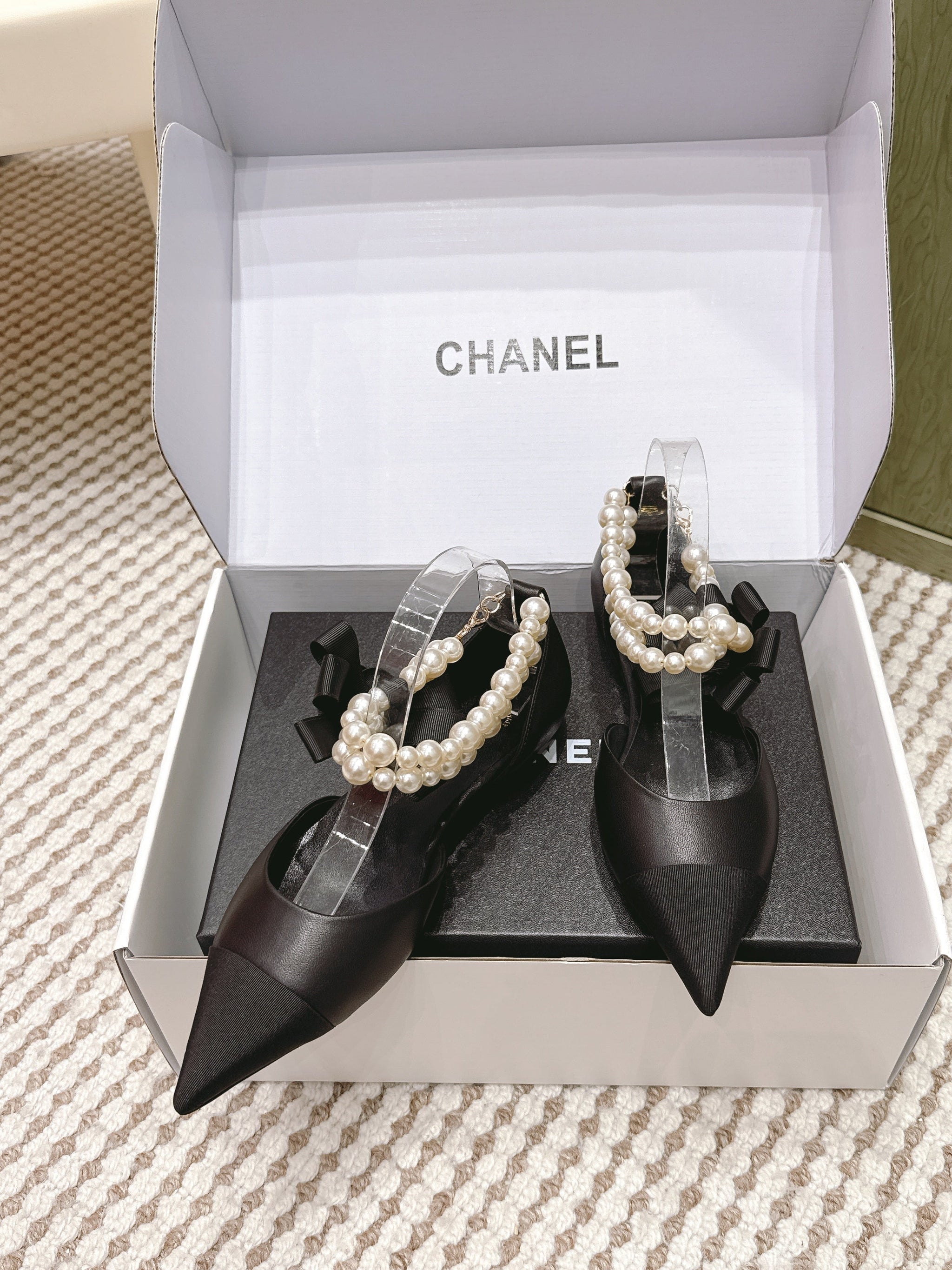 CHANEL 25S ESPADRILLE FLATS IN BLACK CALFSKIN WITH PEARL STRAP
