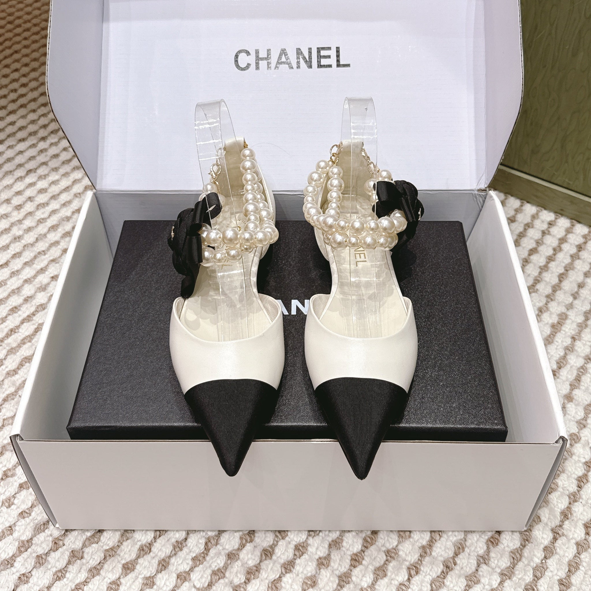 CHANEL 25S ESPADRILLE FLATS IN WHITE AND BLACK CALFSKIN WITH PEARL STRAP