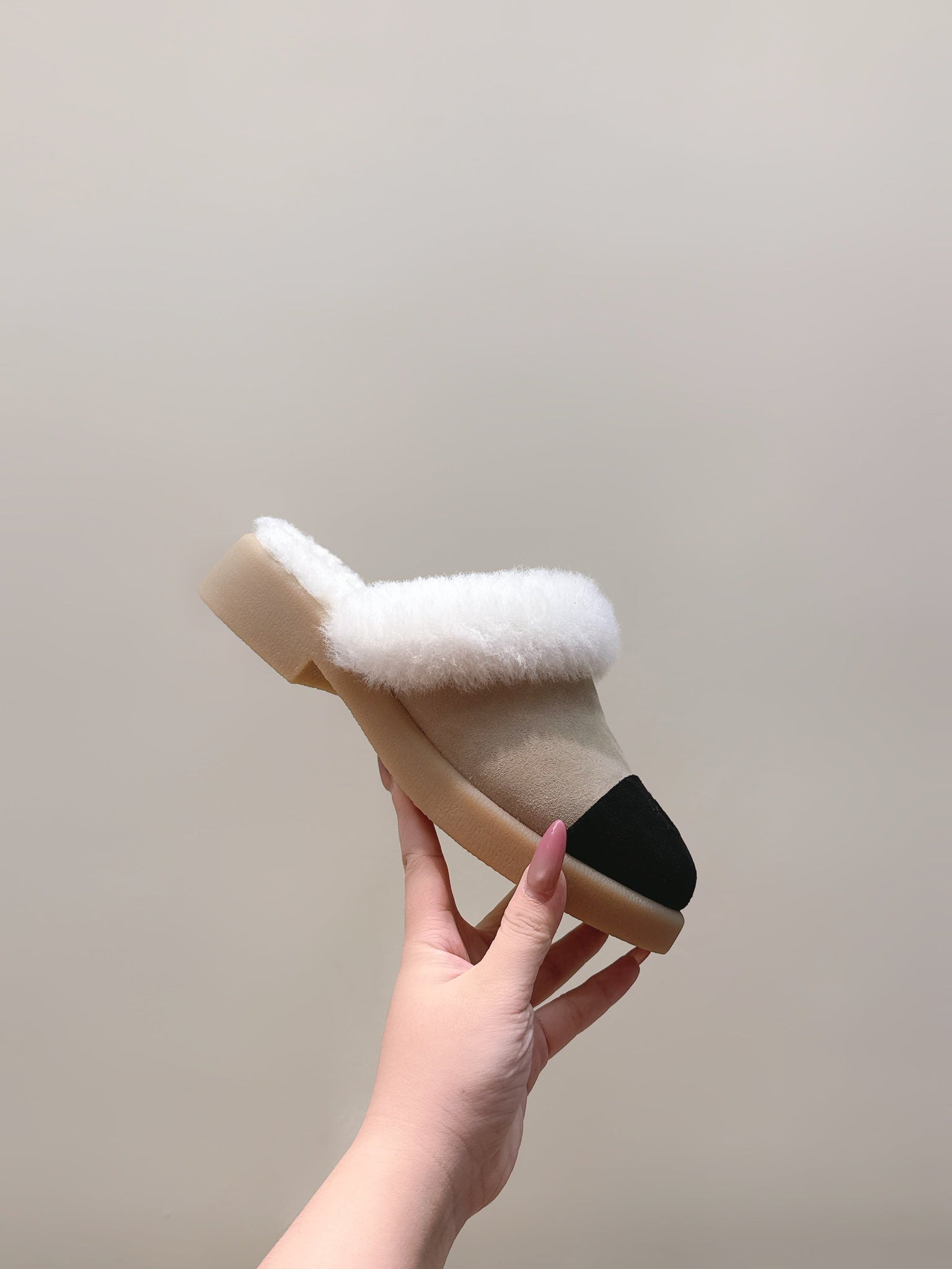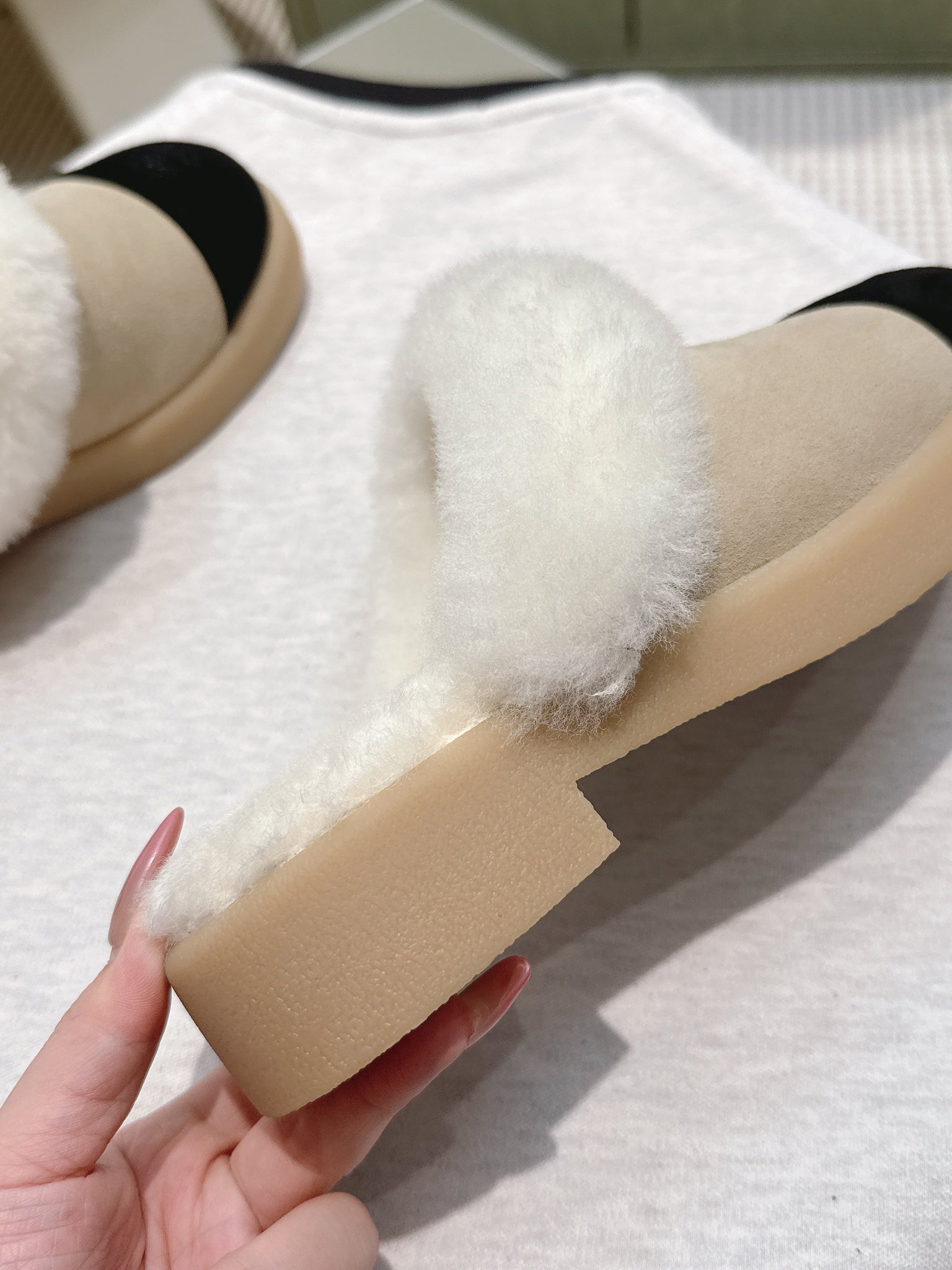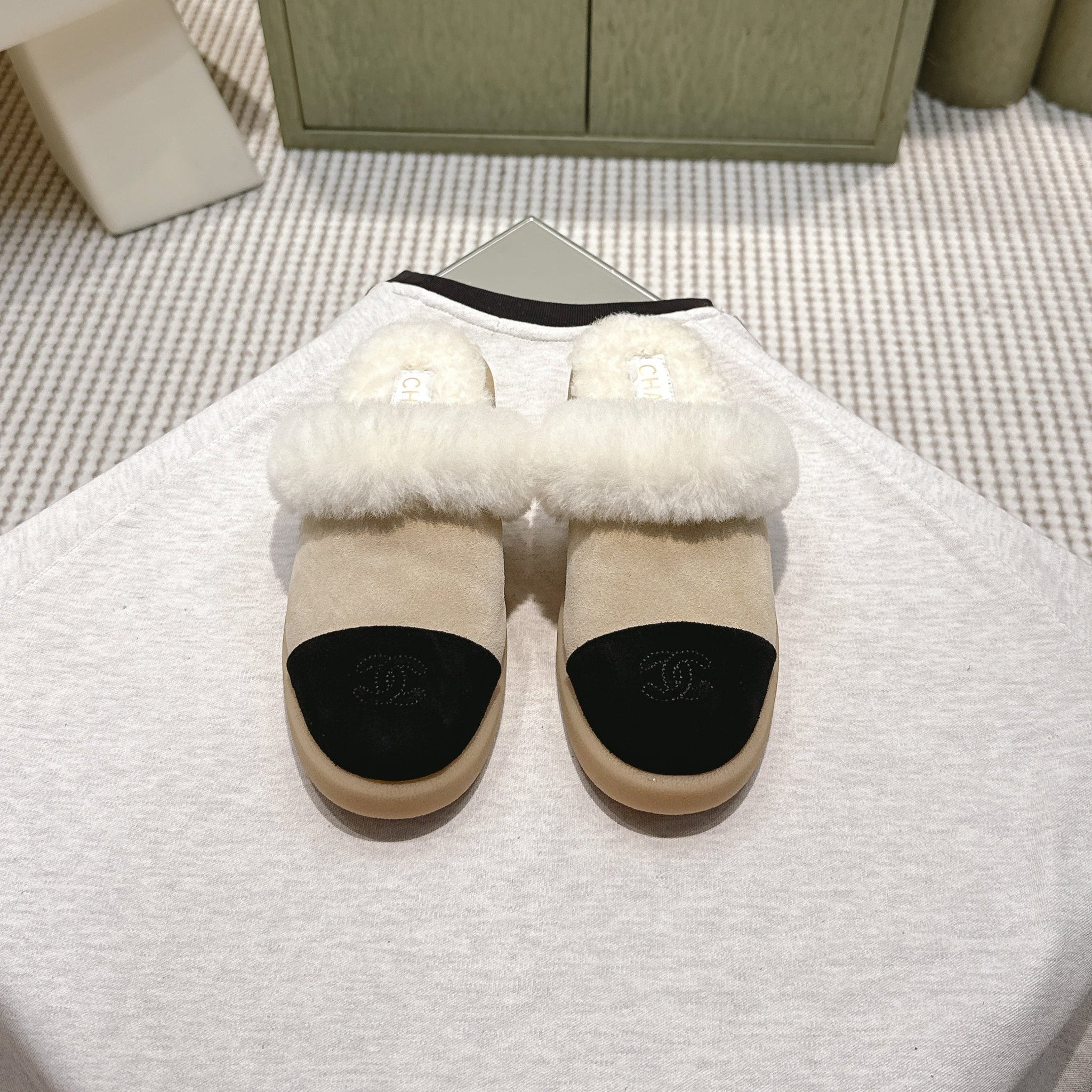 CHANEL 25S FUR-LINED MULES IN BEIGE AND BLACK SUEDE