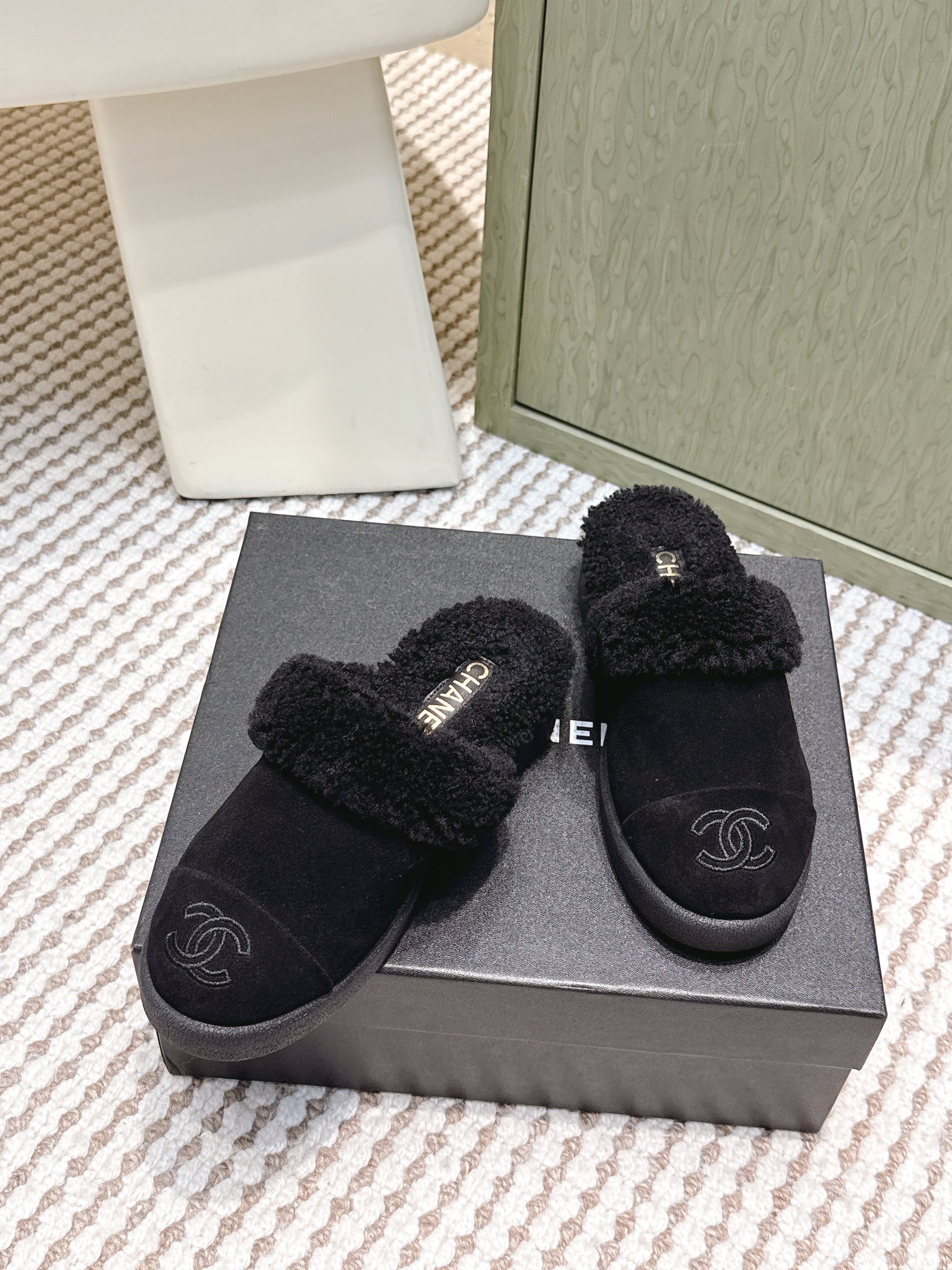 CHANEL 25S INDOOR SLIPPERS IN BLACK SUEDE FUR-LINED