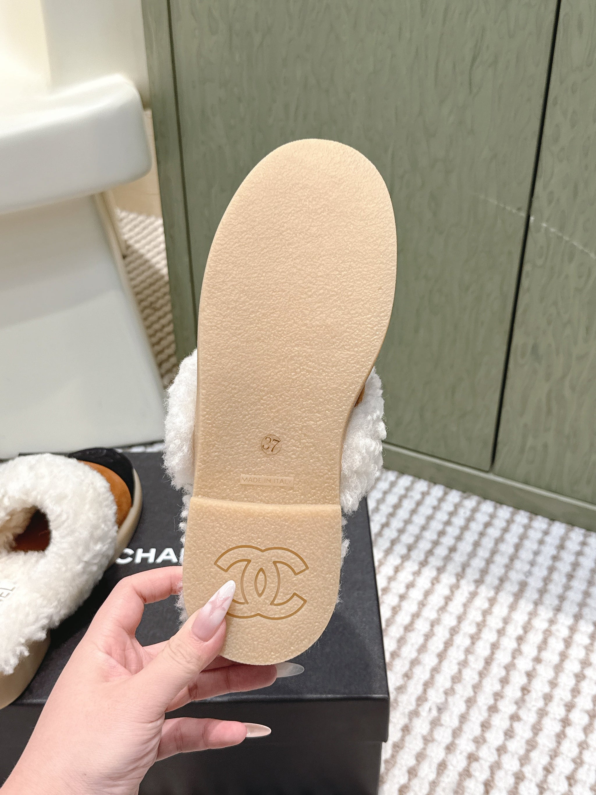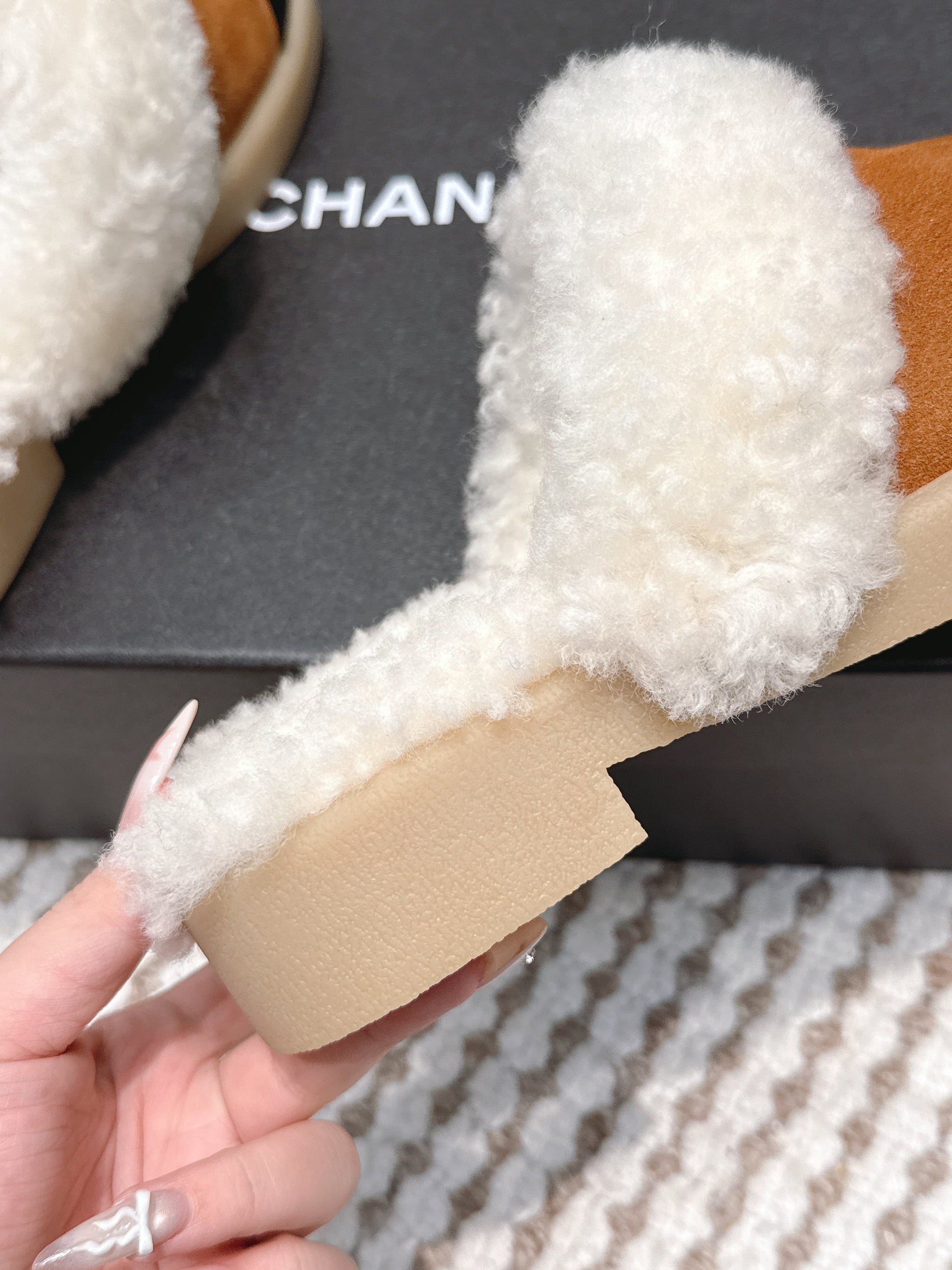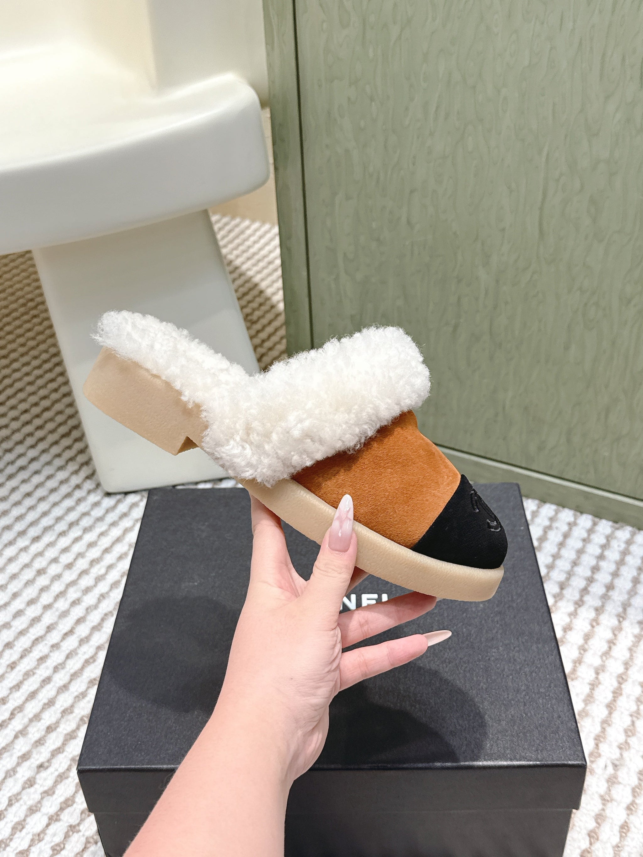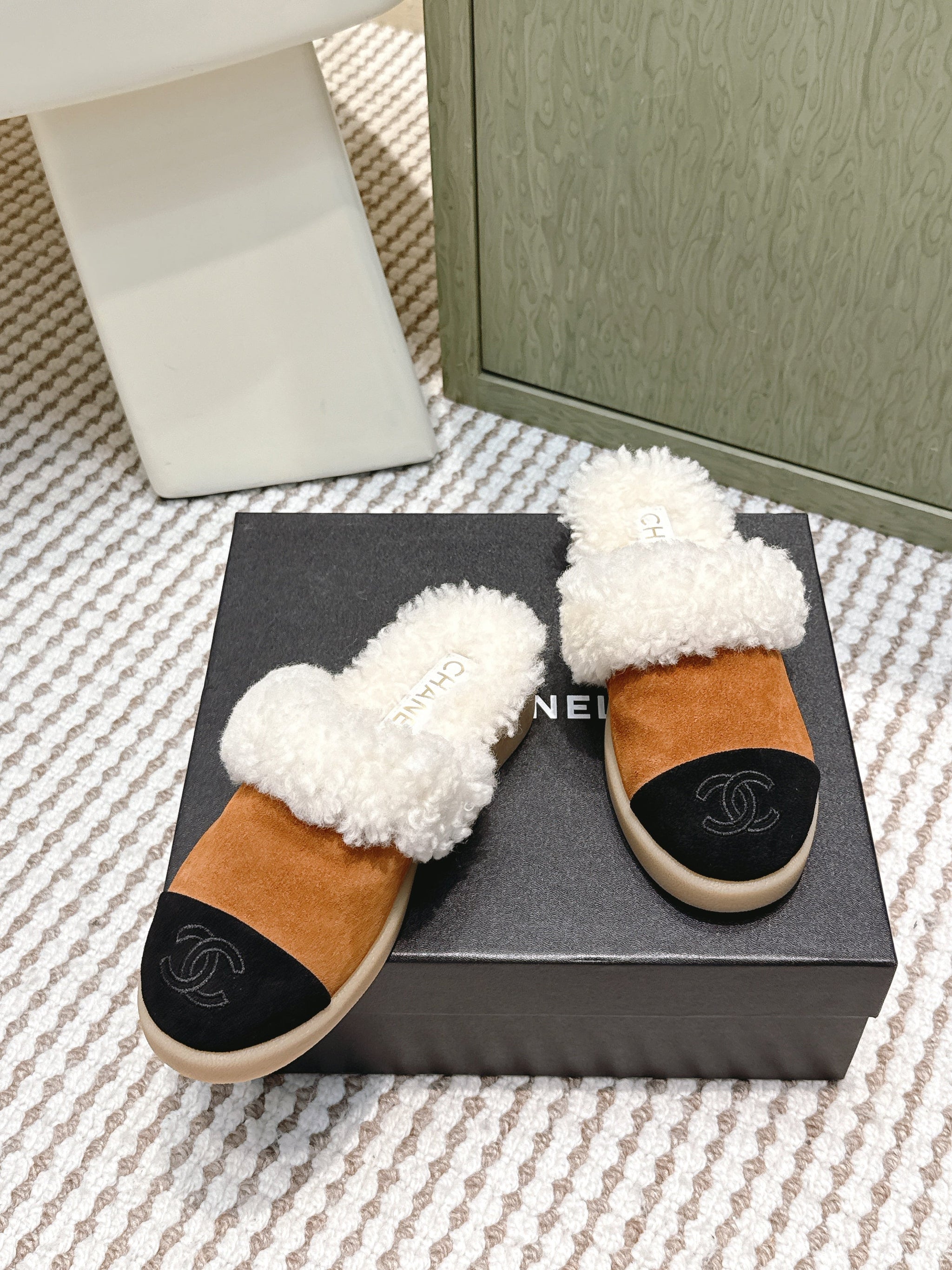 CHANEL 25S INDOOR SLIPPERS IN CARAMEL AND BLACK SUEDE FUR-LINED