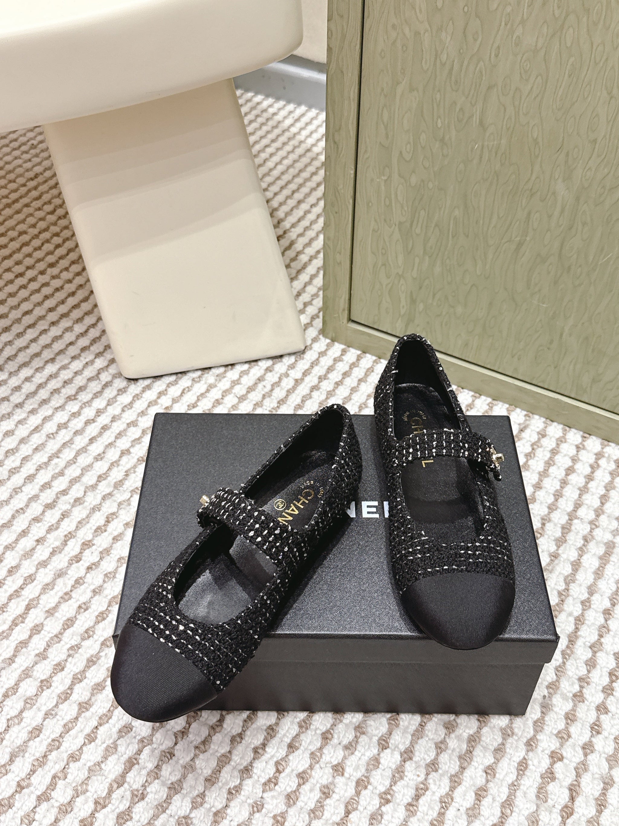 CHANEL 25S MARY JANE FLAT IN BLACK TWEED WITH CAP TOE GOLD HARDWARE