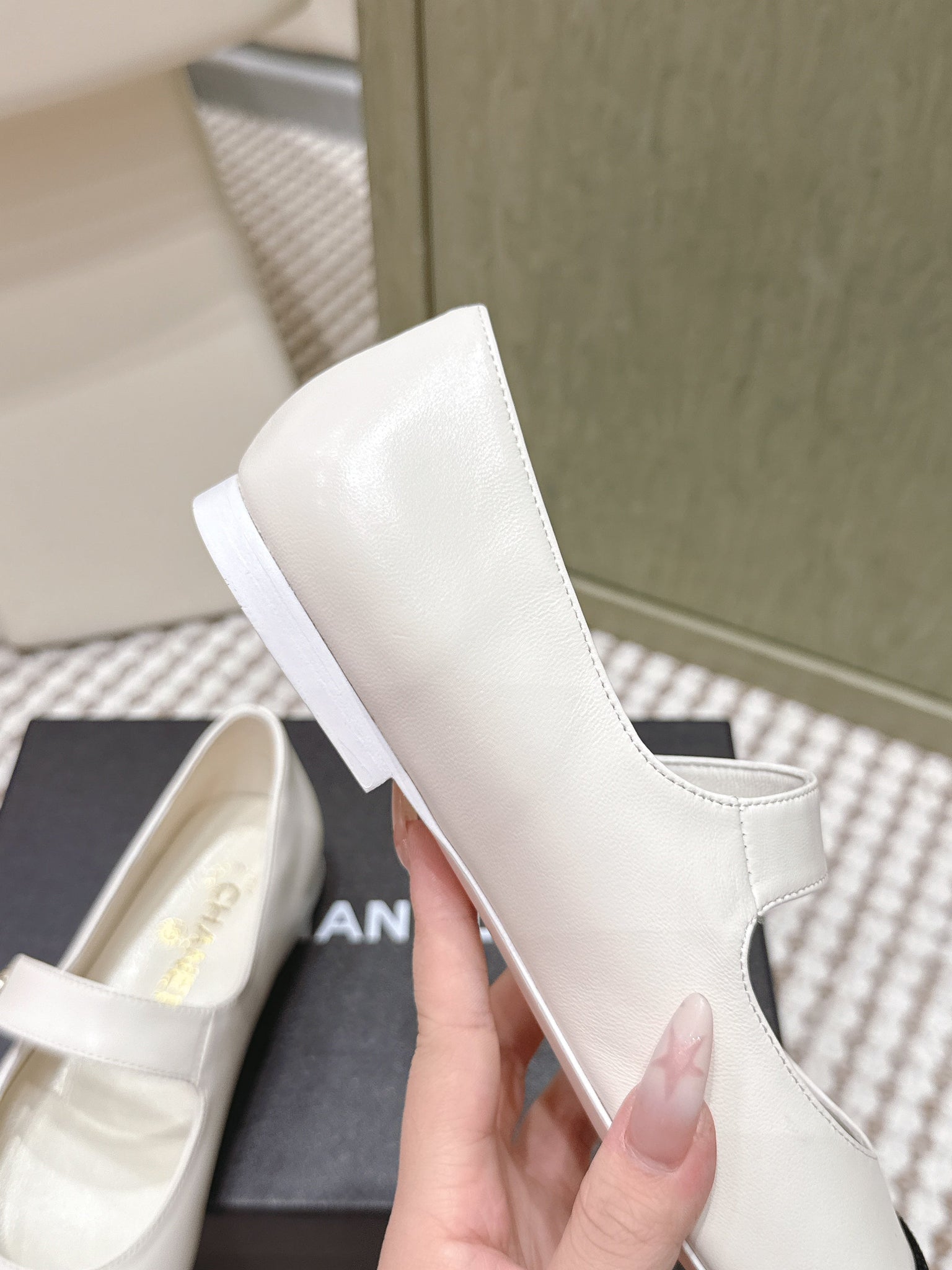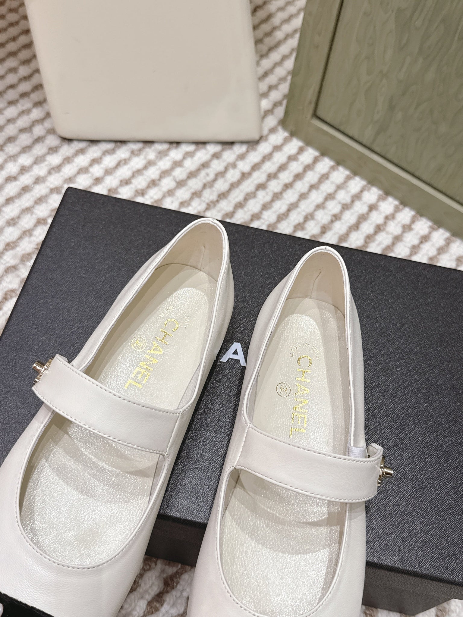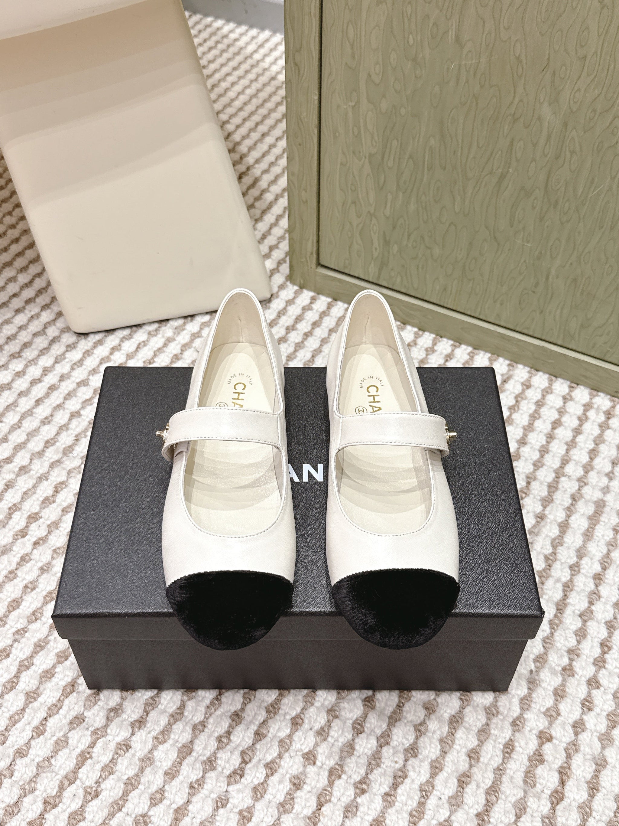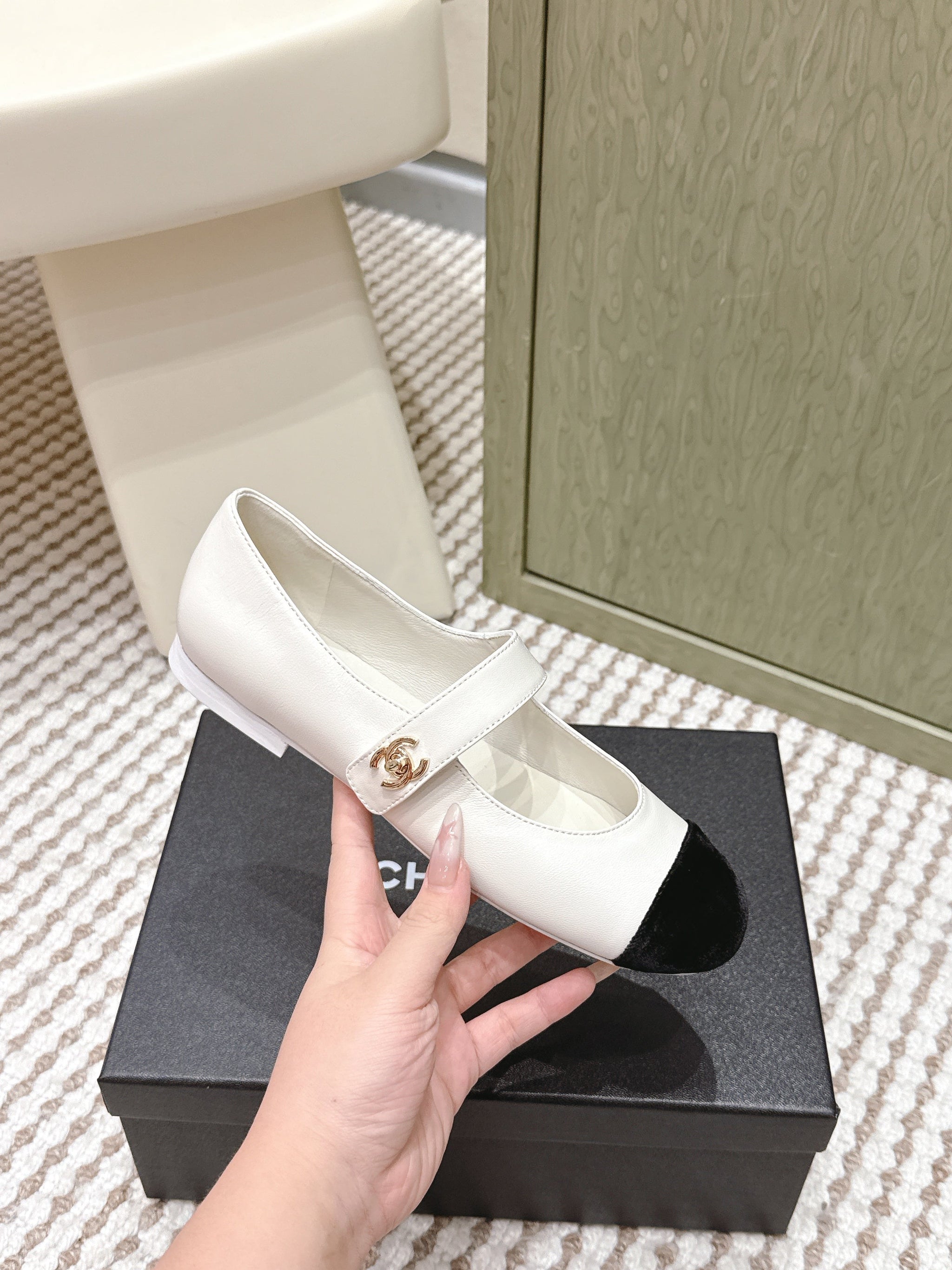 CHANEL 25S MARY JANE FLAT IN WHITE LAMBSKIN WITH BLACK VELVET CAP TOE