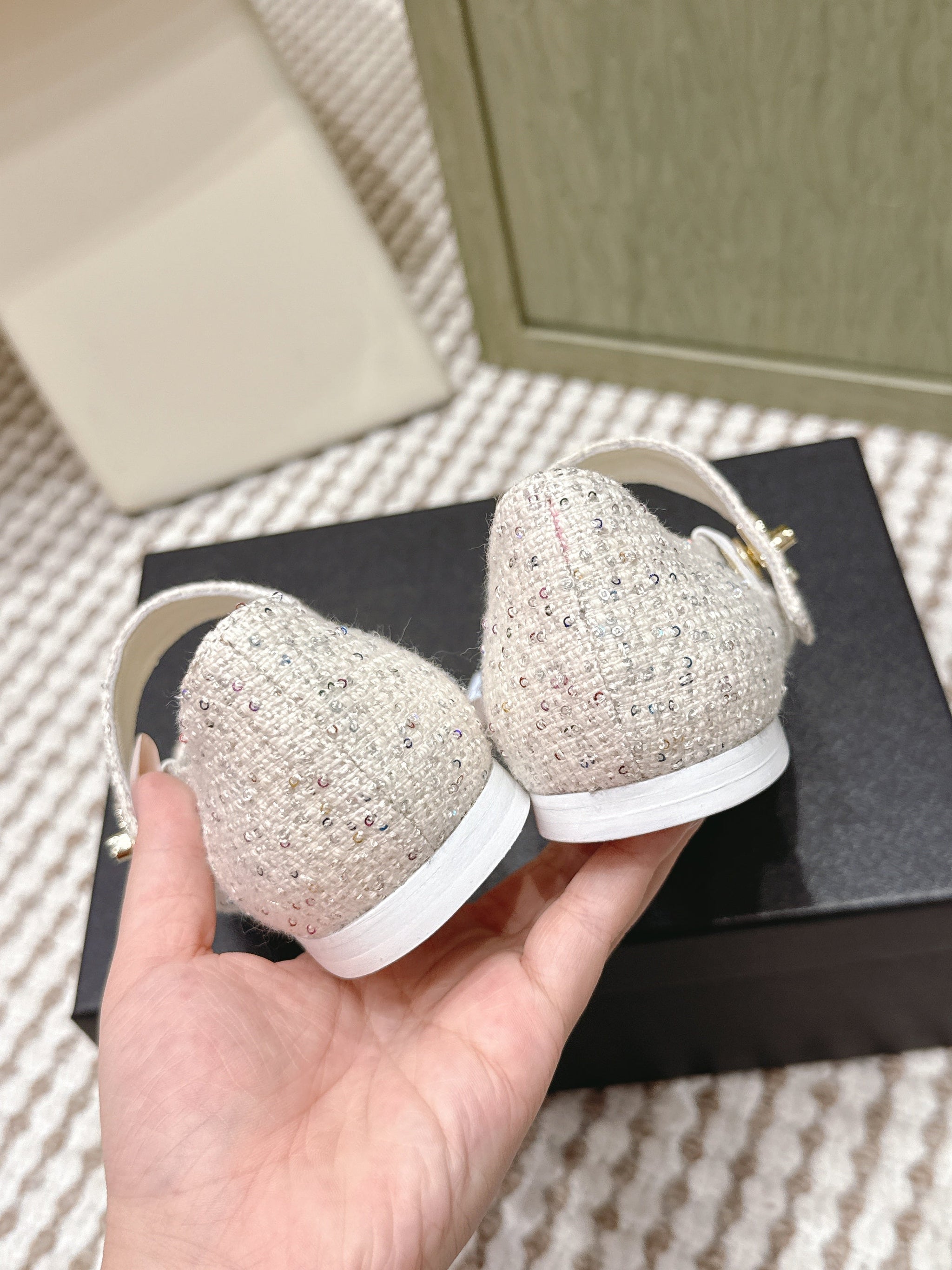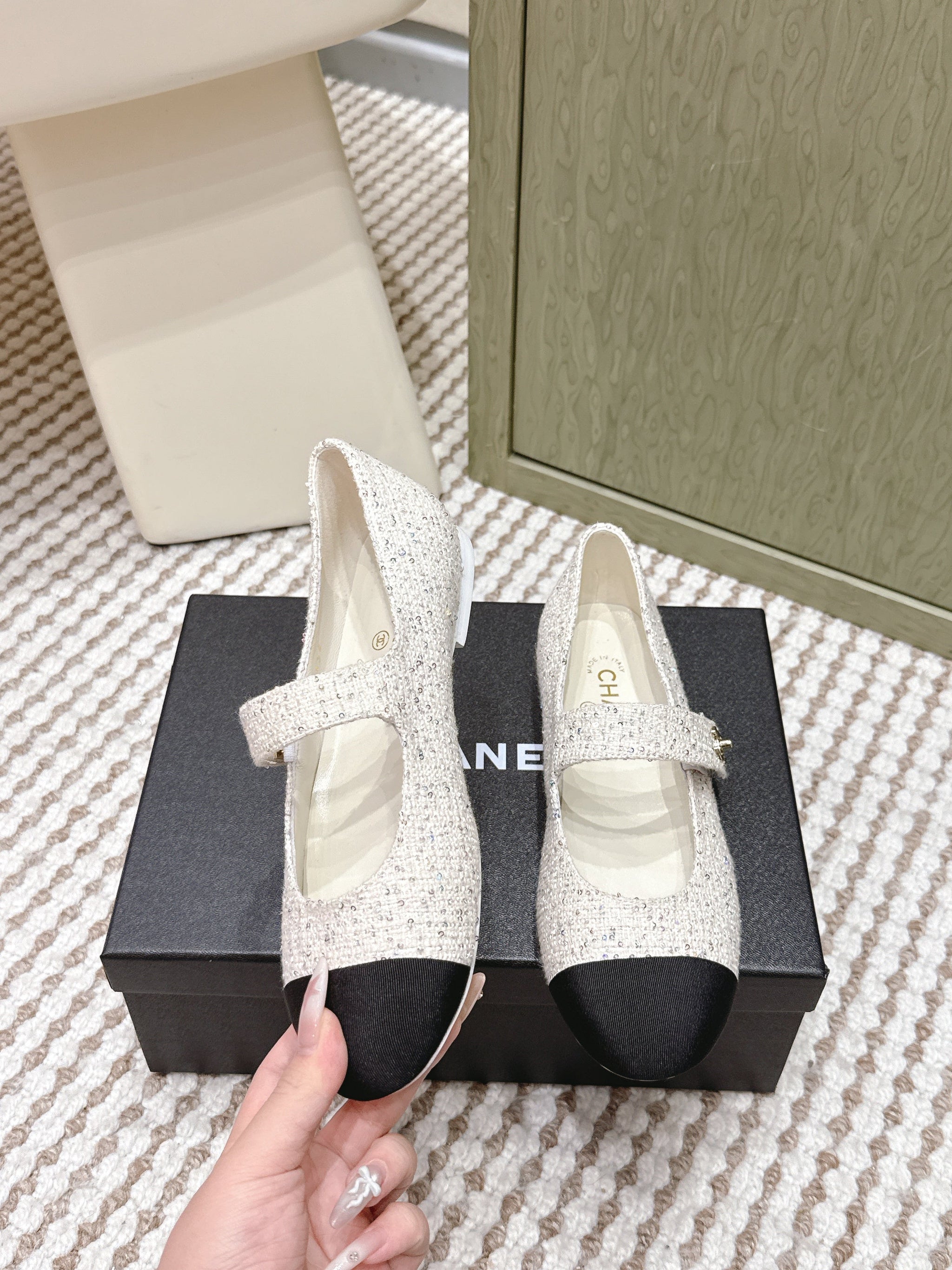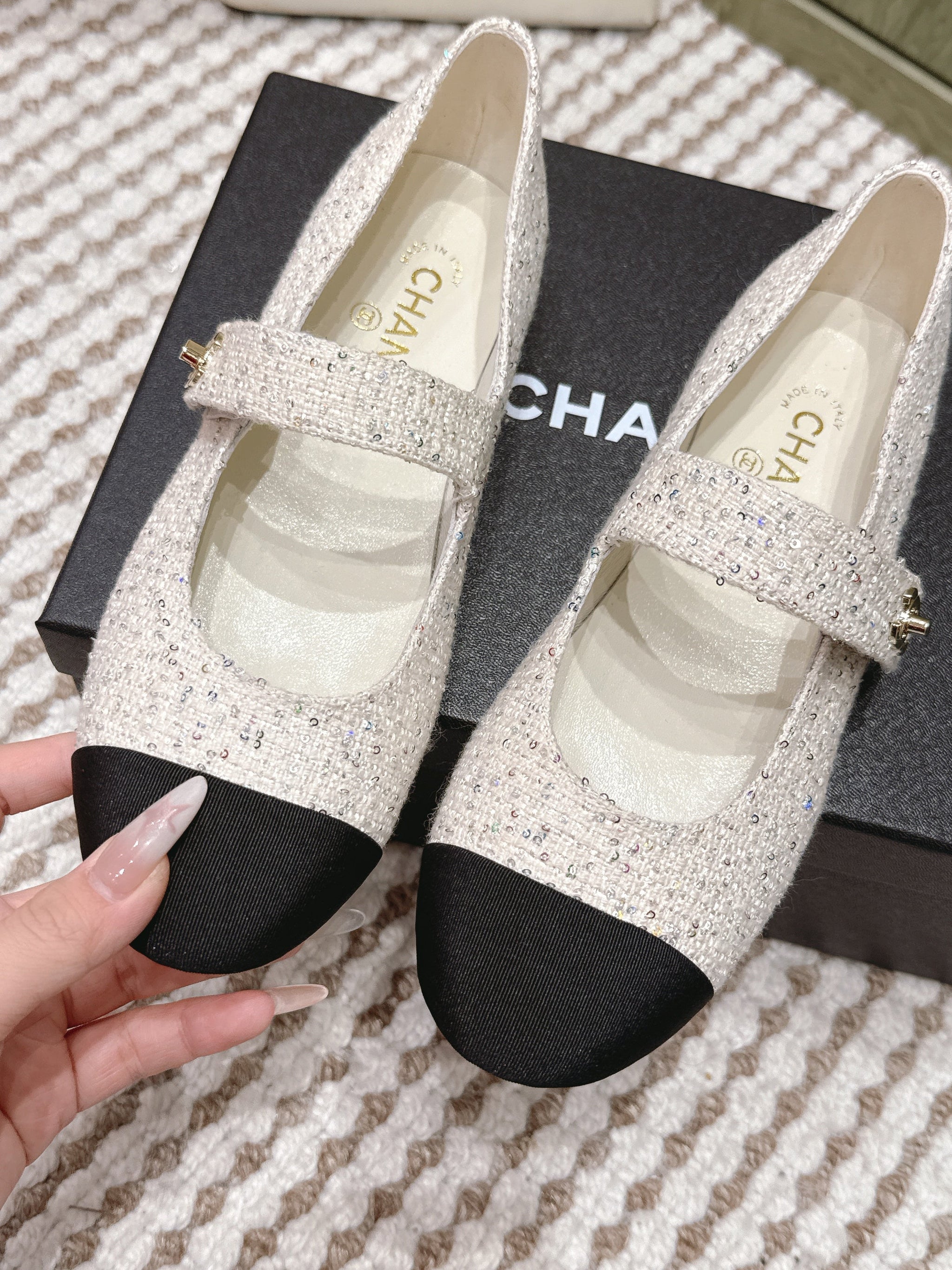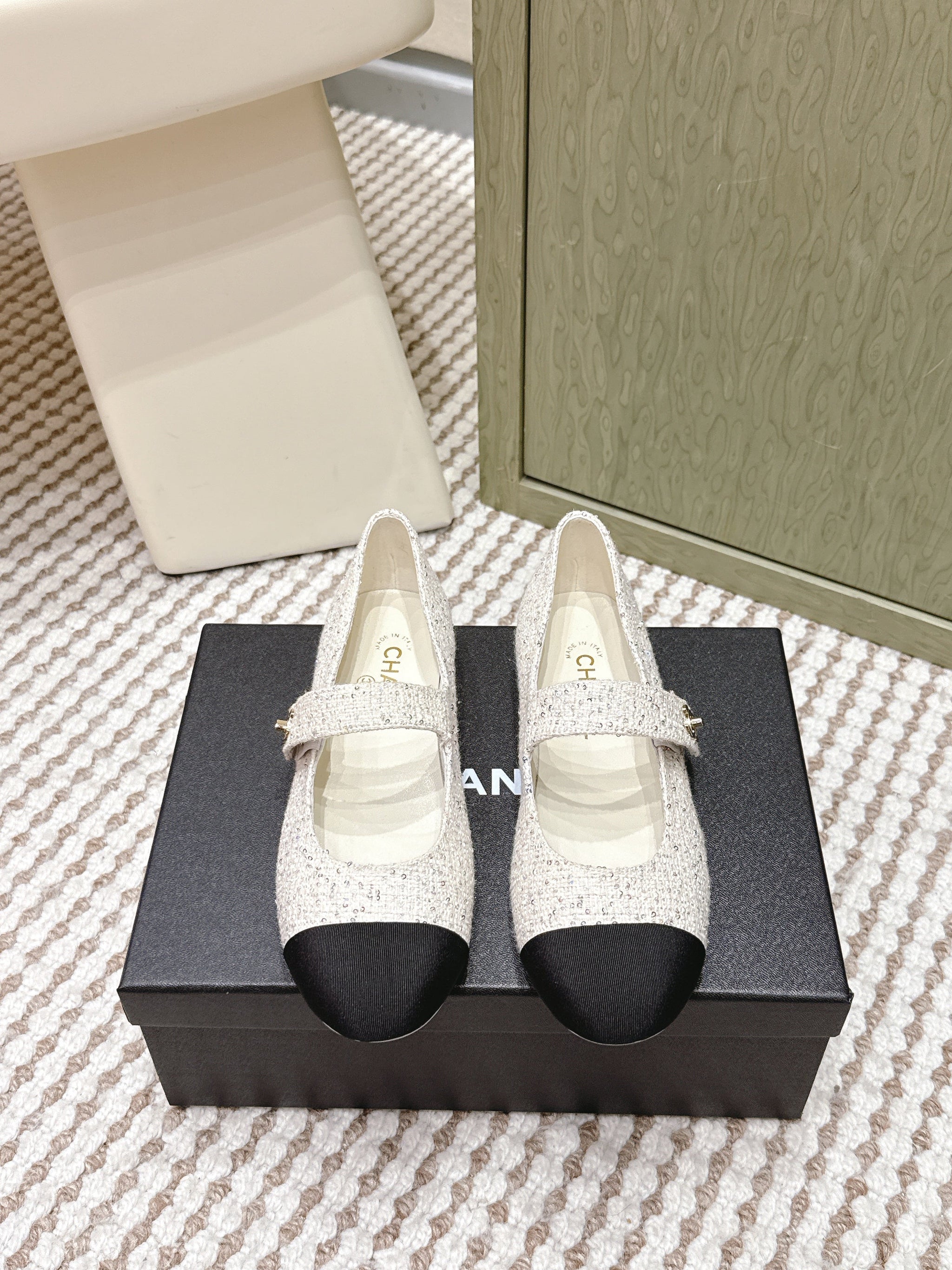 CHANEL 25S MARY JANE FLAT IN WHITE TWEED WITH BLACK CAP TOE GOLD HARDWARE
