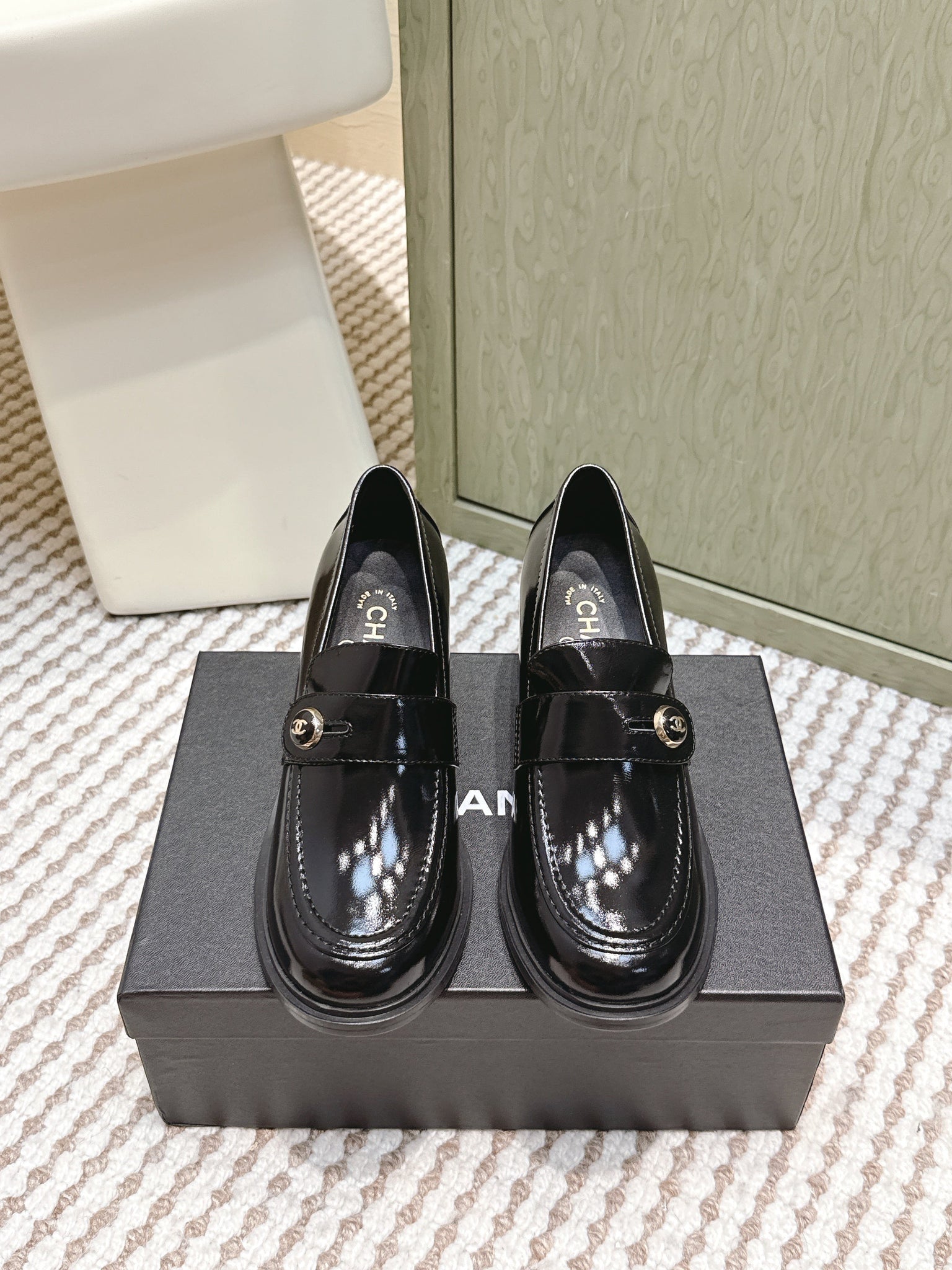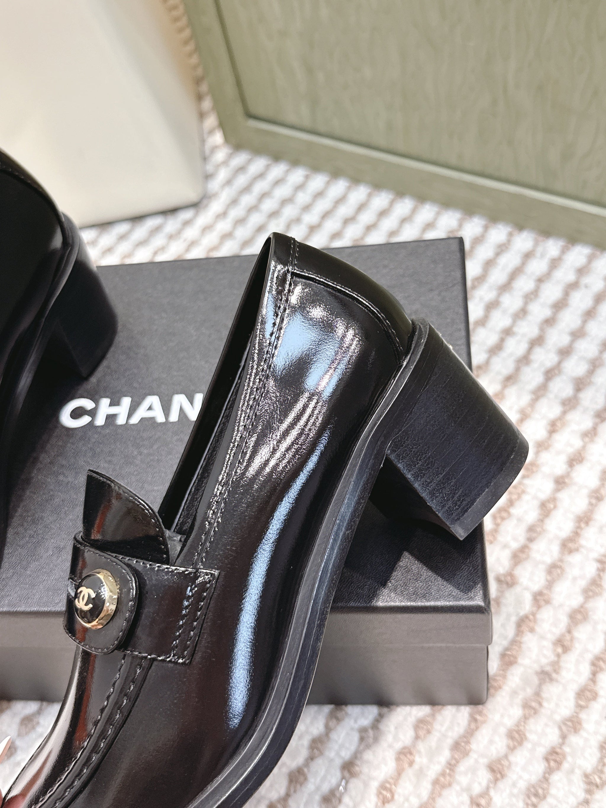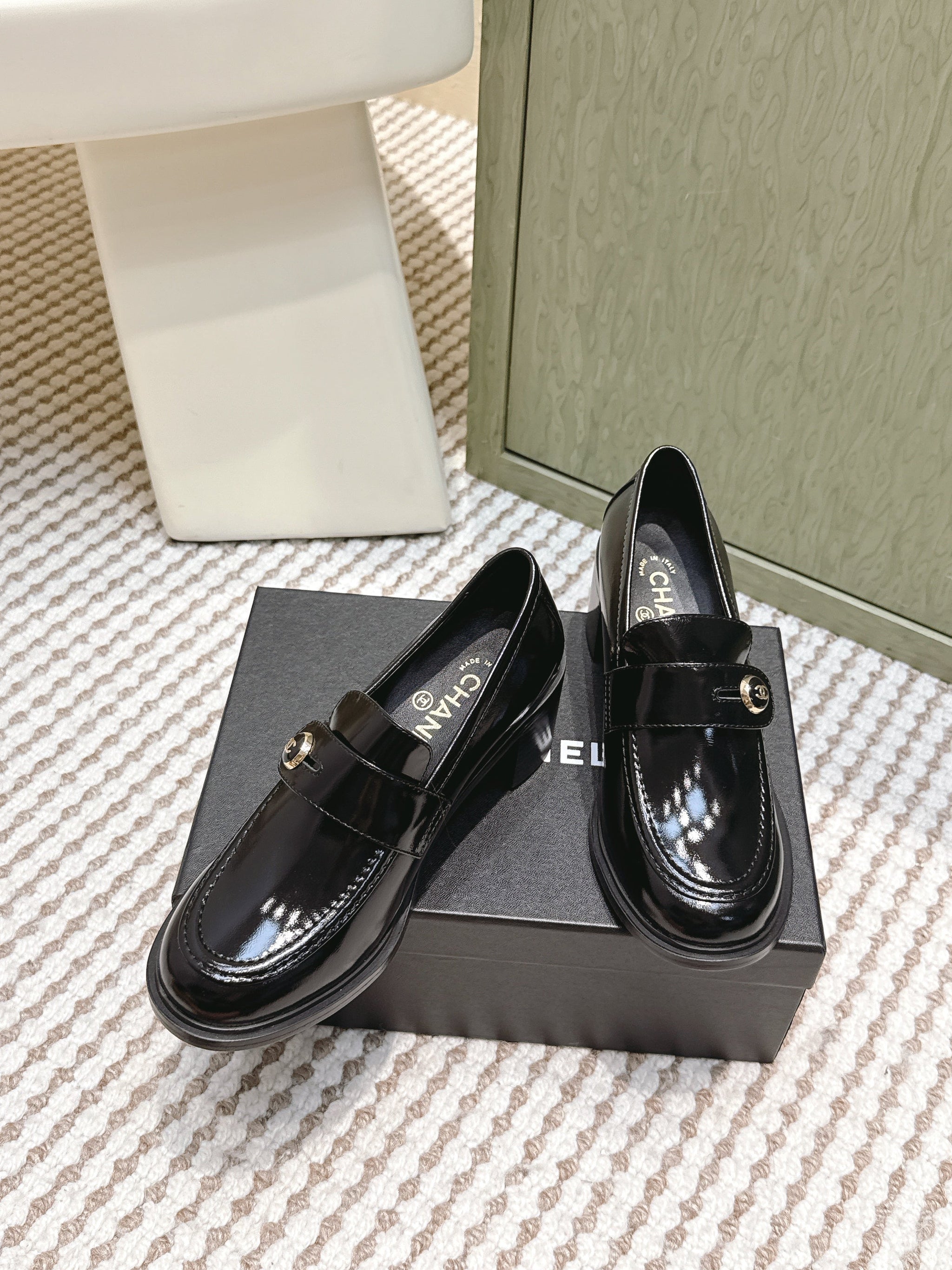 CHANEL 25S GODDESS MOCCASIN LOAFERS 65MM IN BLACK GLOSSY CALFSKIN GOLD HARDWARE