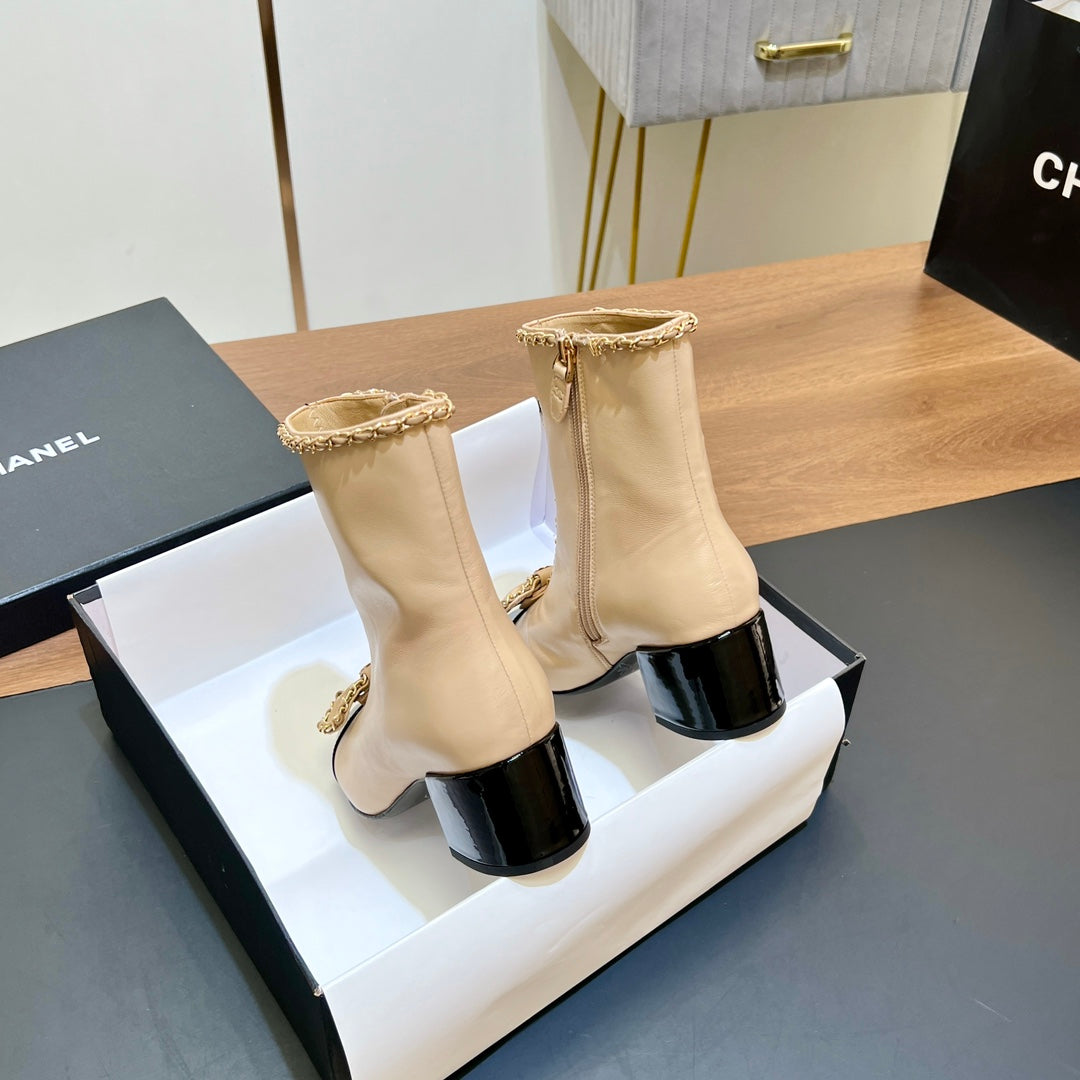 CHANEL 25S HEELED CHAIN BOOTS WITH BOW IN BEIGE CALFSKIN GOLD HARDWRE