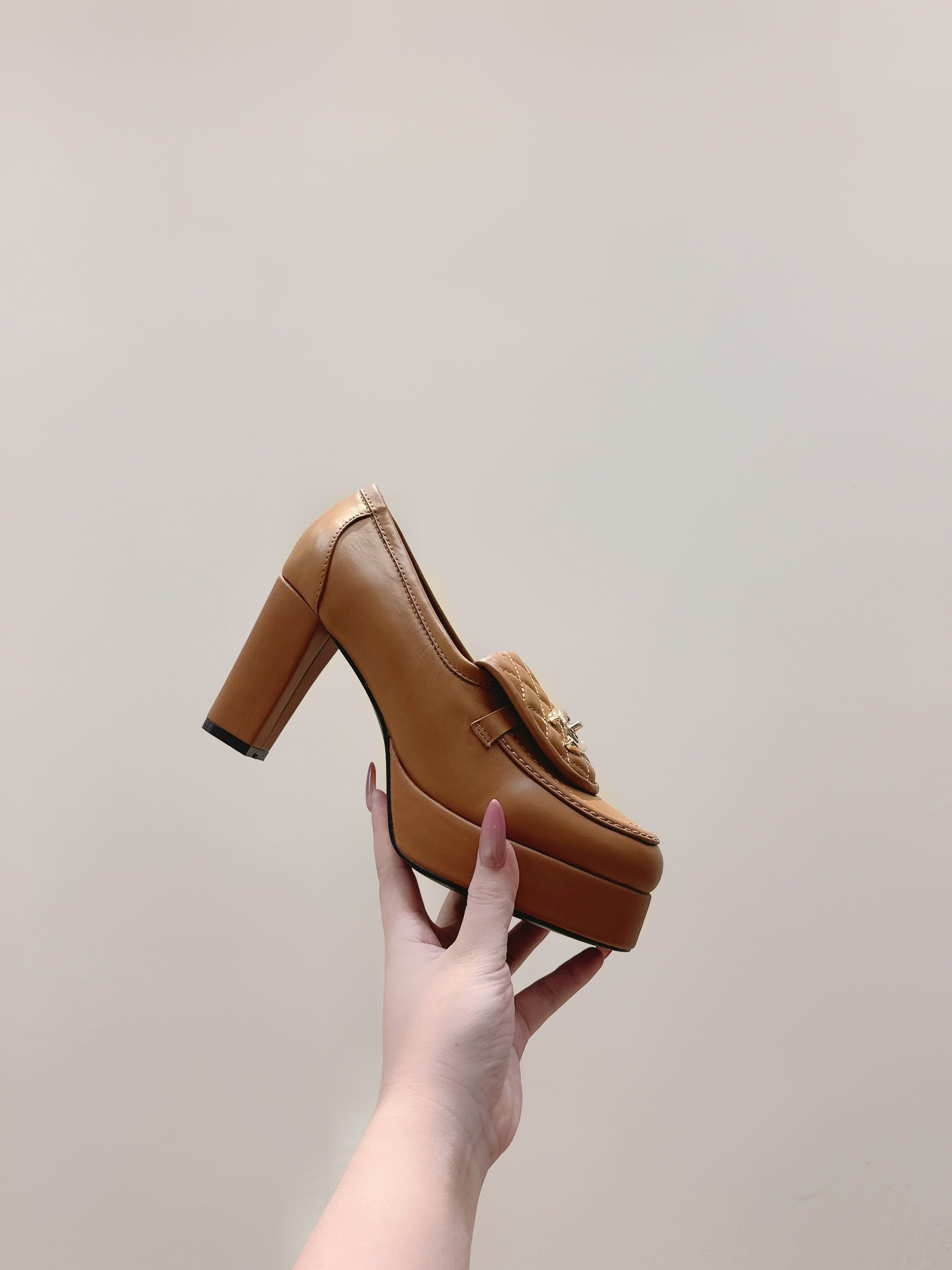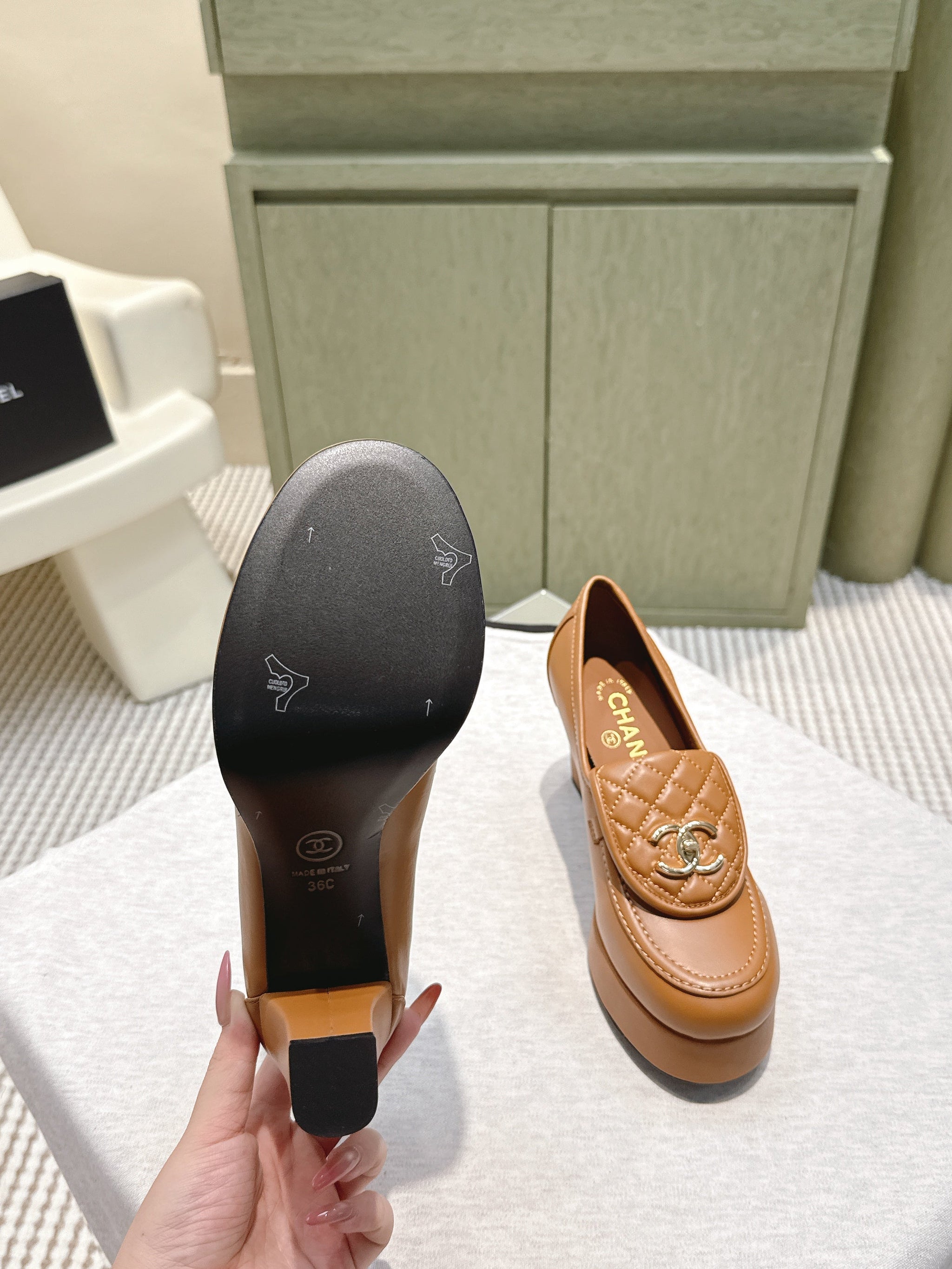 CHANEL 25S HIGH-HEELED MOCCASINS 80MM IN CARAMEL CALFSKIN GOLD HARDWARE