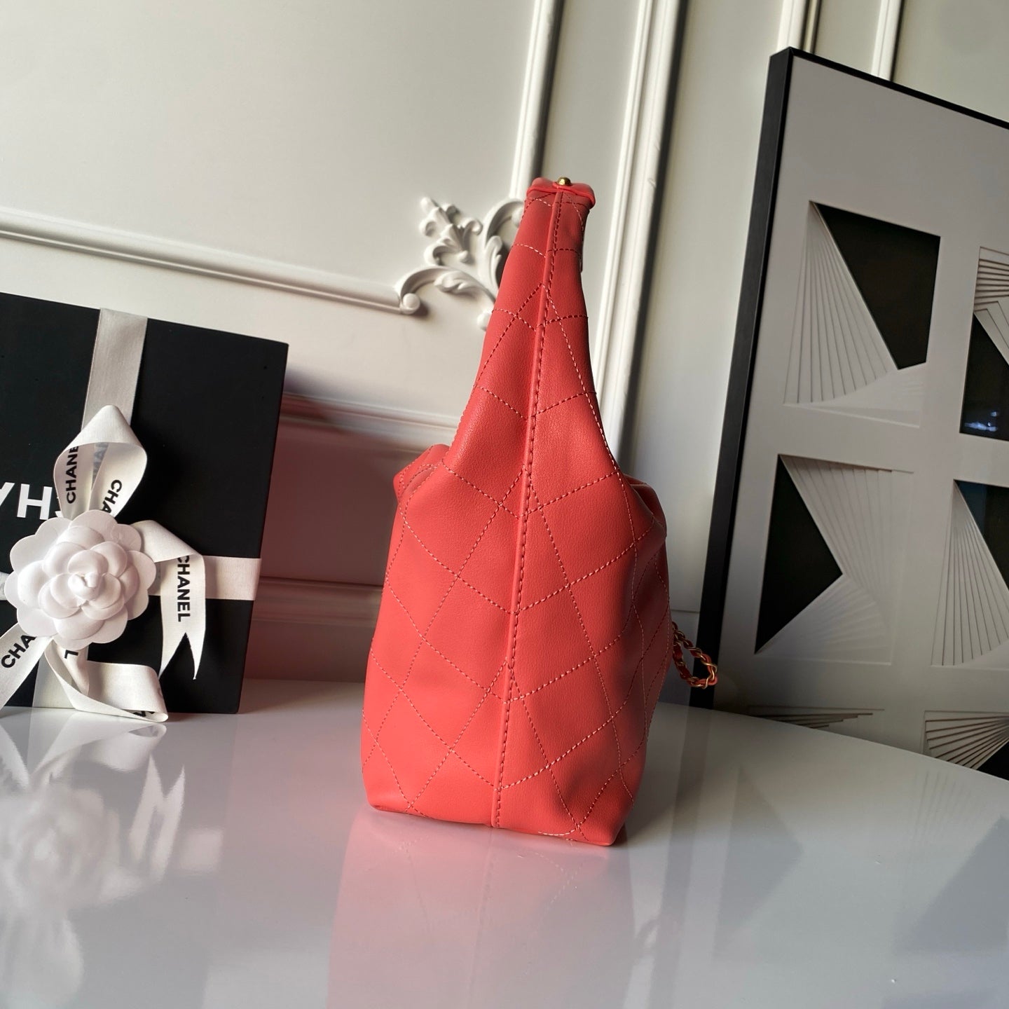 CHANEL 25S HOBO BAG 32 IN CORAL RED LAMBSKIN