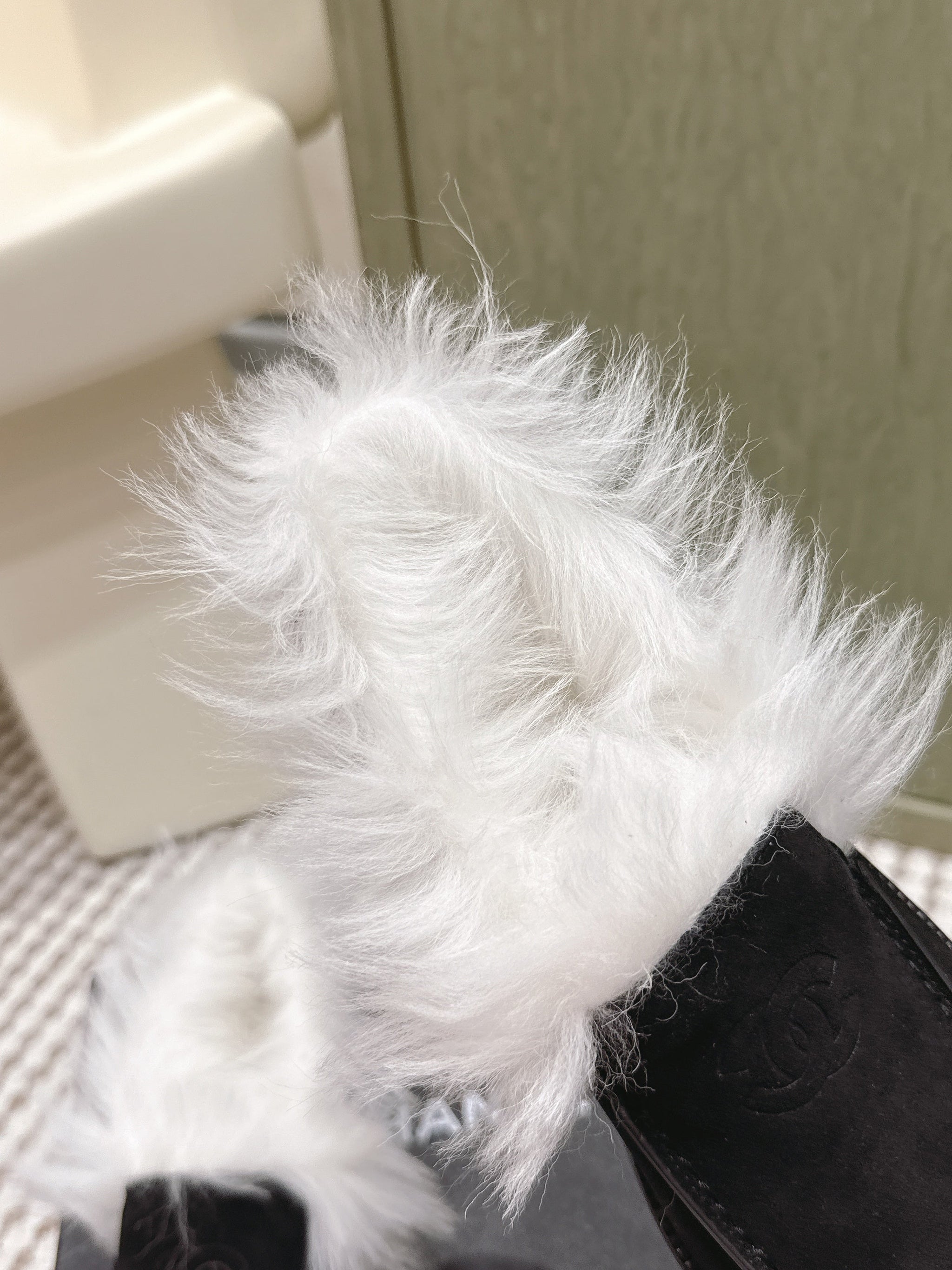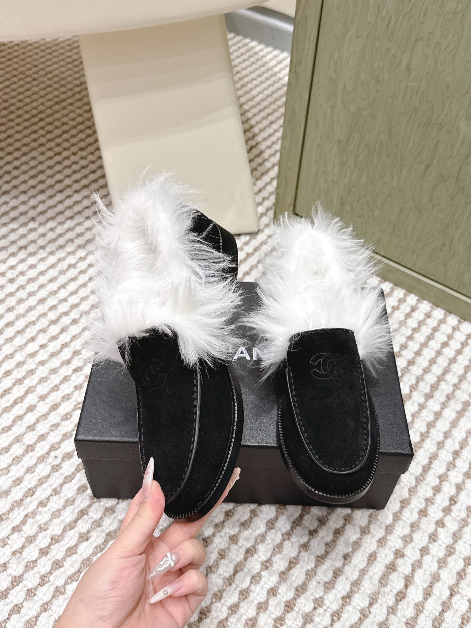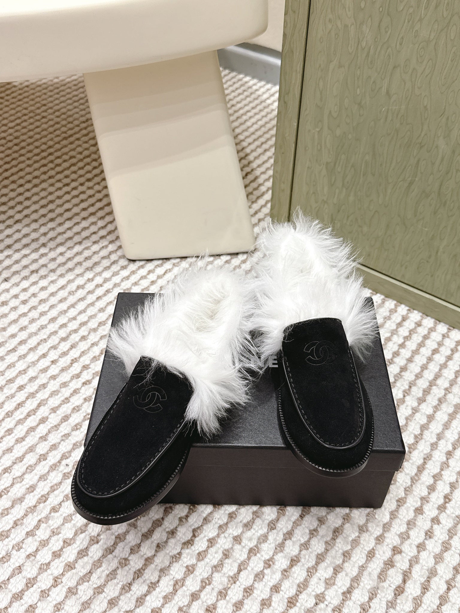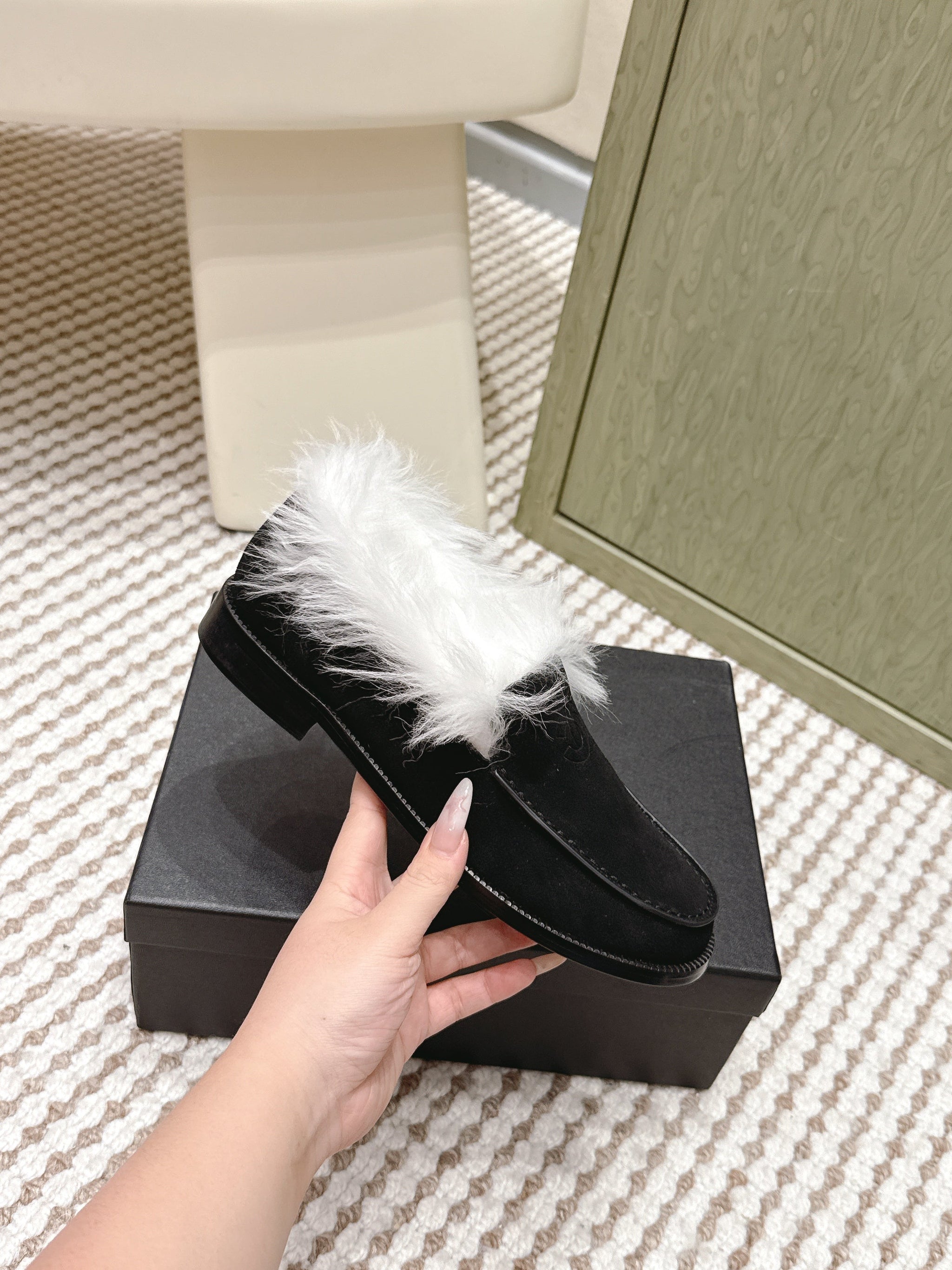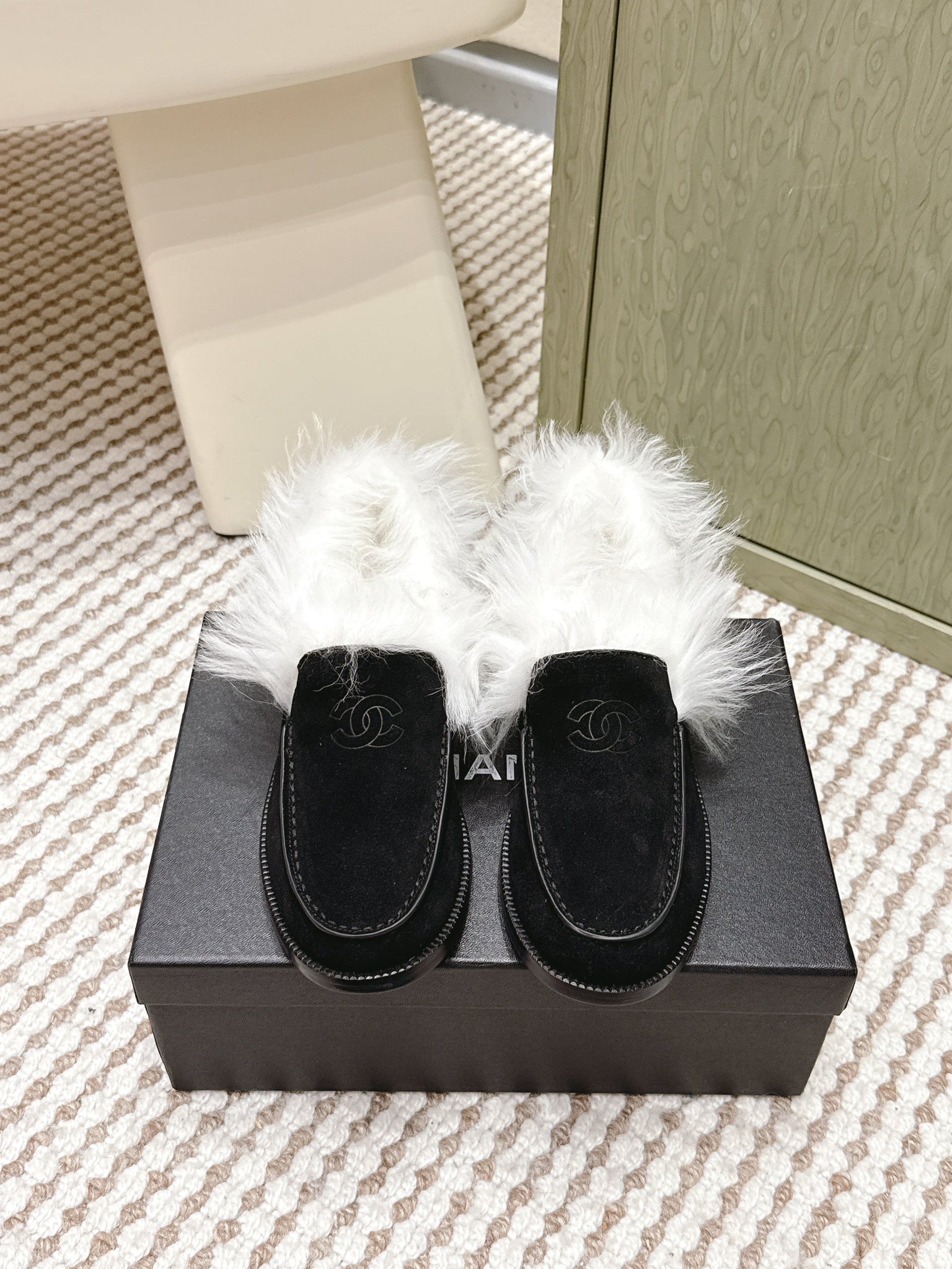 CHANEL 25S LOAFERS MOCCASIN IN BLACK SUEDE WITH WHITE MINK FUR LINING