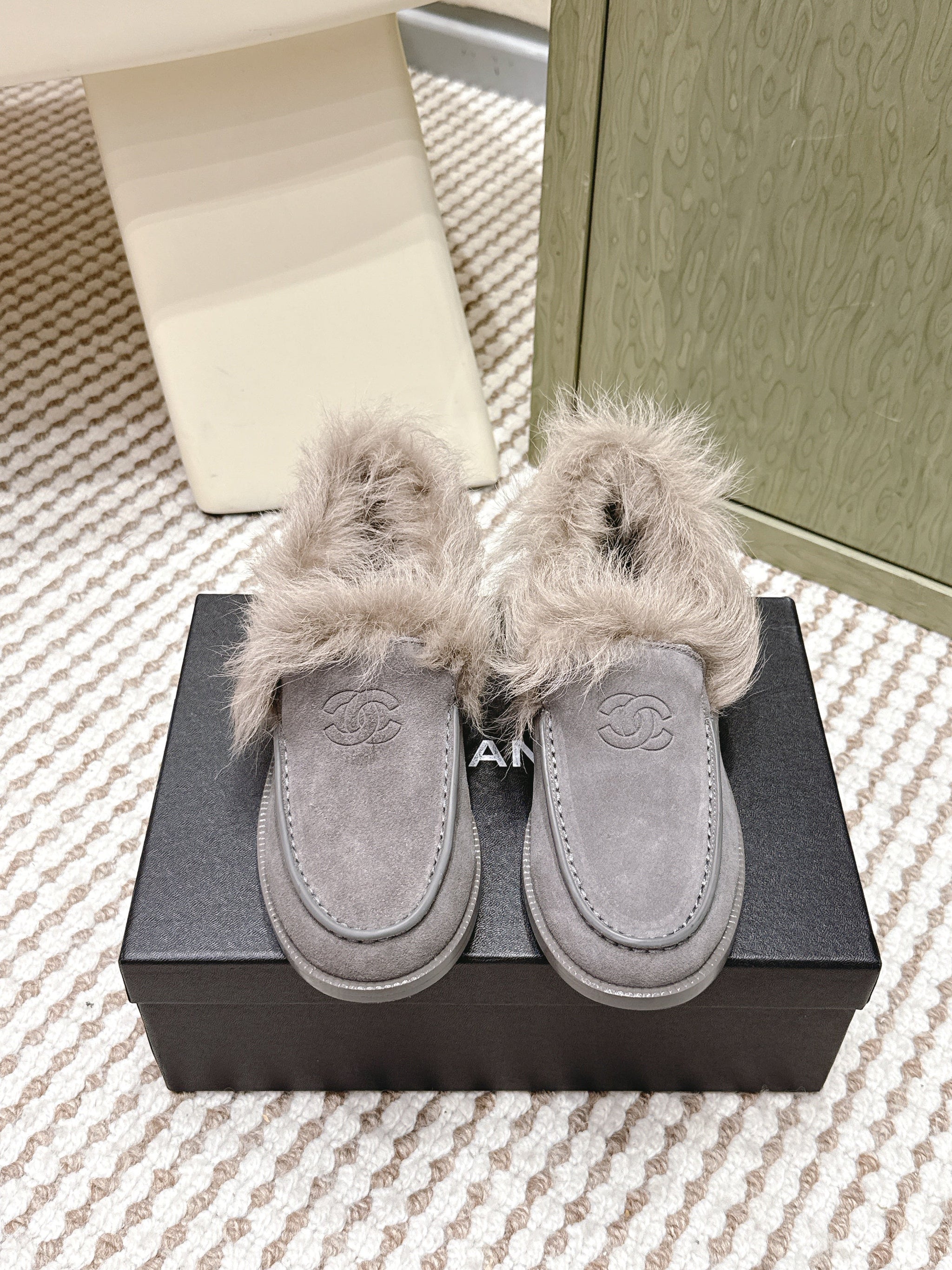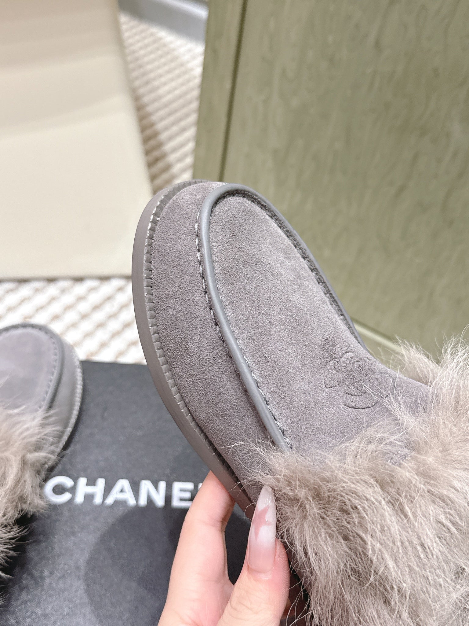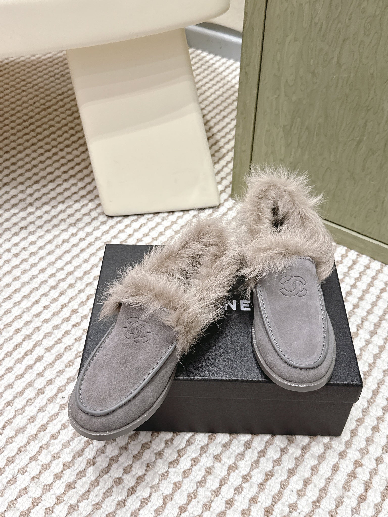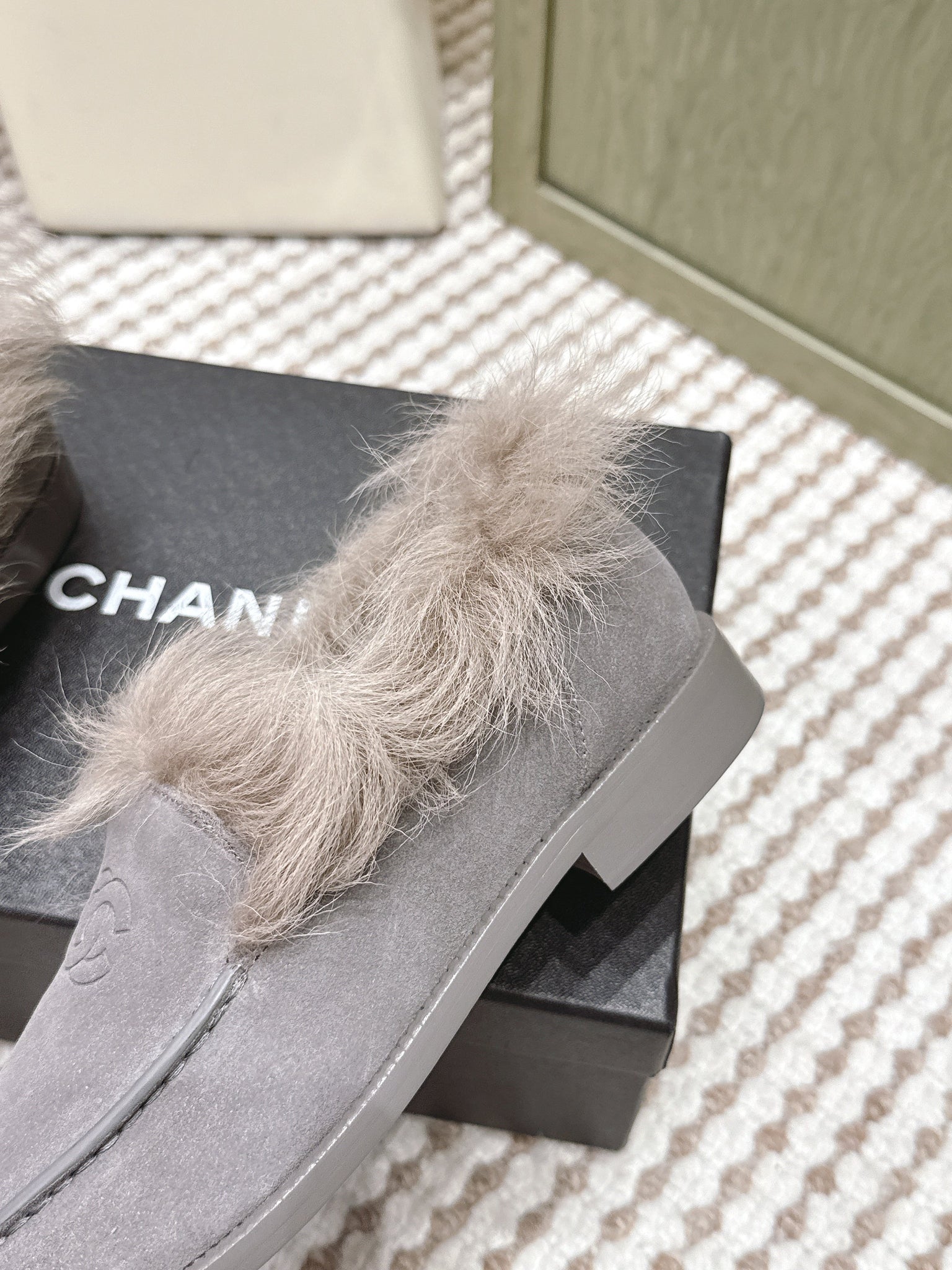 CHANEL 25S LOAFERS MOCCASIN IN LIGHT GRAY SUEDE WITH LIGHT BEIGE MINK FUR LINING