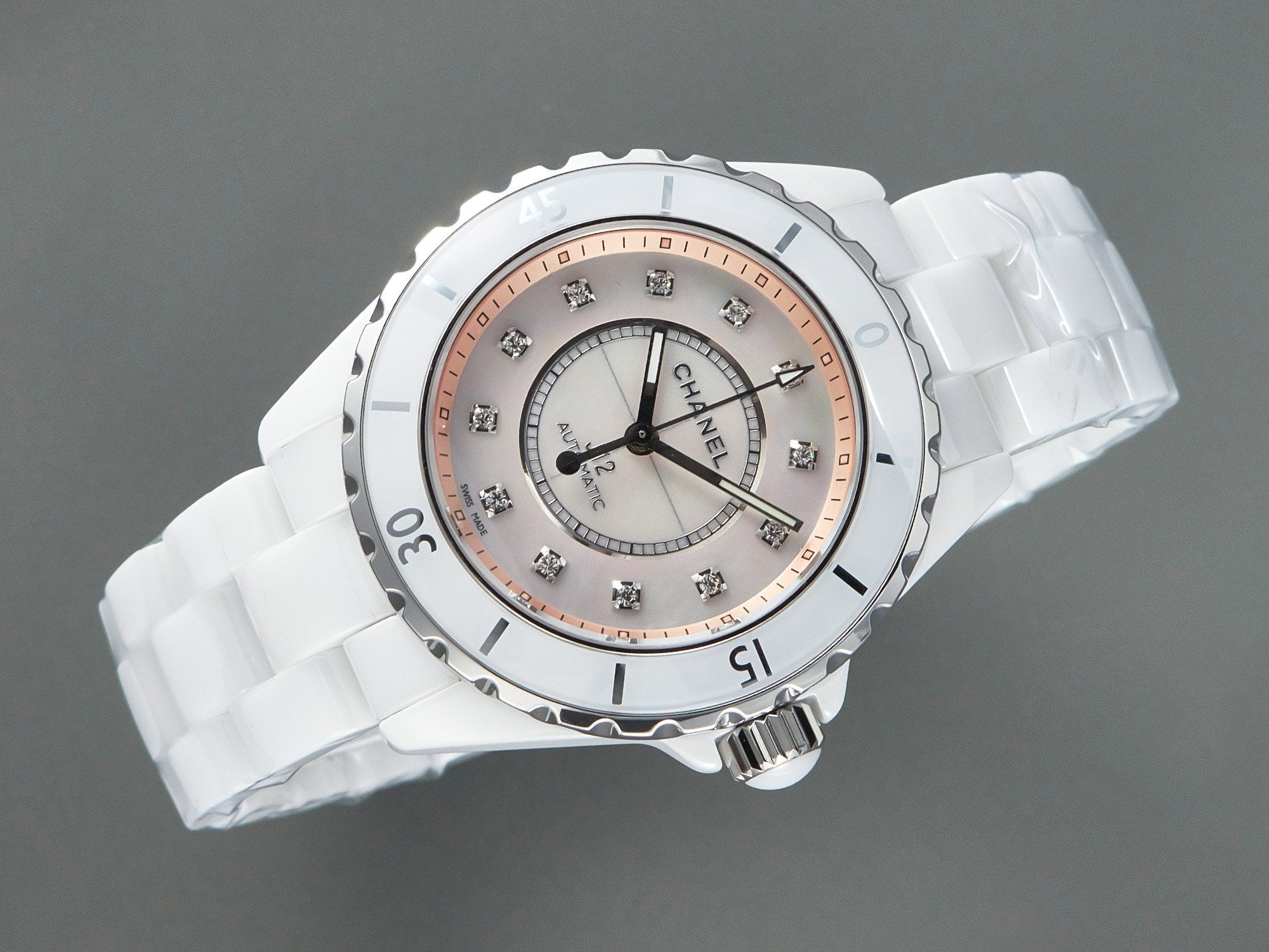 J12 Automatic White Ceramic Diamond Numerals Pink Mop Dial