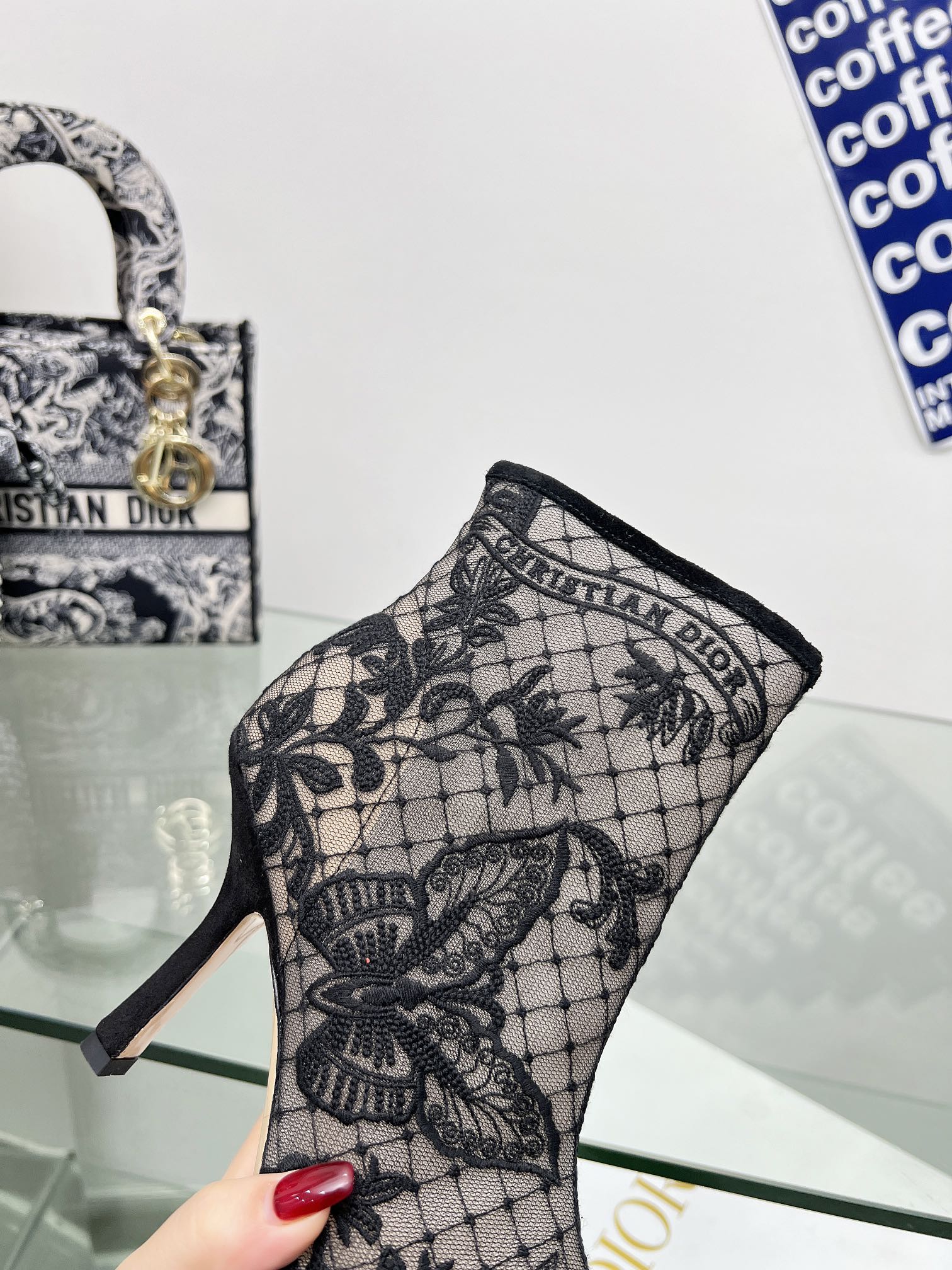DIOR 25S POINTED-TOE ANKLE BOOTS 95 MM IN BLACK MESH TULLE AND SUEDE STYLE 1