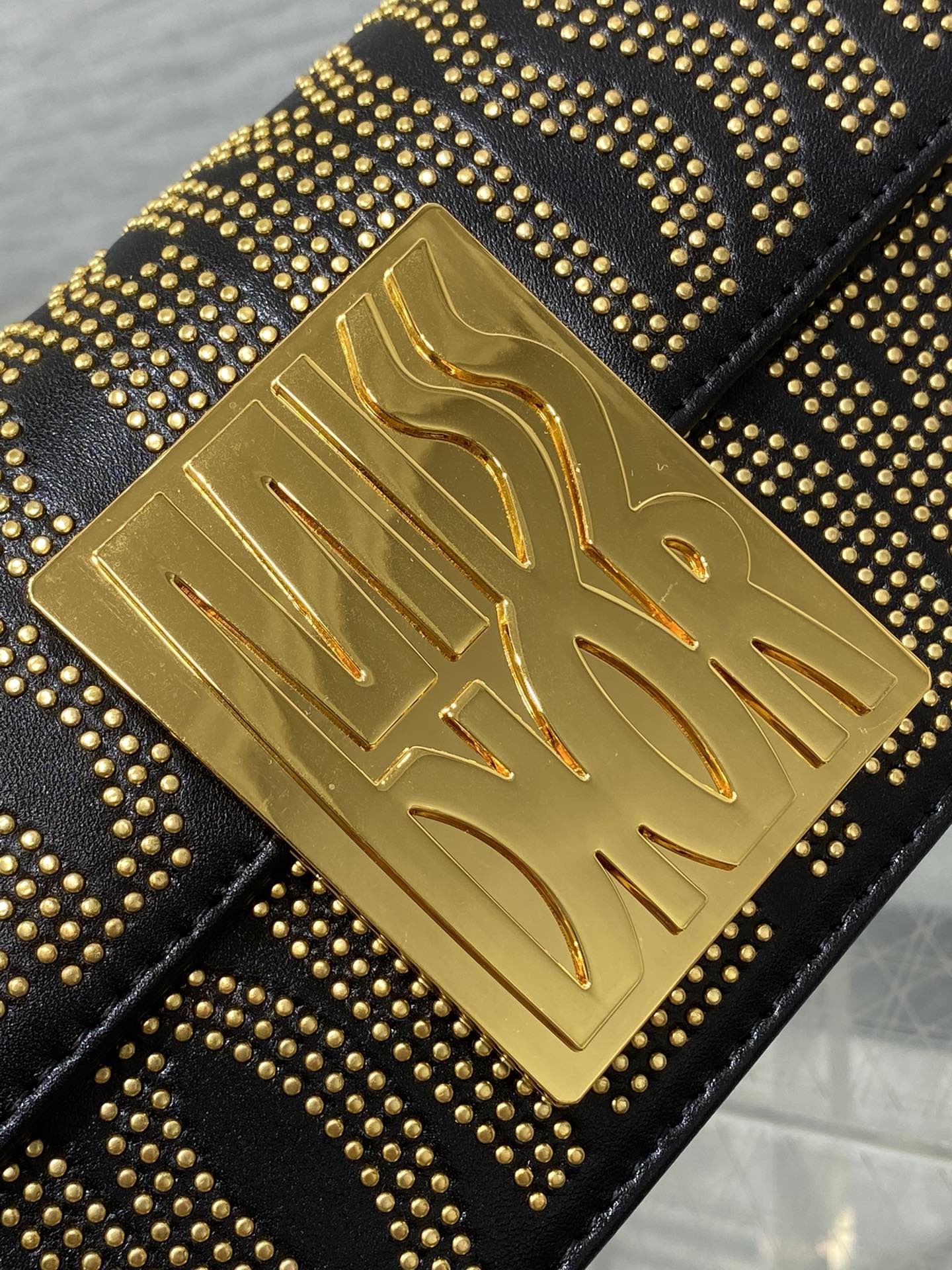MINI FLAP BAG 18 IN BLACK LAMBSKIN WITH GOLD RHINSTONES