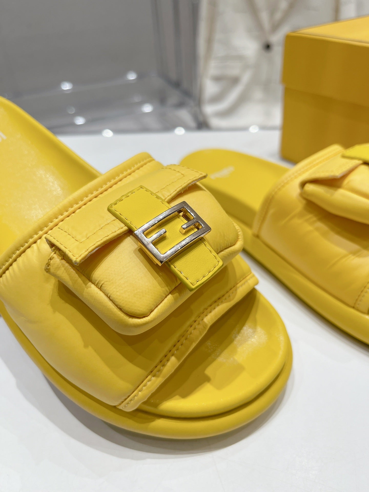 FENDI BAGUETTE SLIPPERS IN NAPLES YELLOW LAMBSKIN WITH GOLD HARDWARE