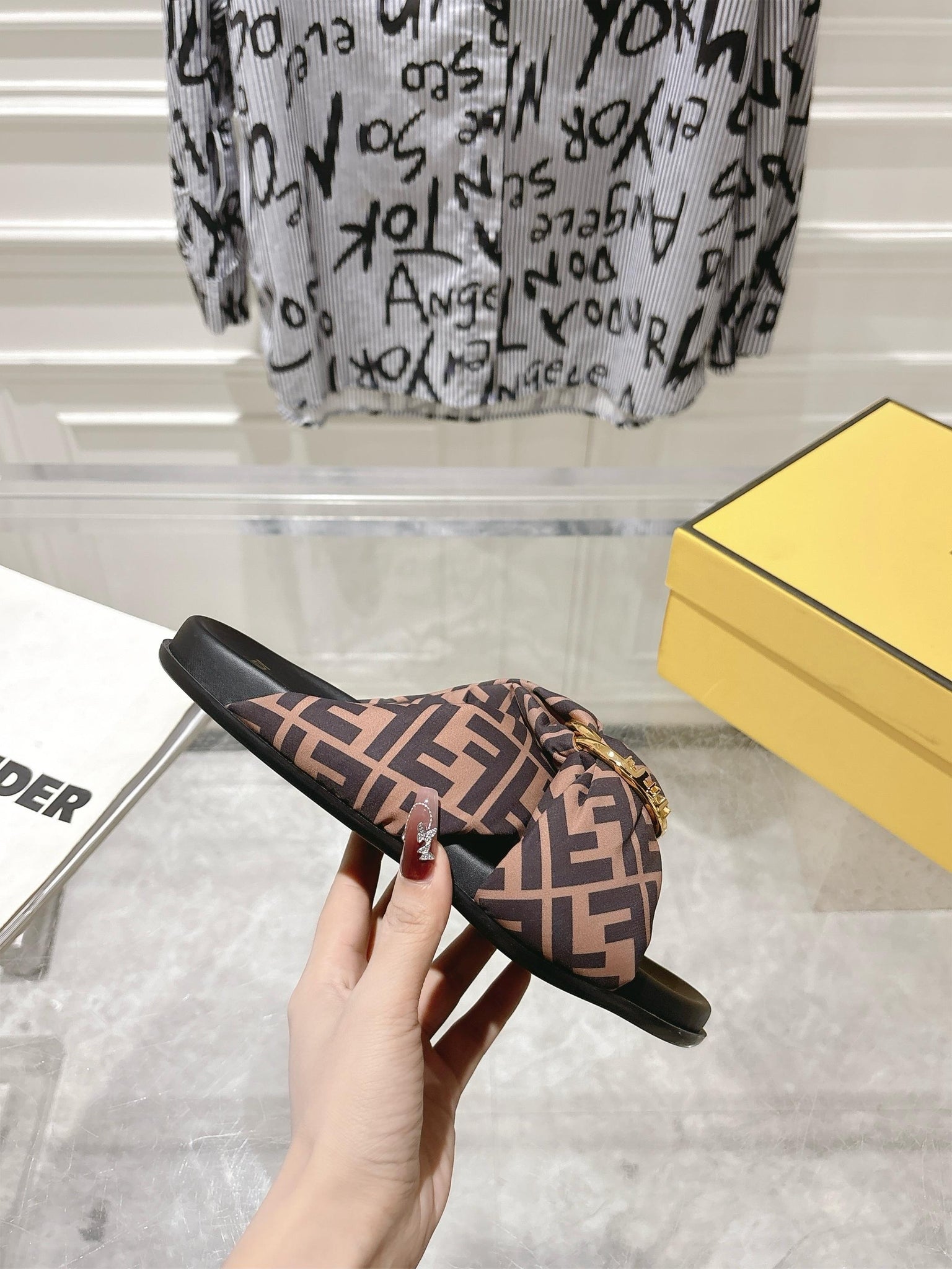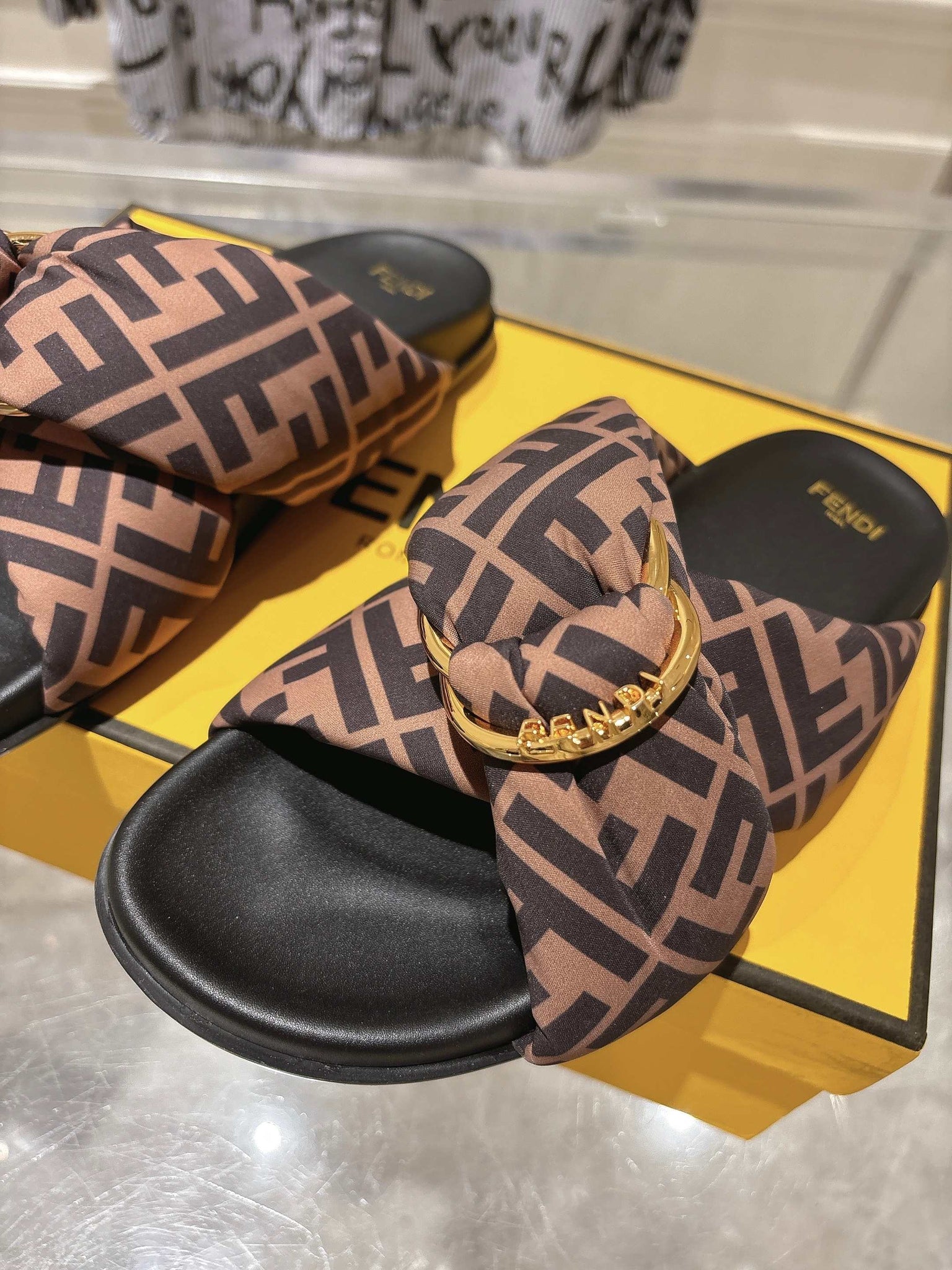 FF KNOT SLIDE SANDALS IN BROWN FABRIC