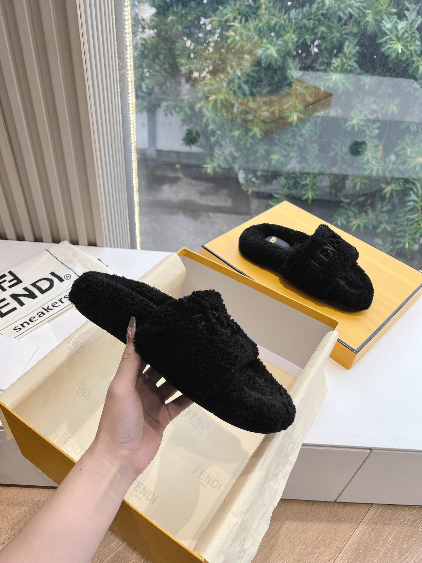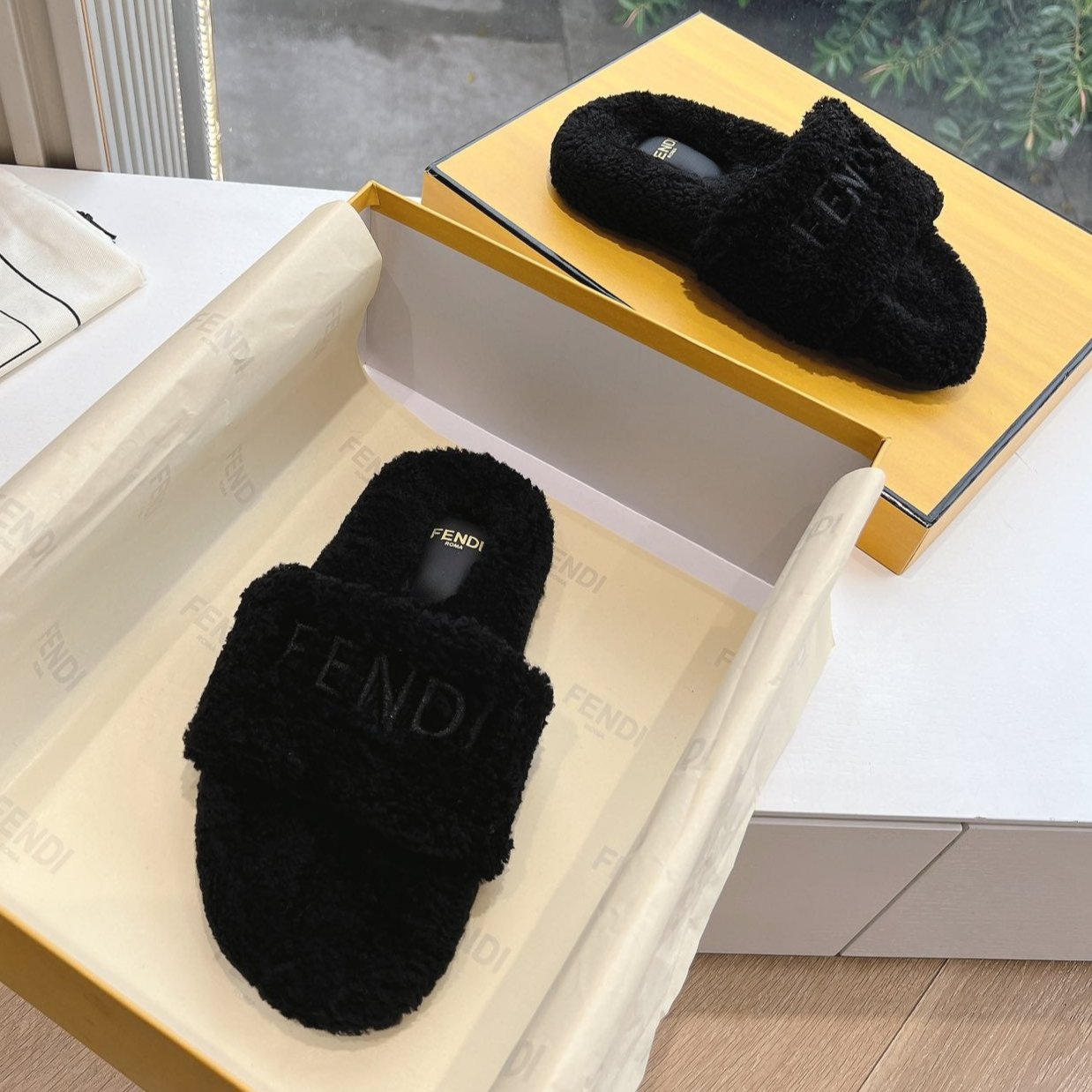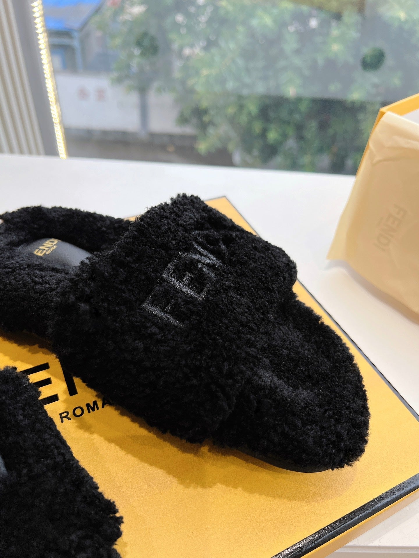 FLAT SLIDE IN BLACK FLEECE