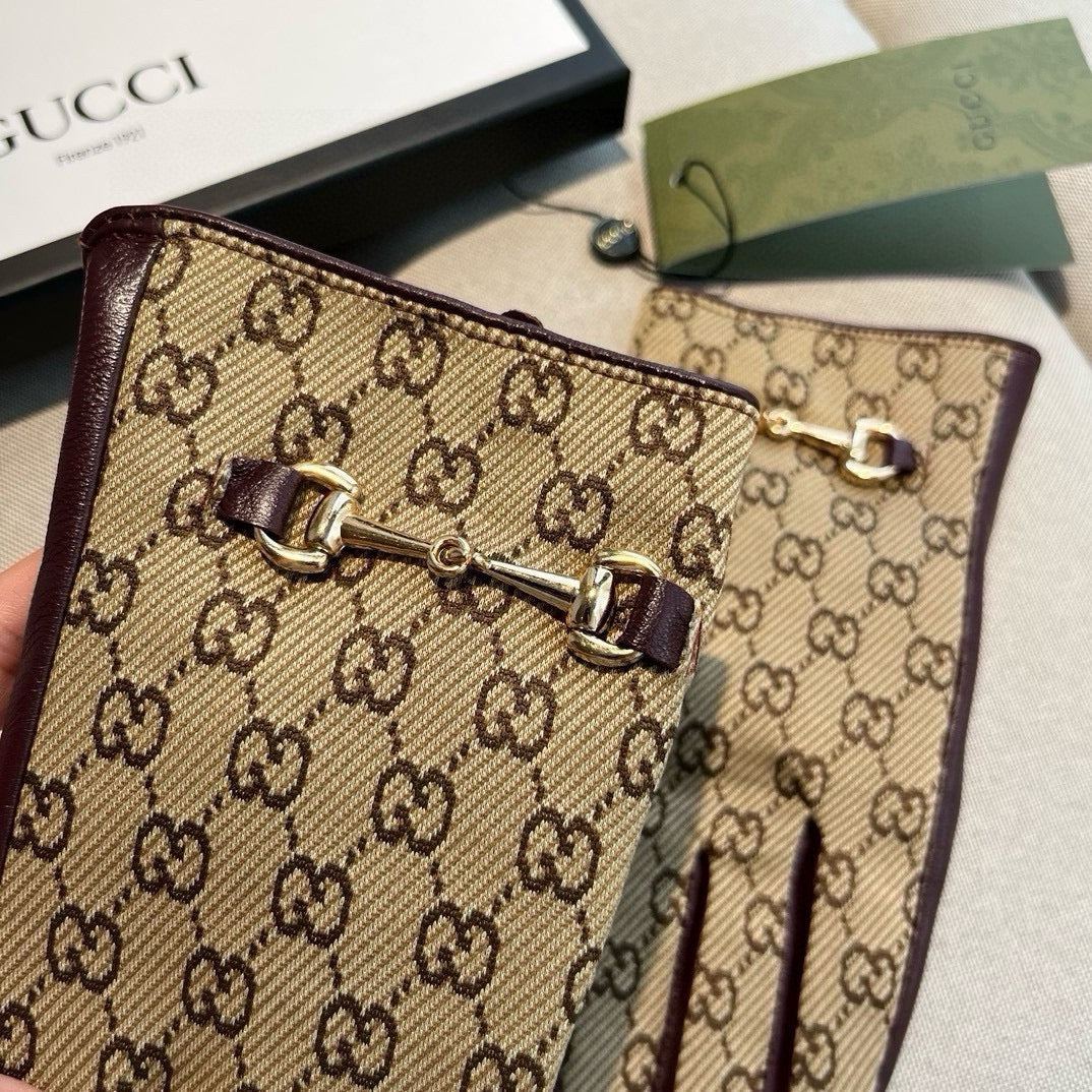 HORSEBIT GLOVES IN BEIGE MONOGRAM JACQUARD FABRIC MIX MERLOT RED SHEEPSKIN 456334