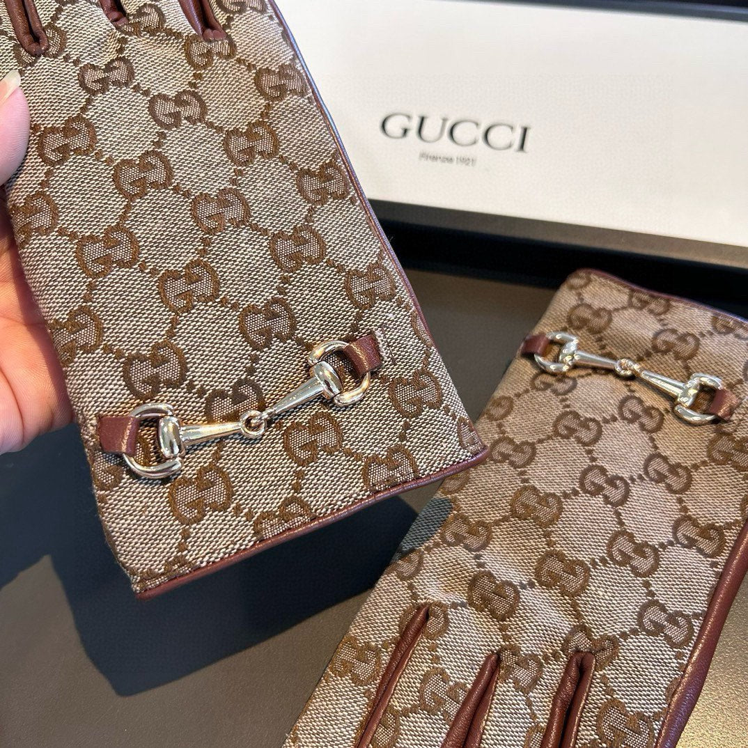 HORSEBIT GLOVES IN BEIGE MONOGRAM JACQUARD FABRIC MIX RED BROWN SHEEPSKIN 456332