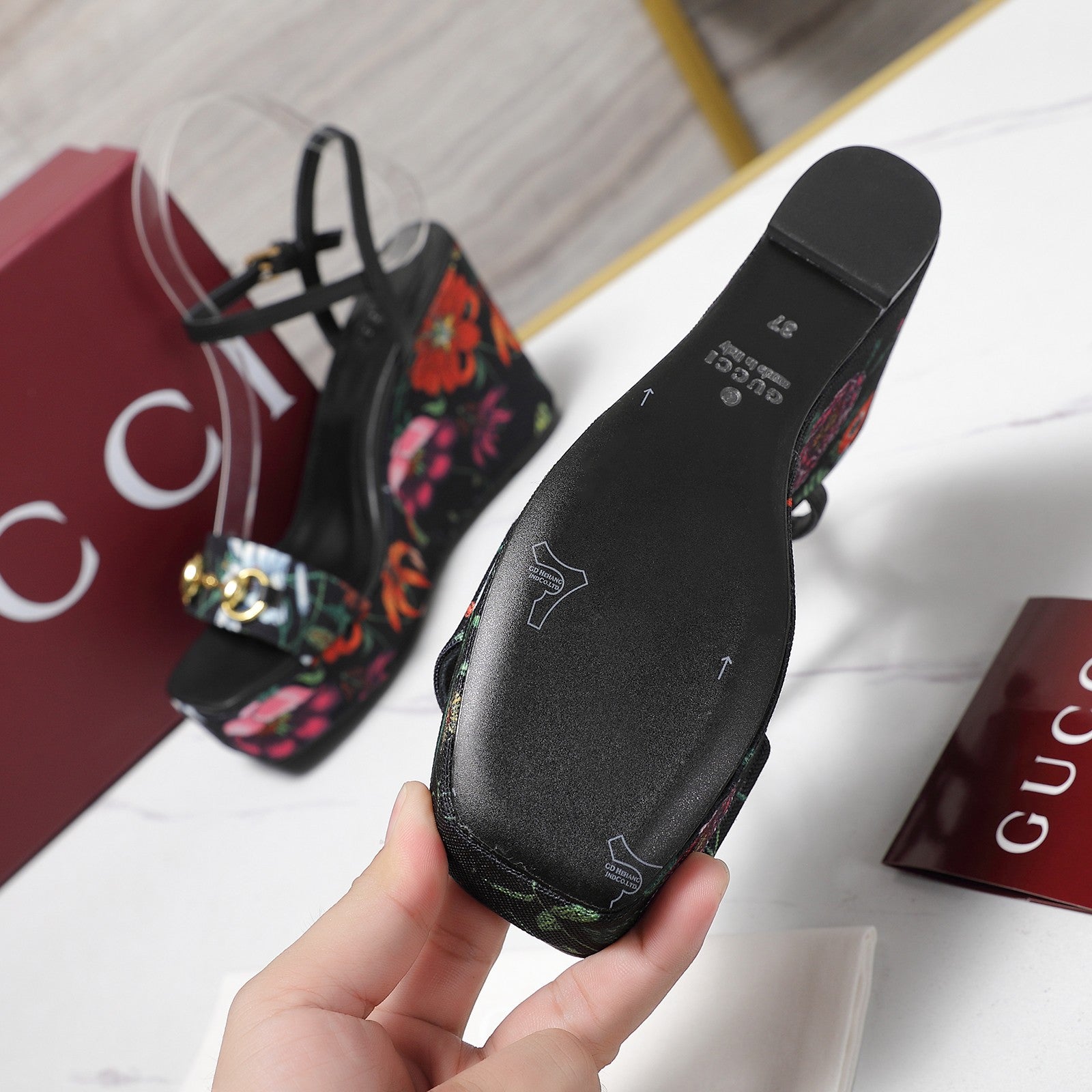 GG WEDGE HEEL SANDALS 100 IN BLACK FABRIC FLORAL PRINT