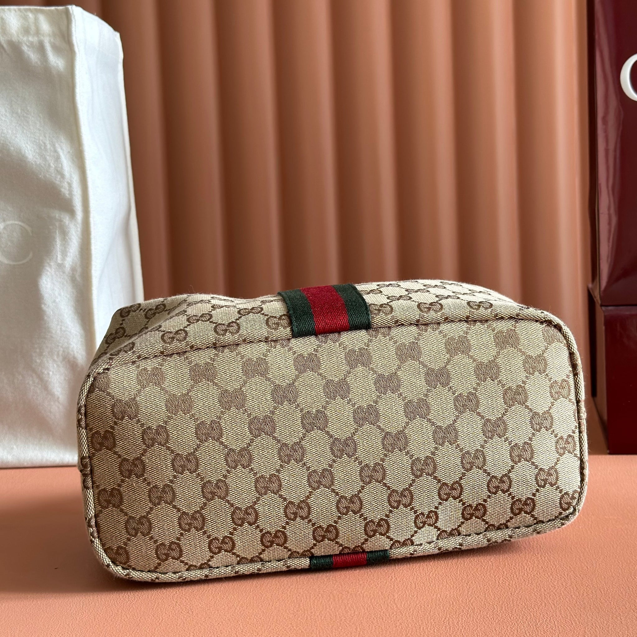 GUCCI 26S GIGLIO TOP HANDLE BAG 27 IN WARM BEIGE AND BROWN CANVAS