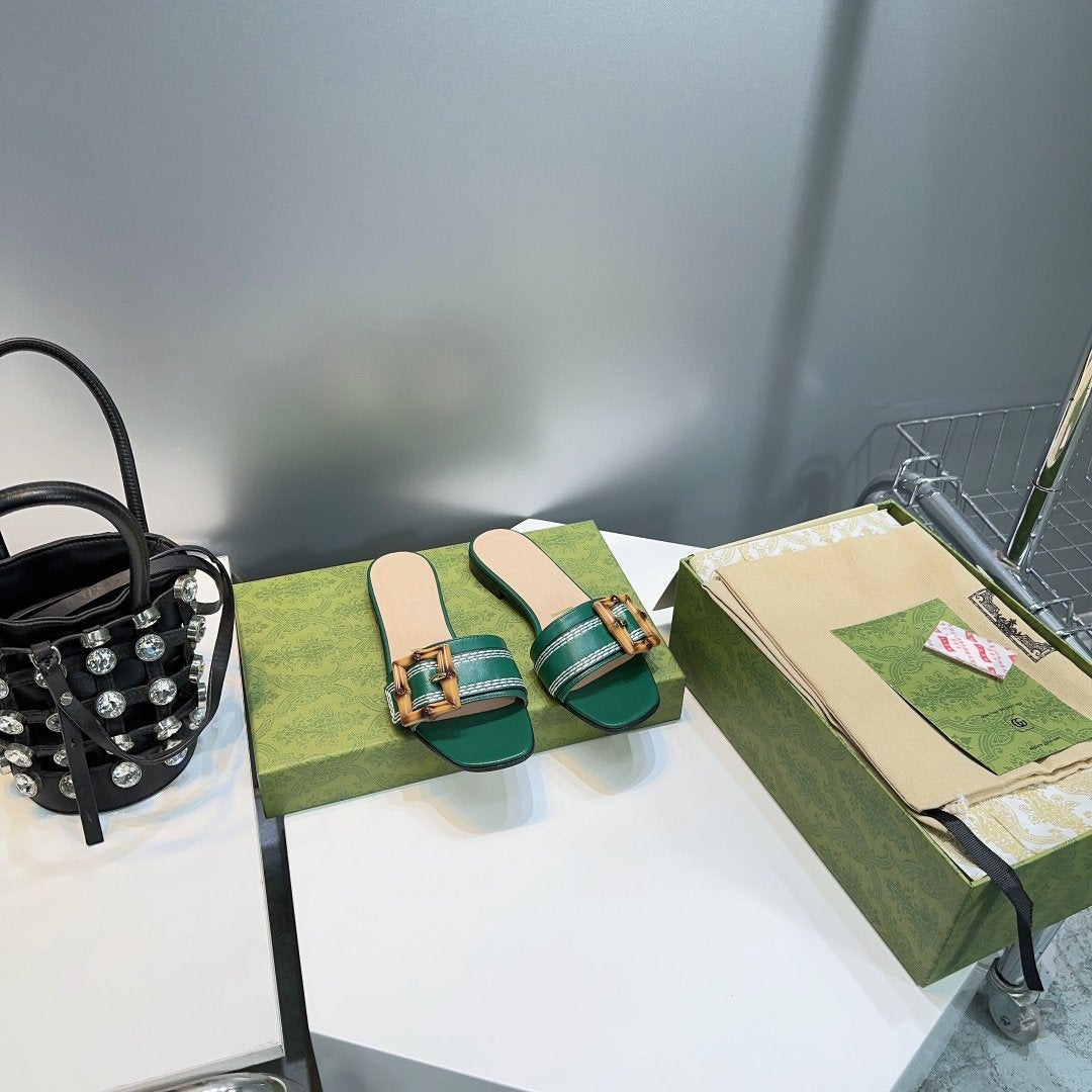 GG BAMBOO BUCKLE FLAT SANDALS GREEN