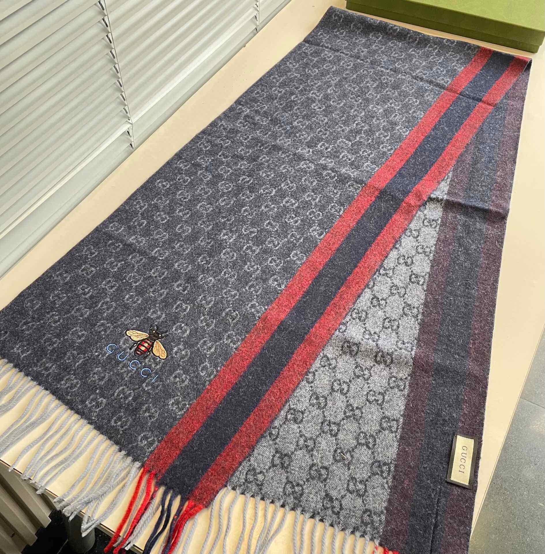 STRIPED SCARF 200 CM IN DARK GRAY CASHMERE WITH EMBROIDERED BEE 398533