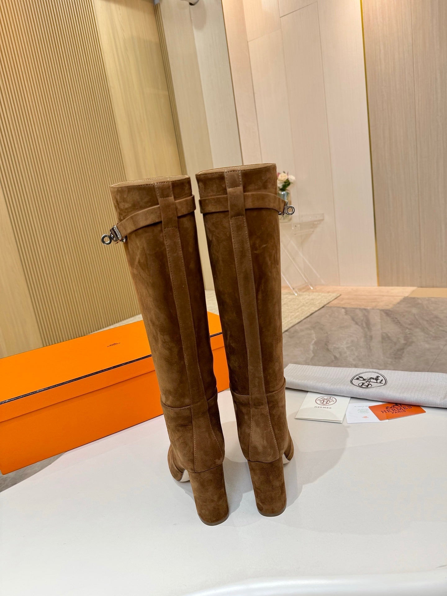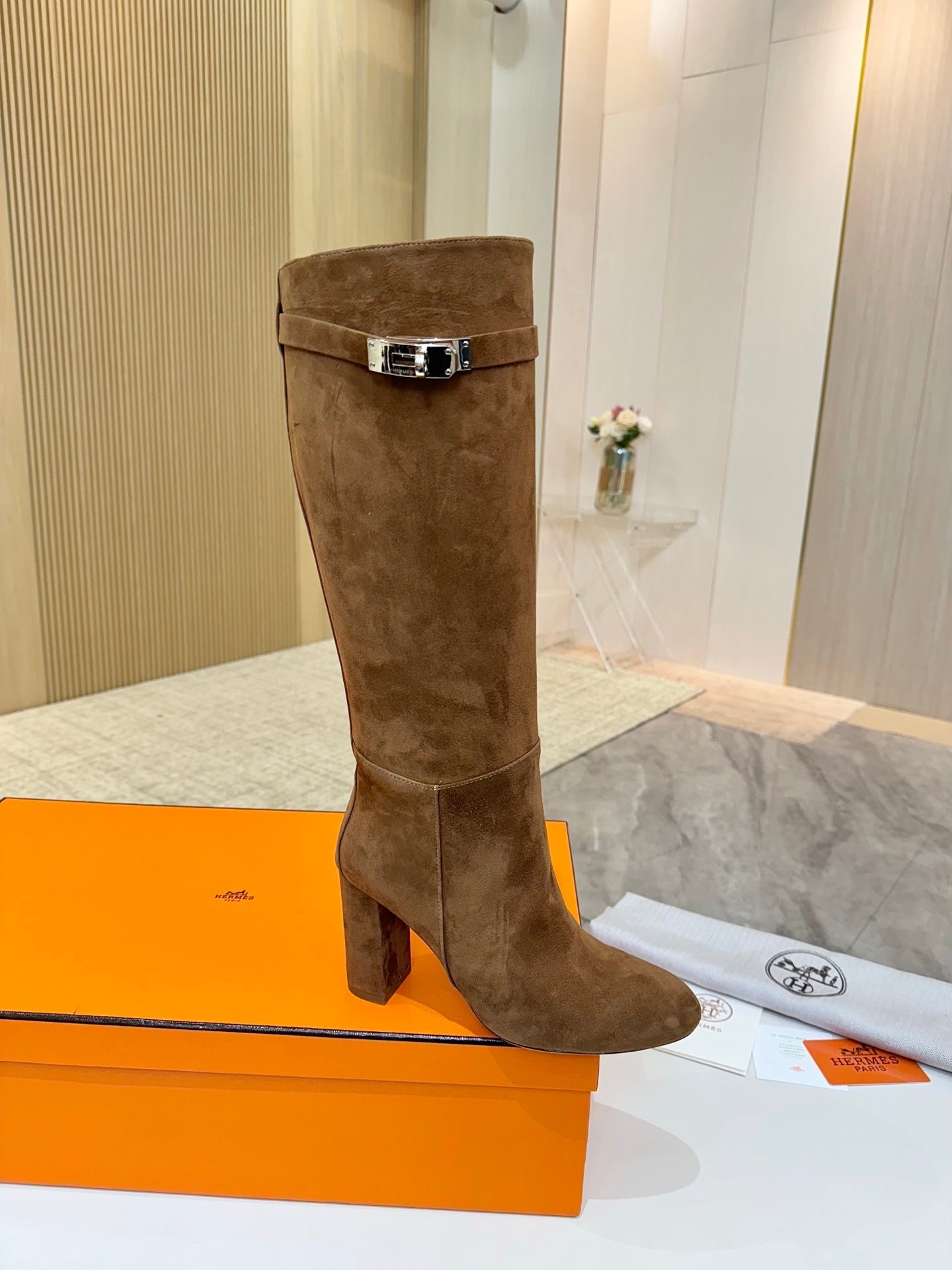 HM 25S KELLY KNEE-HIGH BOOTS IN BROWN SUEDE WITH SILVER HARDWARE