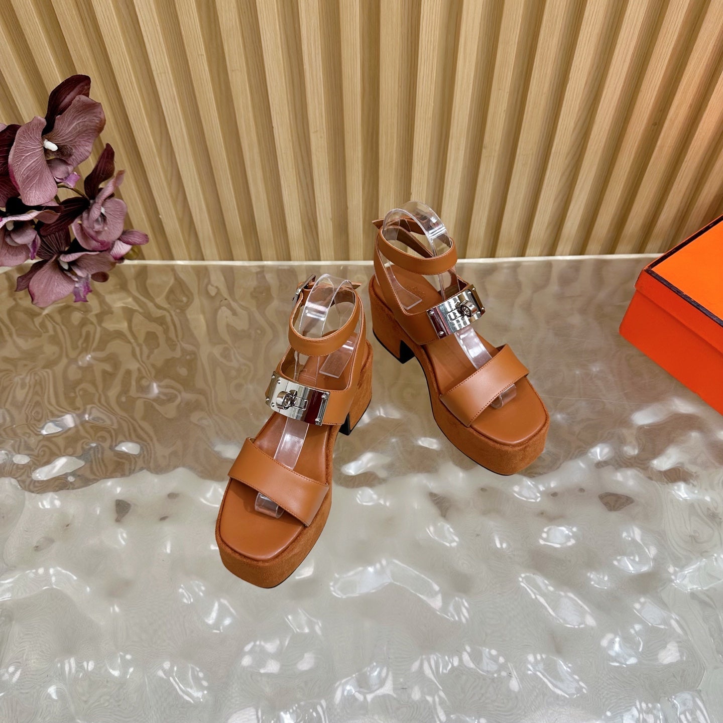 HM 25S CLASSIC WEDGE SANDALS 70 MM IN BROWN LAMBSKIN WITH SILVER HARDWARE